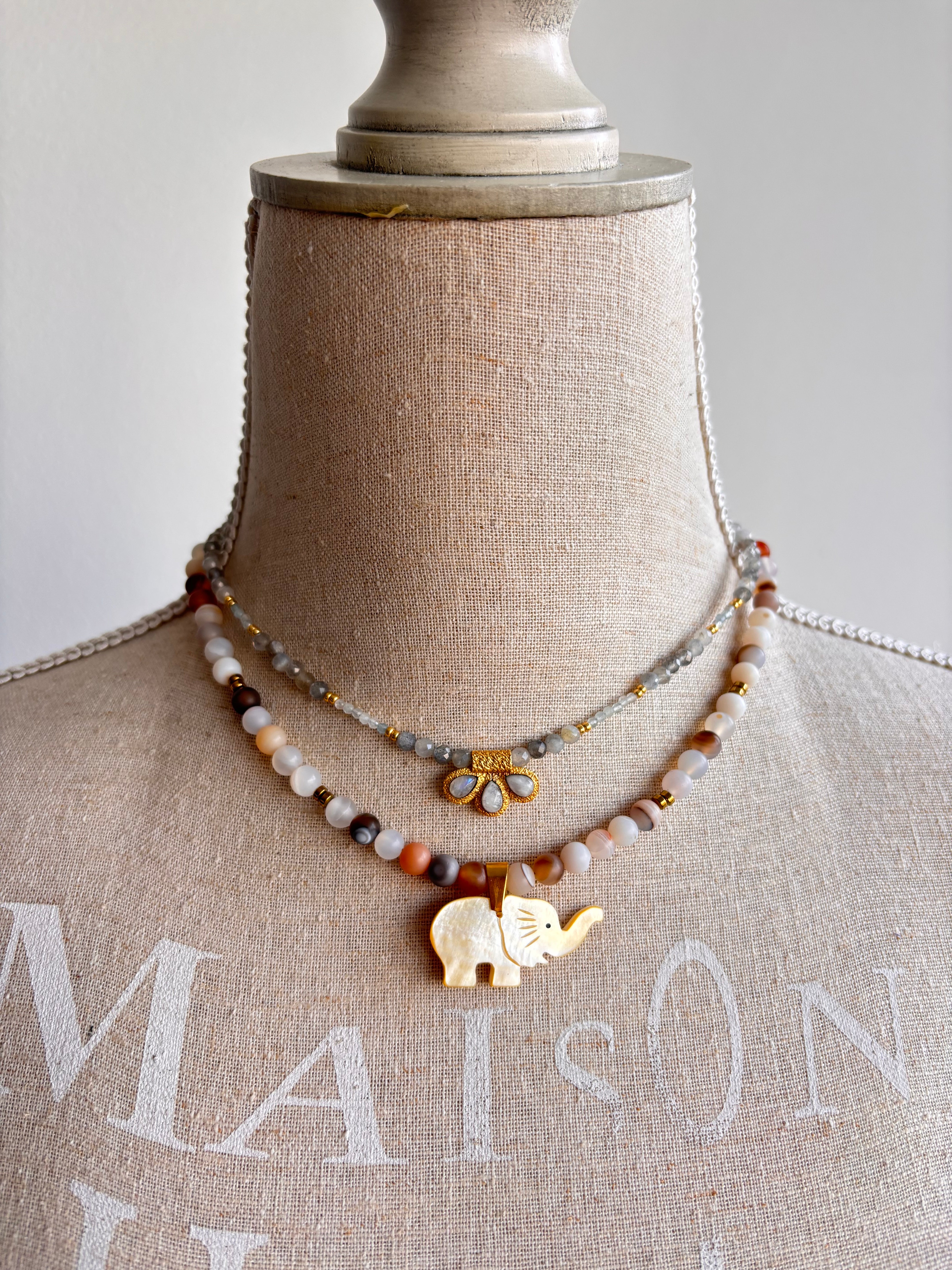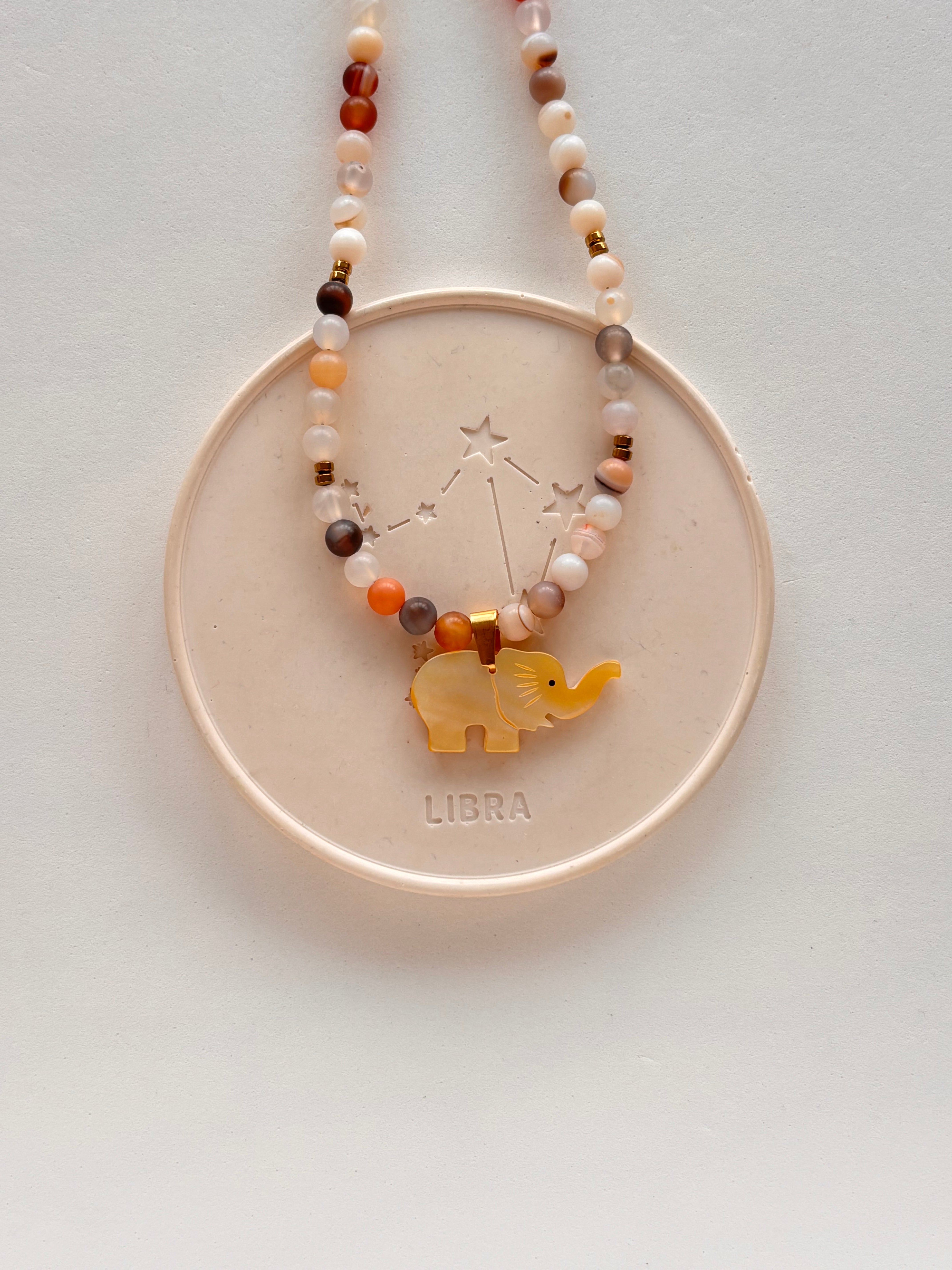 Perline di Agata sfumata sui toni caldi del caramello, cioccolato e cannella, arricchite da un elefantino in madreperla naturale, animale totem simbolo di saggezza e longevità.