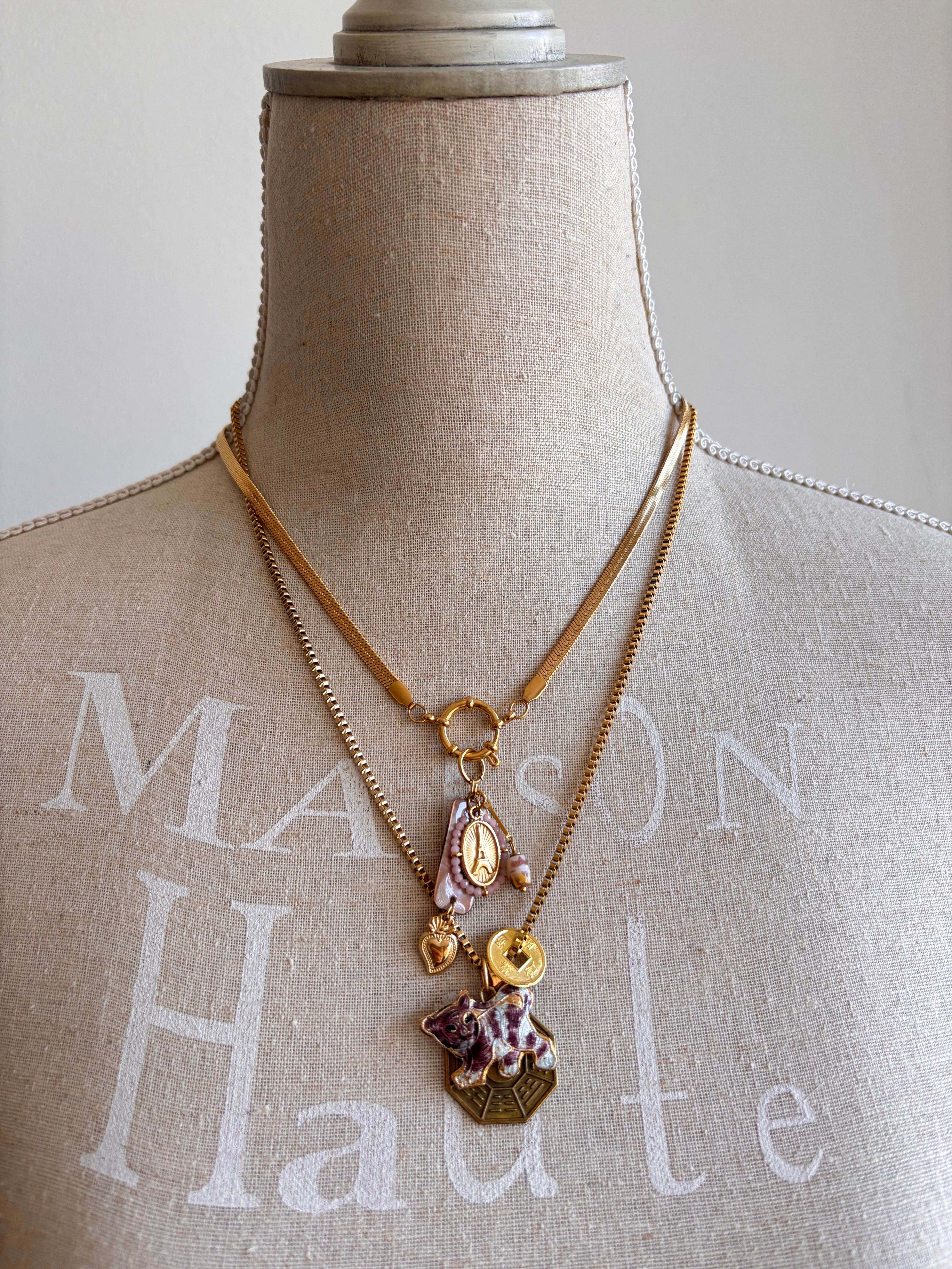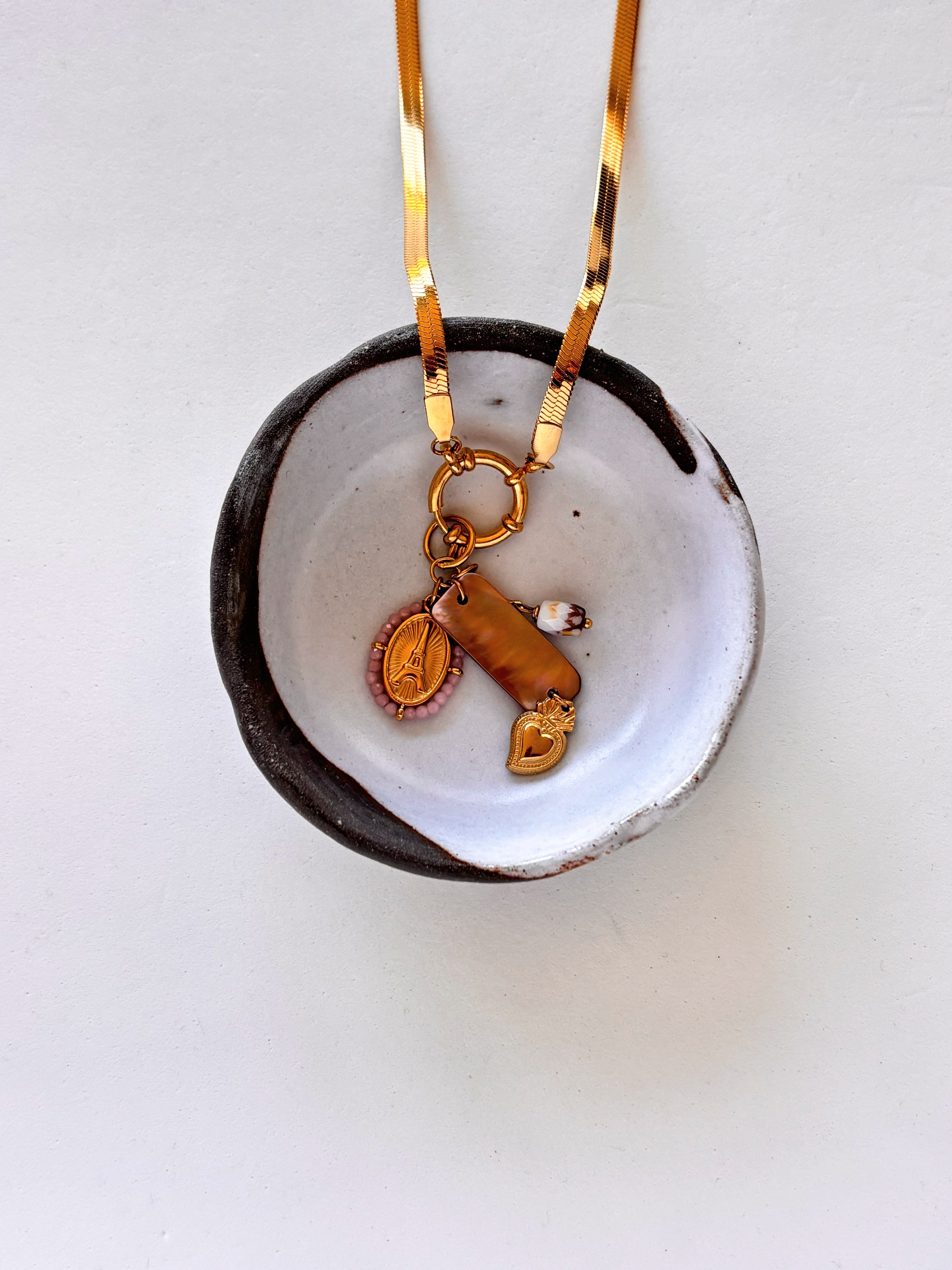 Collana Amuleto Monotono ispirata alle sfumature delicate del rosa antico, reso ancora più romantico dal ciondolo con Torre Eiffel, simbolo iconico di Parigi, medaglietta vintage in conchiglia e Cuore Sacro, talismano religioso legato alla rinascita.