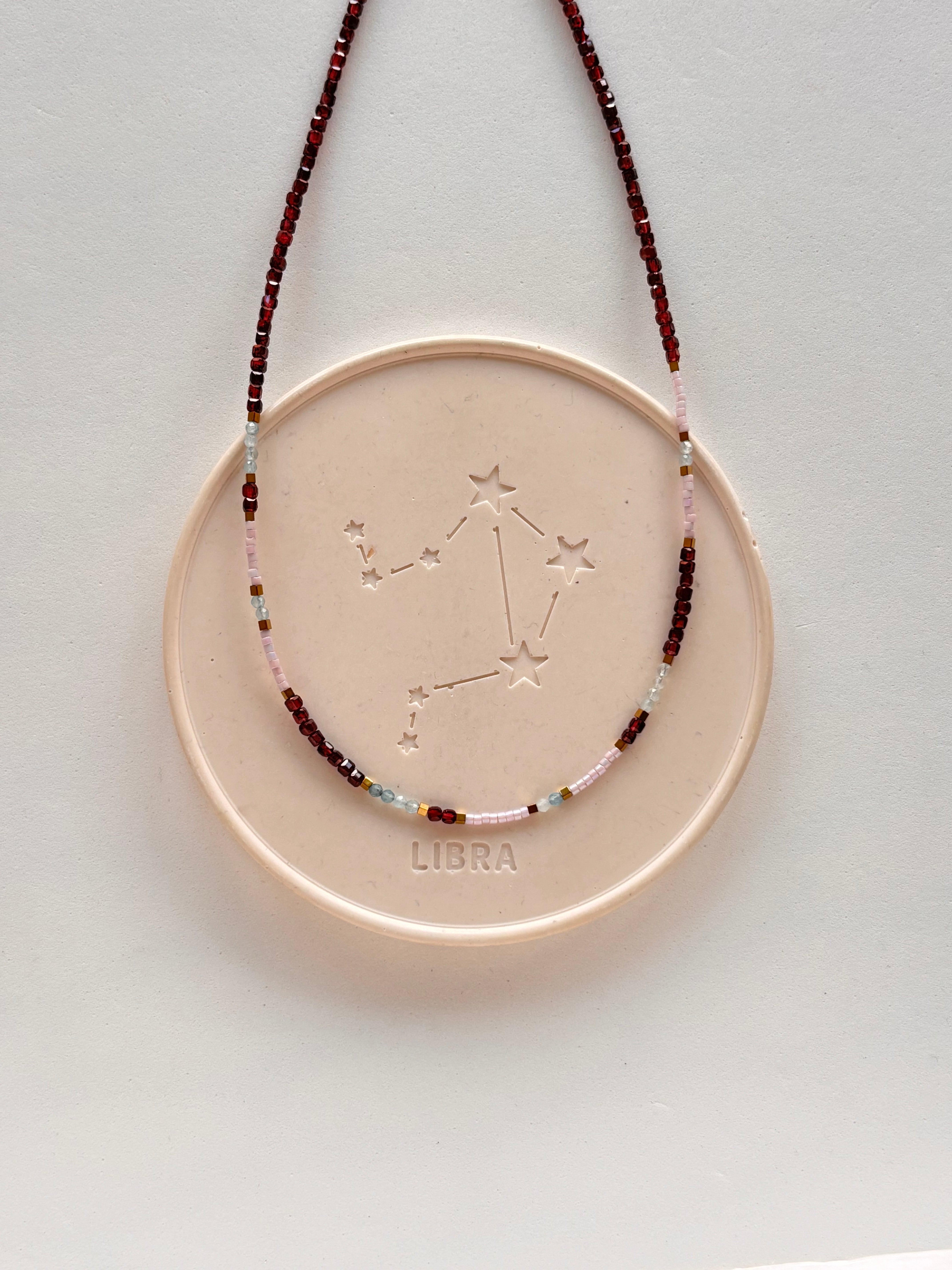 Realizzato mediante l’impiego di Rubini, Acquamarina e micro perline miyuki.