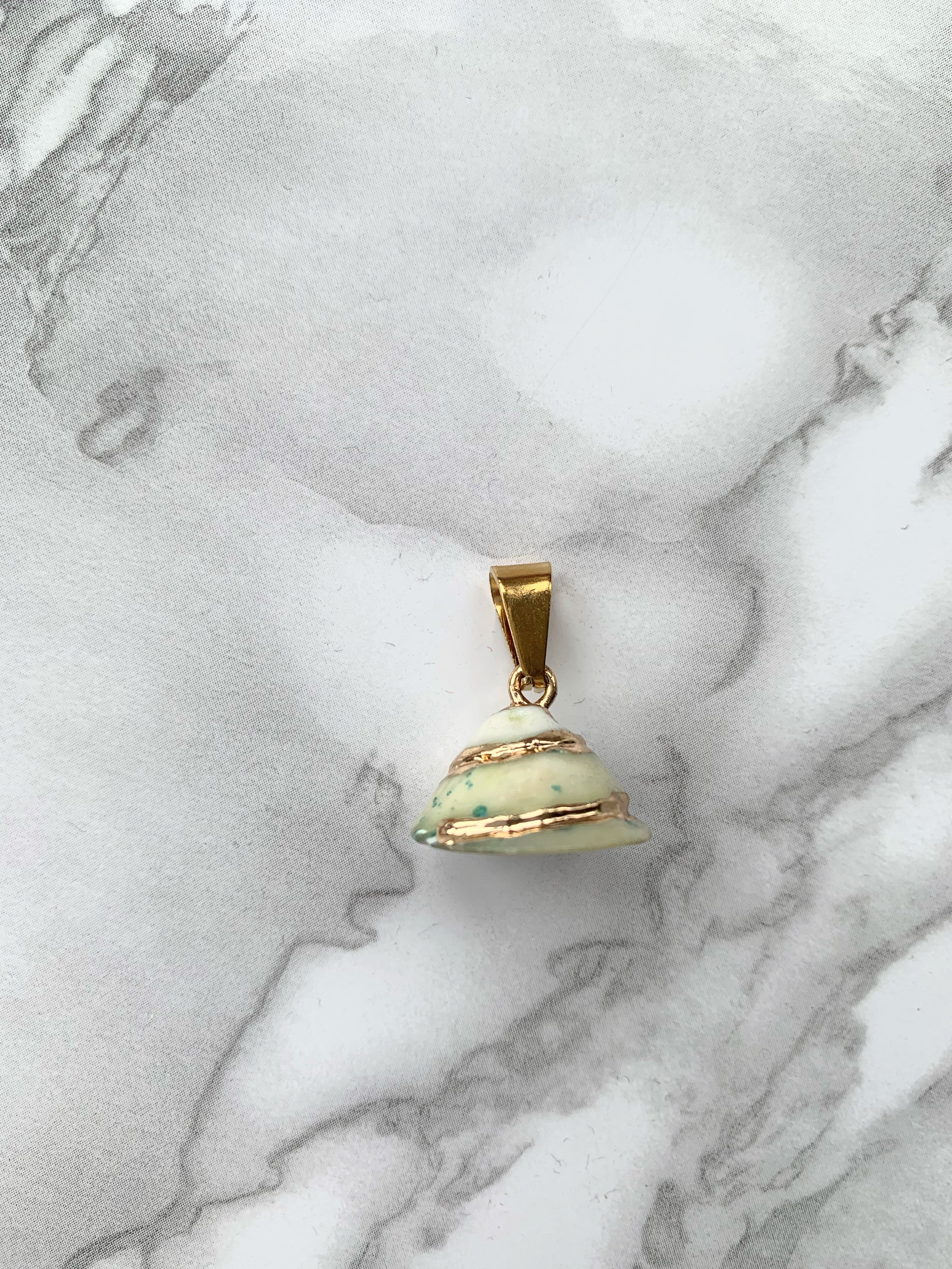Ciondolo in materiale naturale: conchiglietta lavorata con infiltrazione color oro ed anellino superiore in acciaio inossidabile tono su tono.