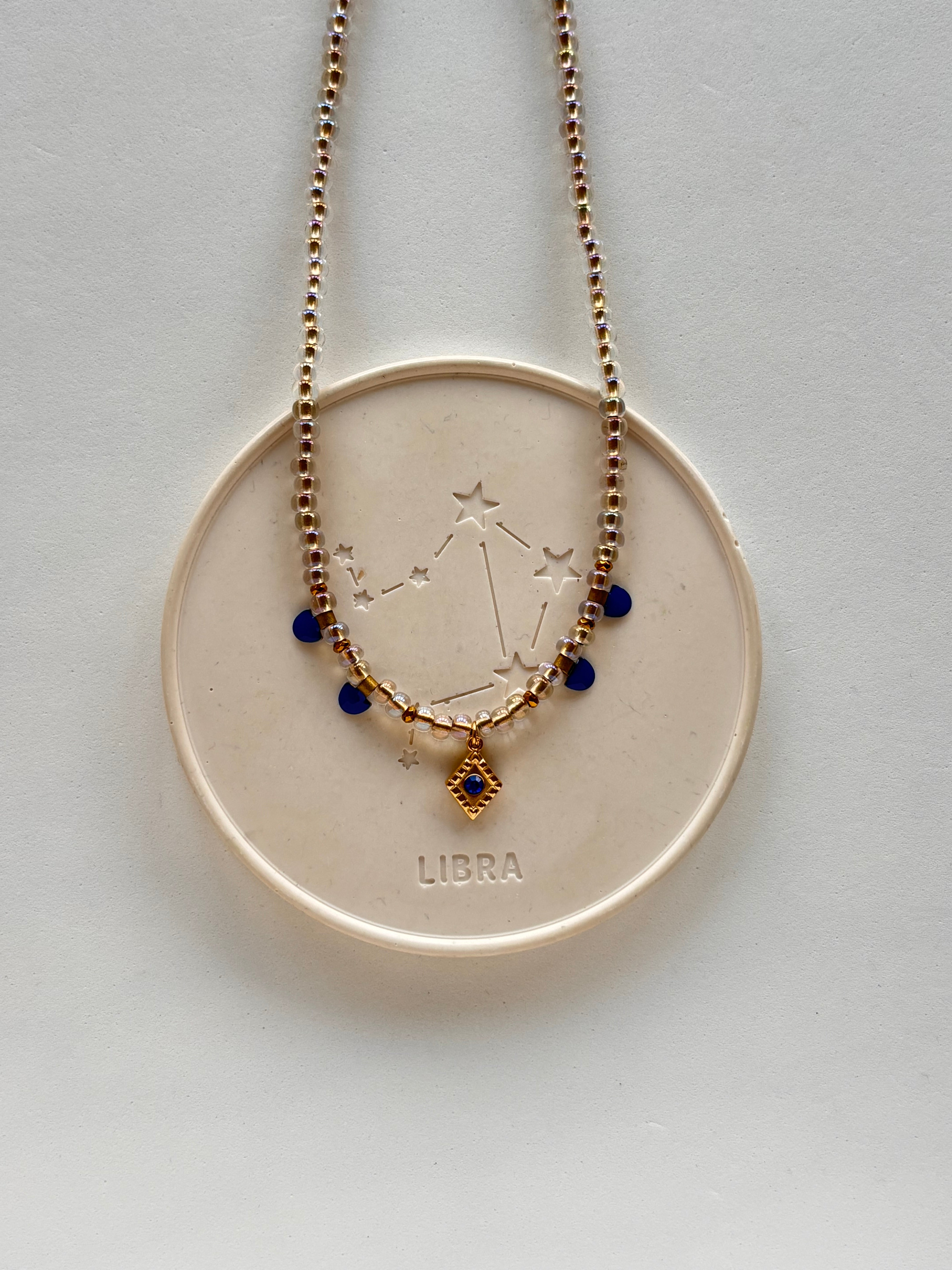 Un gioiello composto da perline dall’effetto olografico, abbinate a medagliette smaltate blu di Prussia, ripreso anche dallo zircone al centro del ciondolo lavorato.