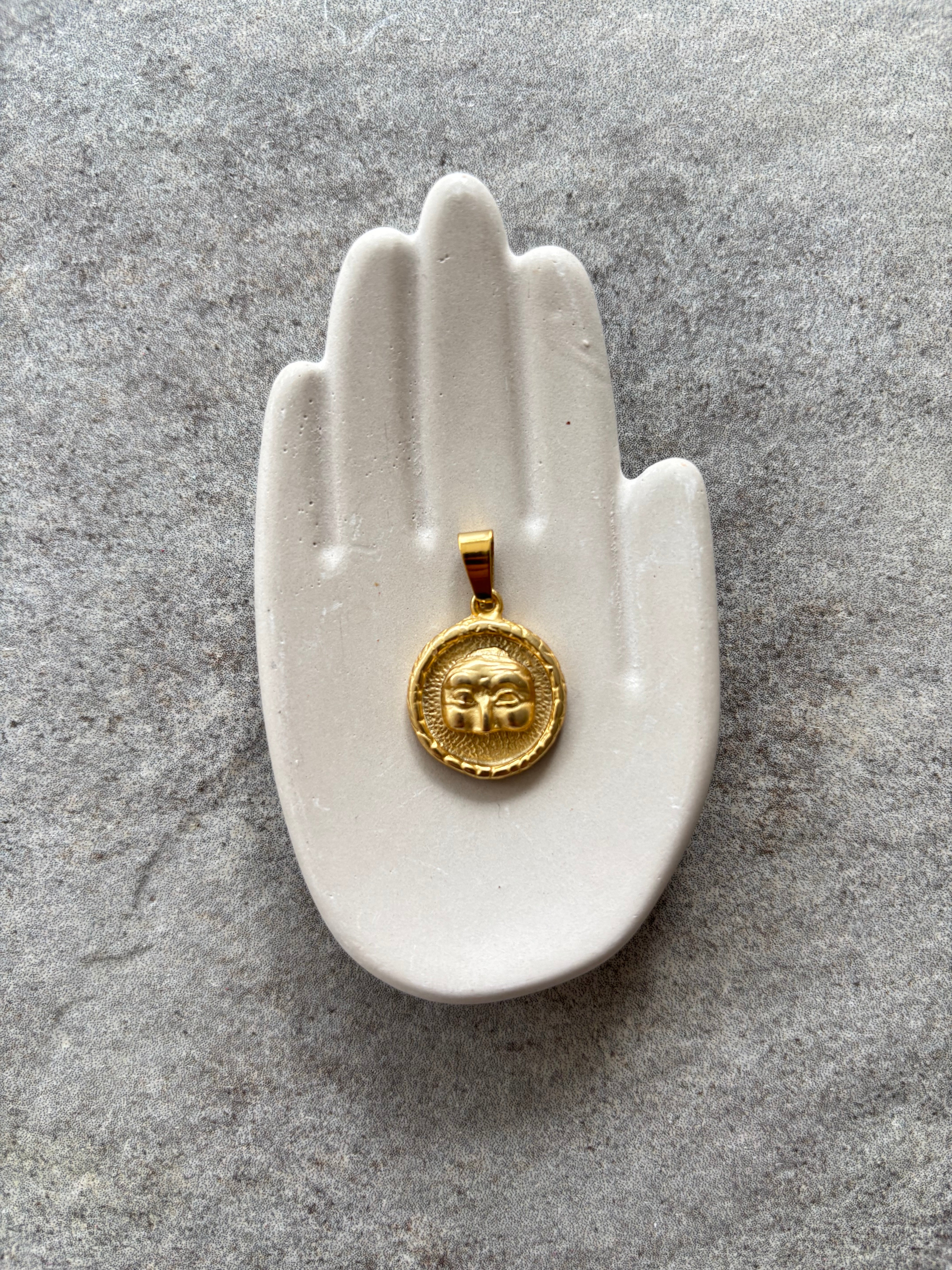 Medaglietta effetto anticato con maschera di Pulcinella, classico simbolo teatrale, rappresentante il popolo napoletano, in tutta la sua sfrontatezza e voracità.