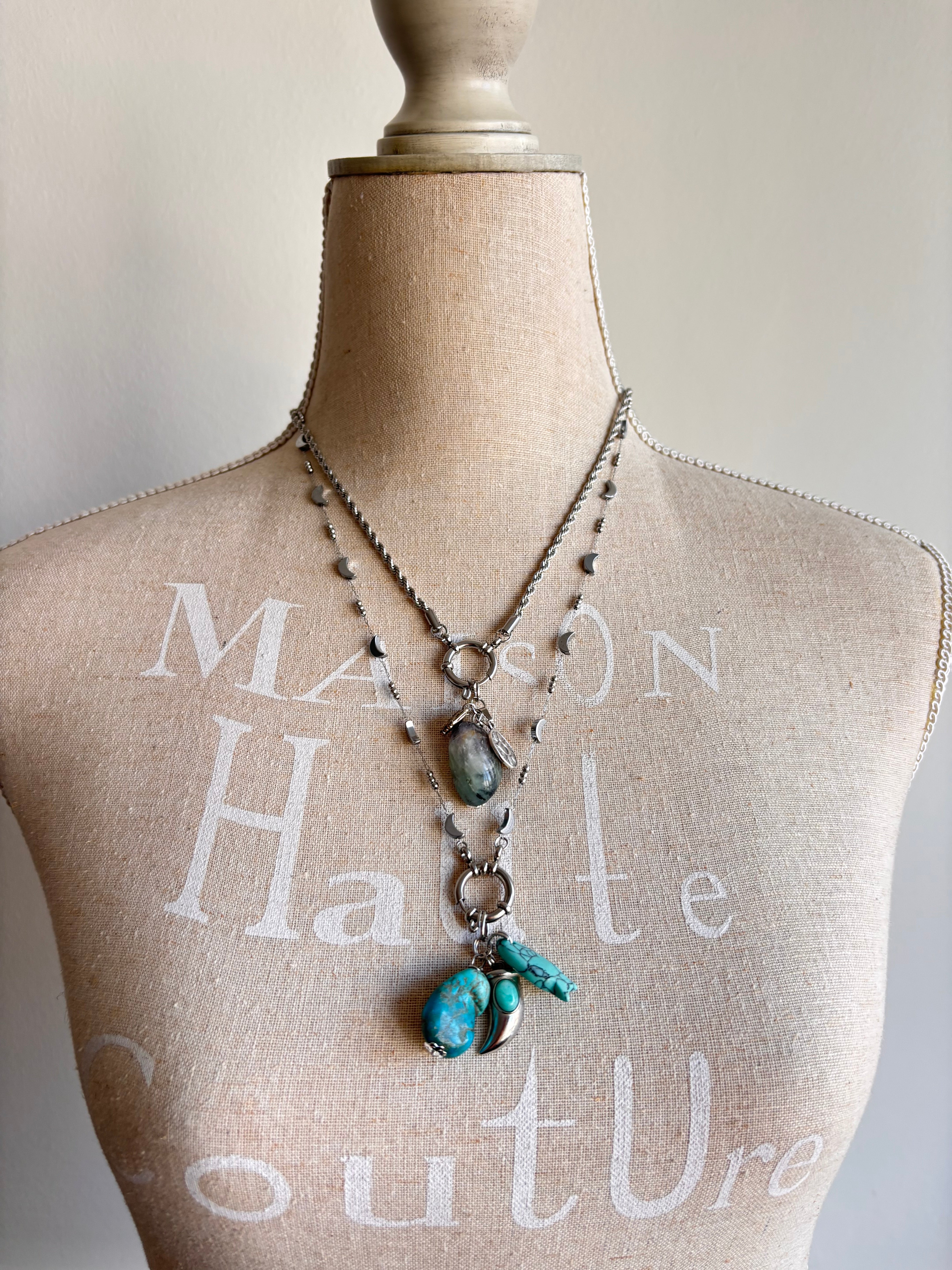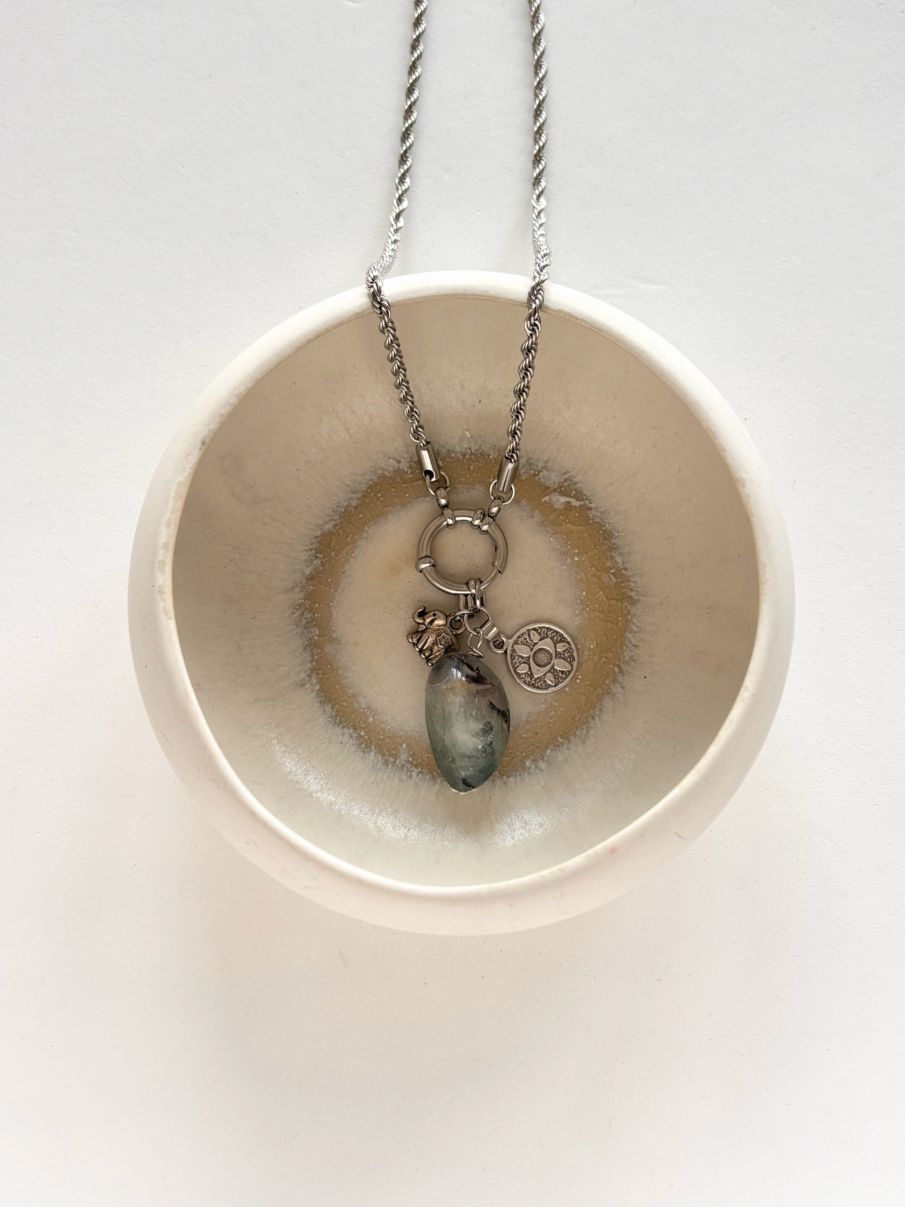 Collana Amuleto Monotono, nella quale la Fluorite è la protagonista: pietra dura naturale dalle sfumature fresche, tra il viola intenso è il verde acqua, conosciuta per le sue proprietà legate alla purificazione e all’equilibrio emotivo, associata ad un piccolo elefantino simbolo di longevità e ad una medaglietta con occhio greco portafortuna.