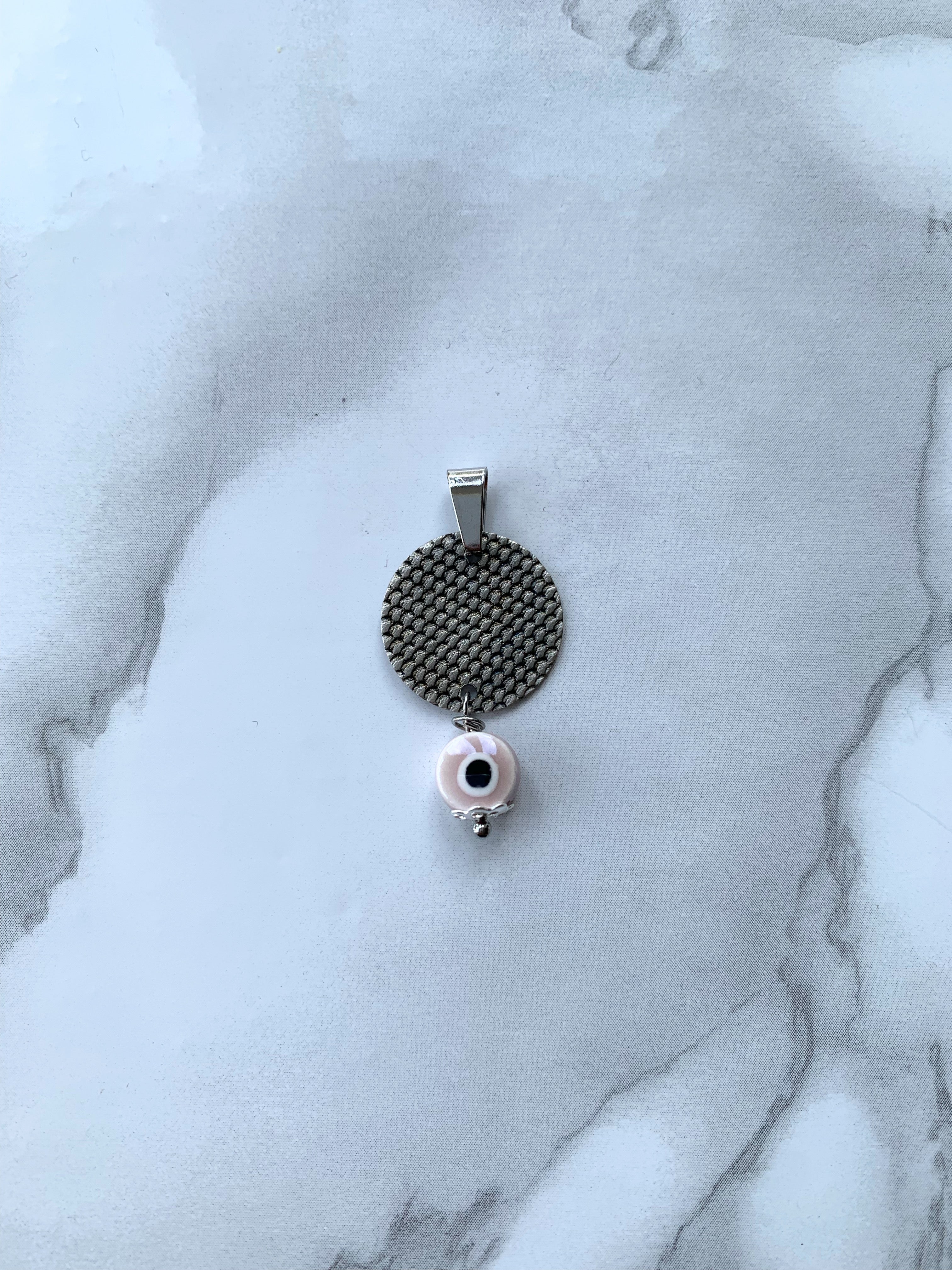 Charm di provenienza vintage, composto da moneta zigrinata in acciaio ed Occhio Greco in ceramica smaltata.
