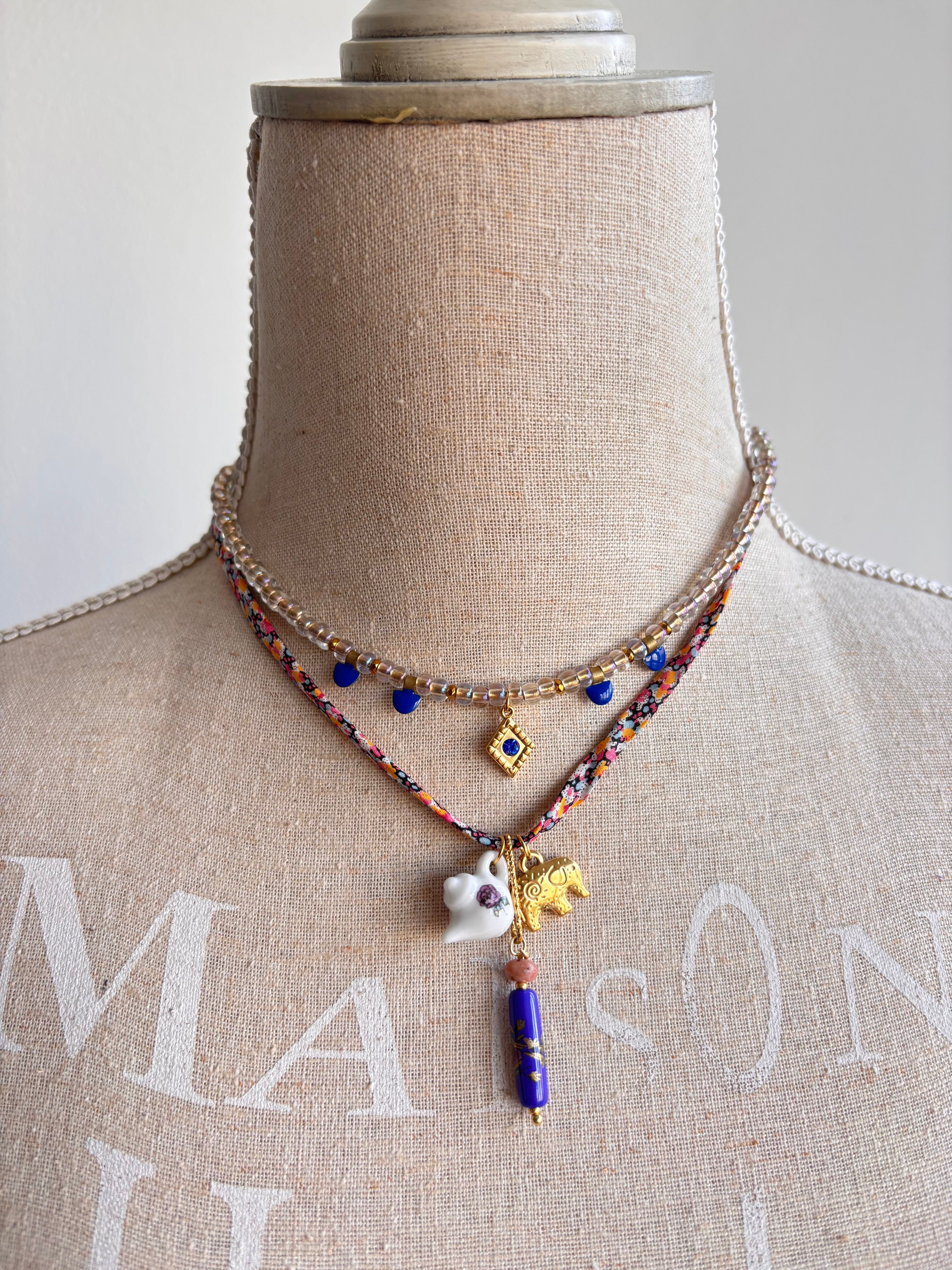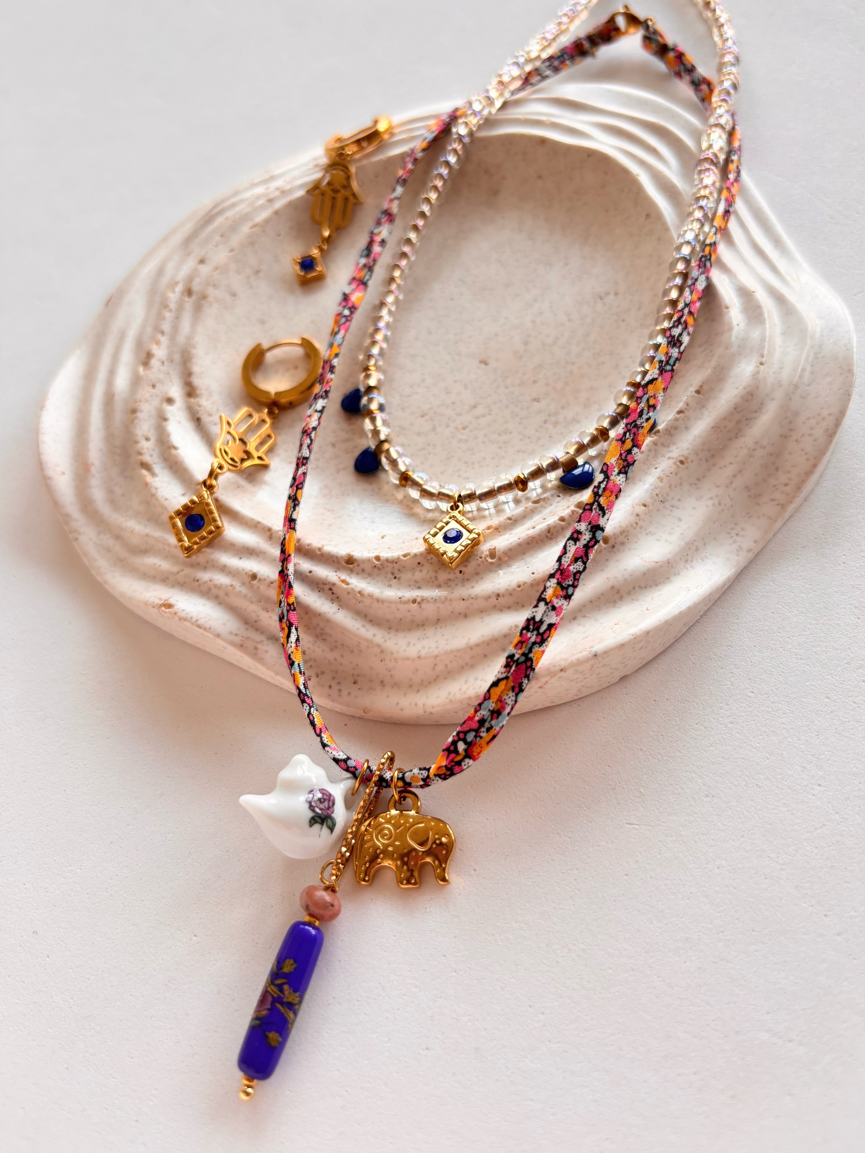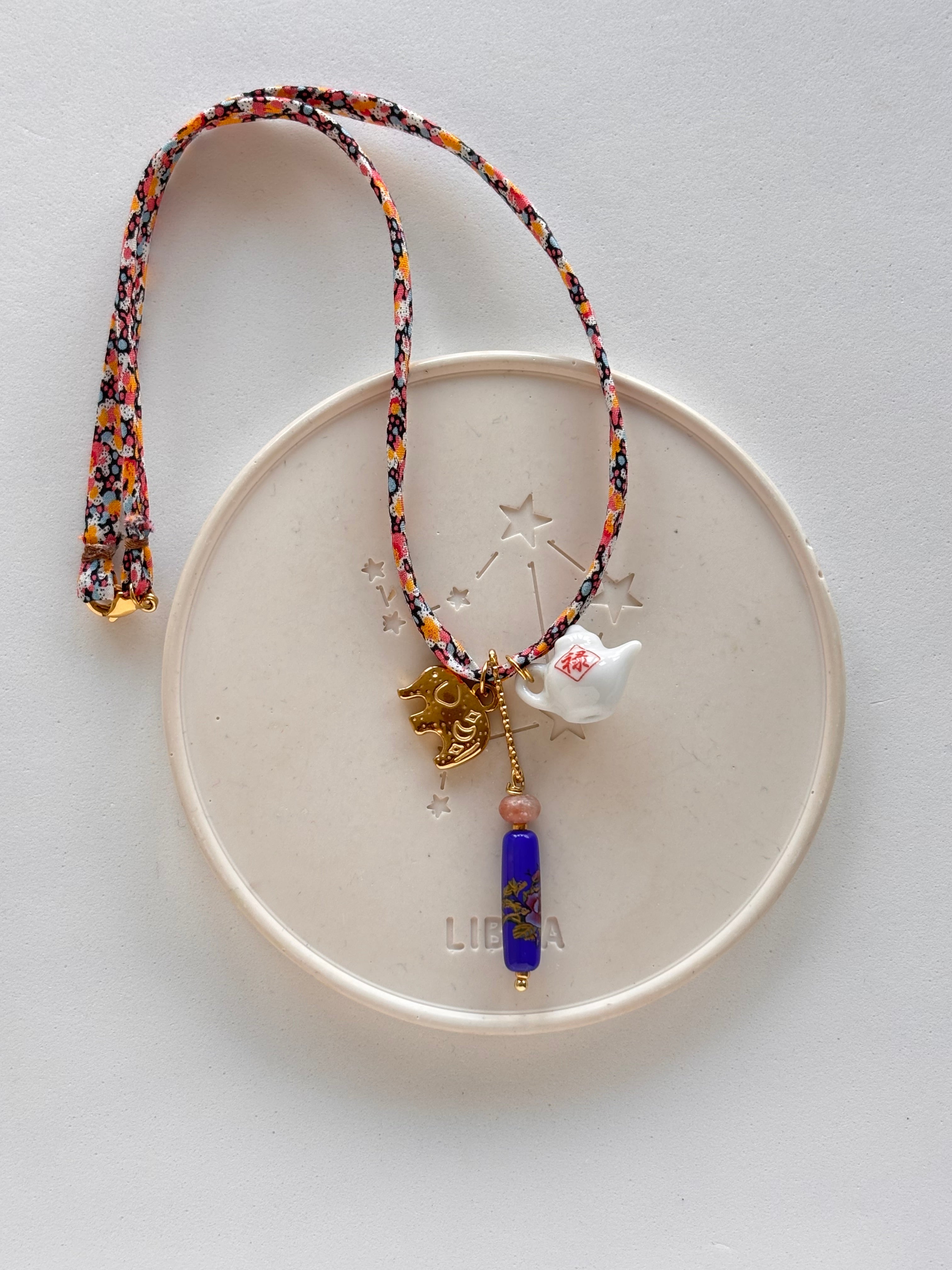 Un gioiello dalle vibrazioni bohemien, realizzato mediante un nastrino in cotone stampa liberty, un elefantino simbolo di longevità e saggezza, una perlina dal motivo floreale ed una piccola teiera in ceramica.