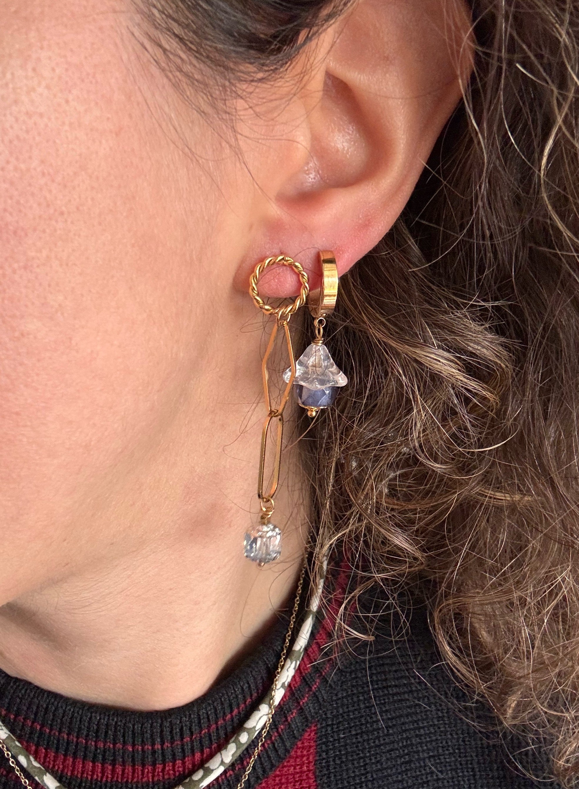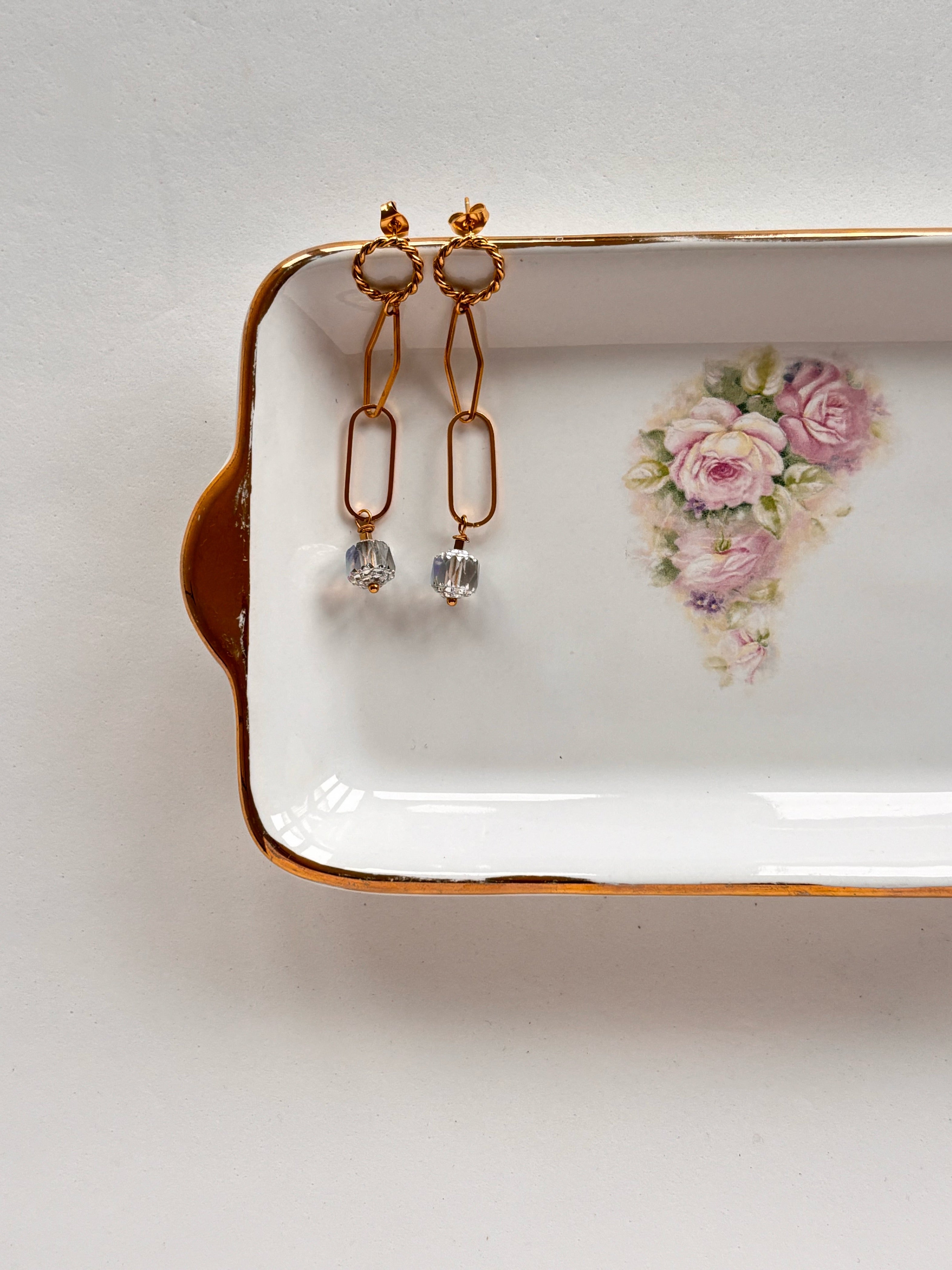 Paiono leggeri come una nube, questi orecchini dal design chandelier, realizzati totalmente in acciaio inossidabile color oro, arricchiti da una perlina in vetro sfaccettata sul fondo, in grado di farti risplendere come non mai.