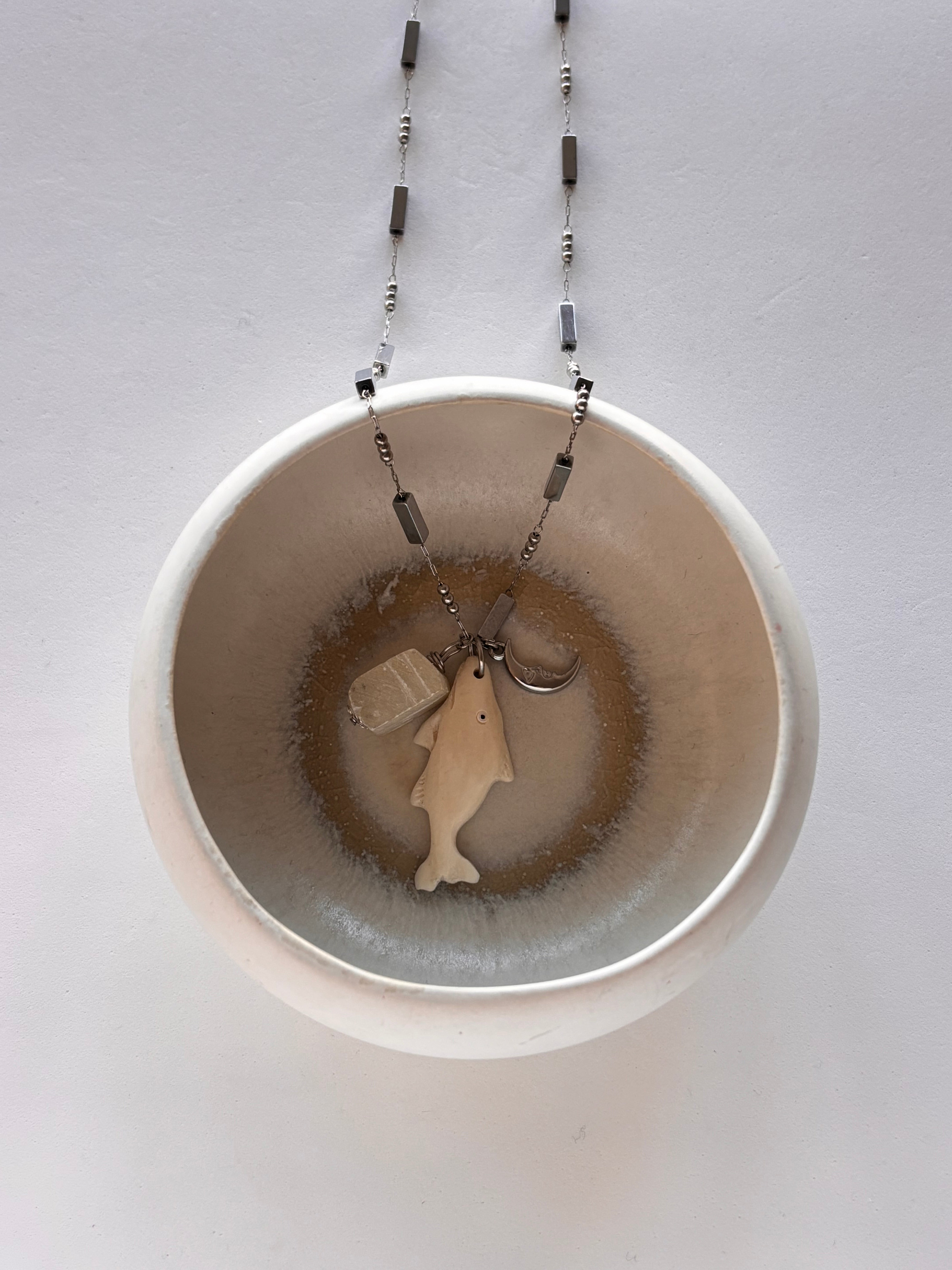 Una piccola balenottera in materiale effetto osso, un dettaglio in Pietra Saponaria, simbolo di calma e purezza, accostati ad una mezza luna sorridente, compongono una collana unica, resa ancora più speciale dalla maglia geometrica in acciaio inossidabile color argento.