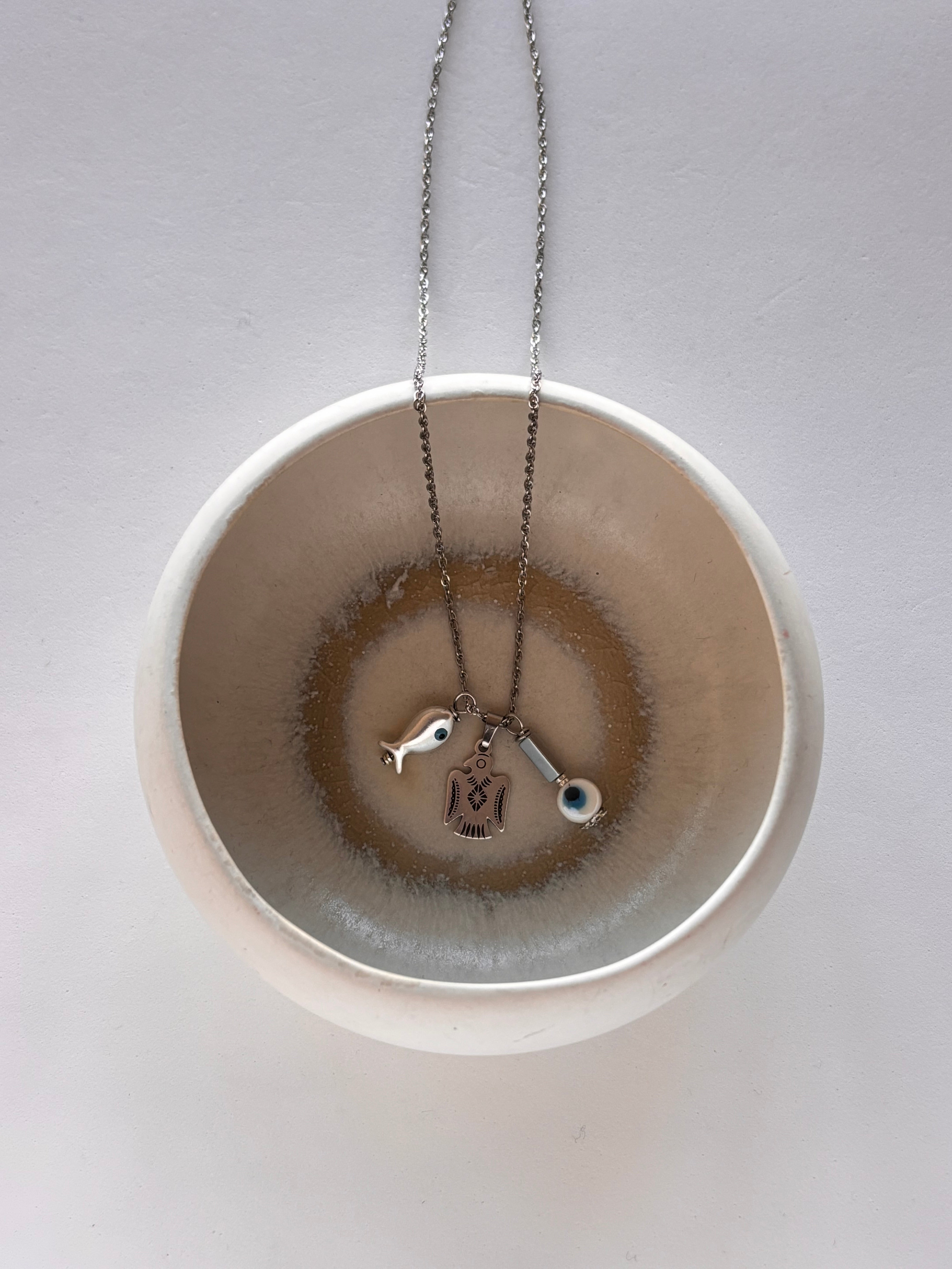 Un gioiello dalle linee essenziali, reso speciale grazie alla presenza dell’Occhio Greco, portatore di fortuna, e all’aquila, animale totem legato alla potenza e alla libertà.