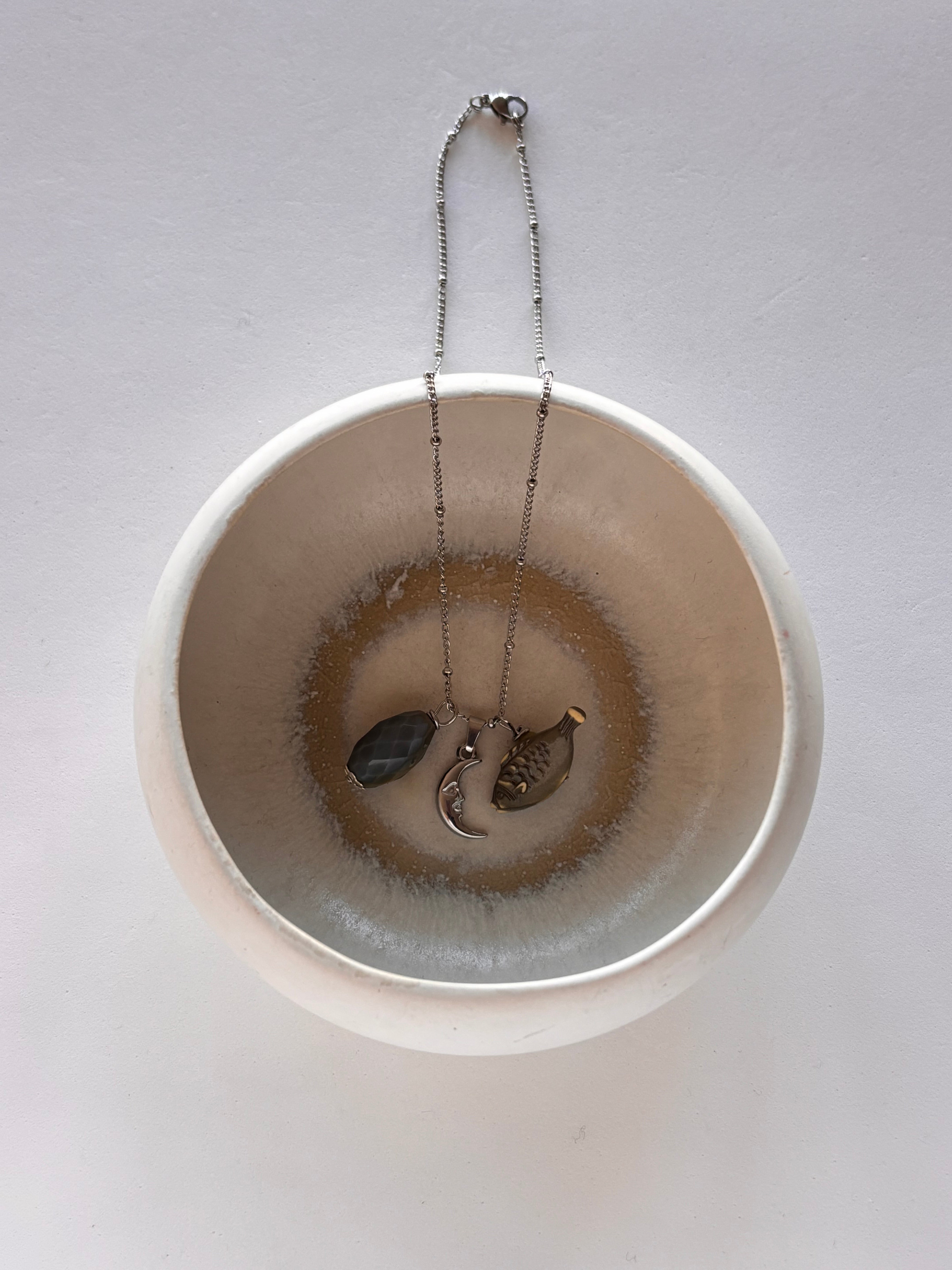 Un piccolo charm pesce palla che in un’altra vita era un gemello da polso: ecco come nasce TAYLOR, da storie di dettagli rivisitati, accompagnati da ciondoli che ne riprendono i colori e resi un pò più mistici grazie a simboli quali una mezza luna sorridente.