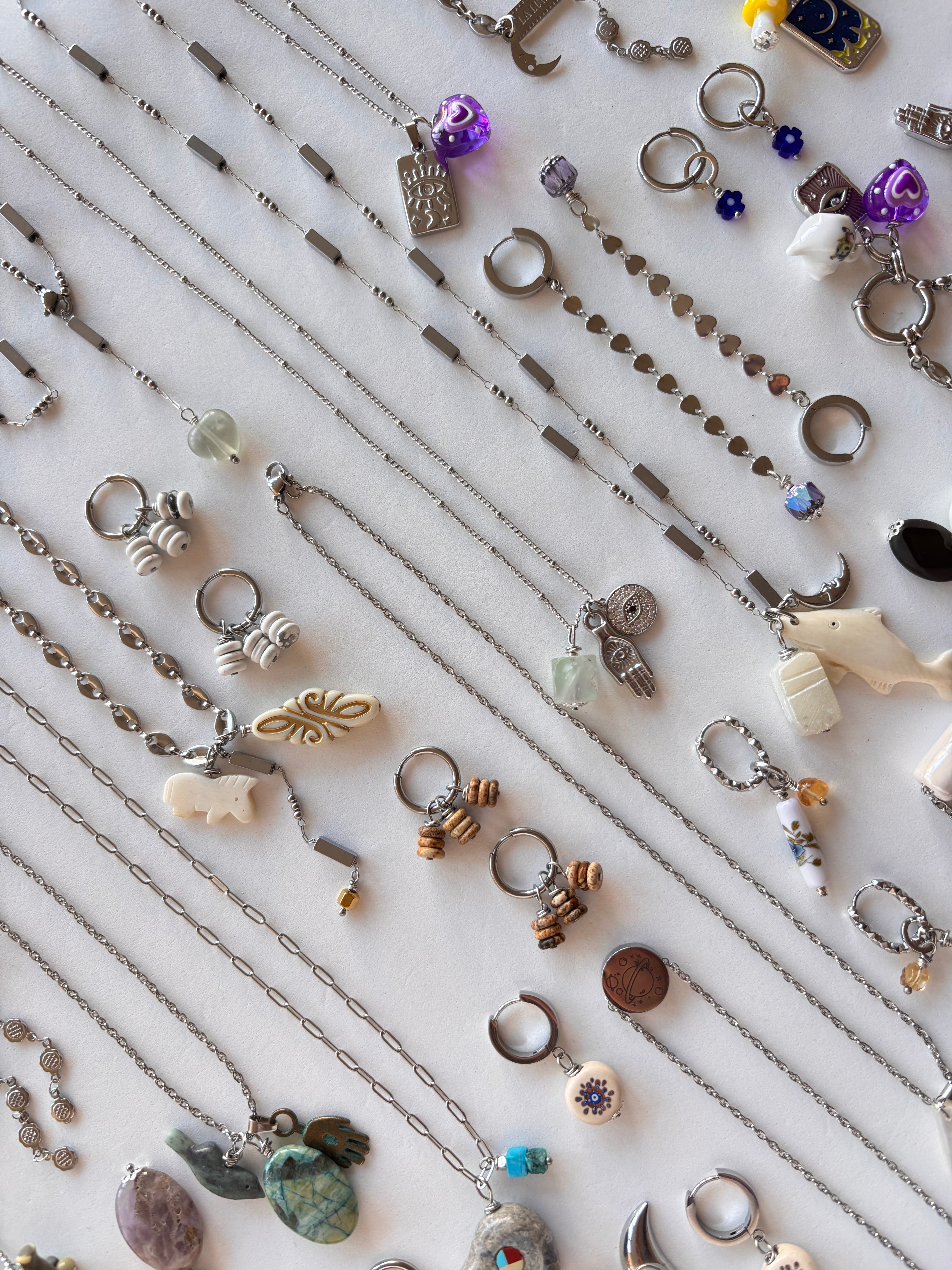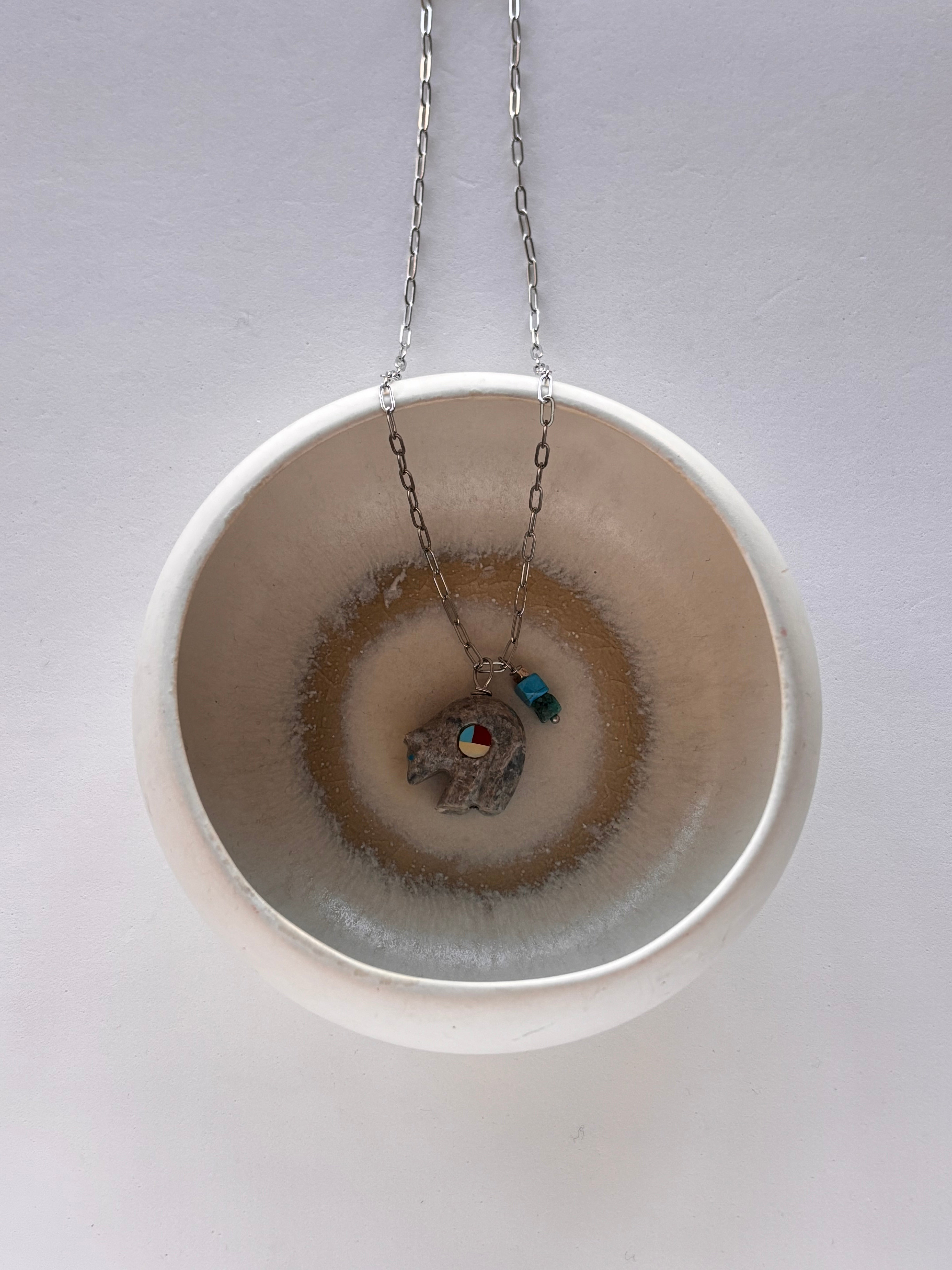 Un piccolo orso rannicchiato su se stesso, quasi si stesse accoccolando dolcemente, realizzato in pietra dura e ripreso dai colori del charm accanto, su catenina in acciaio inossidabile color argento.