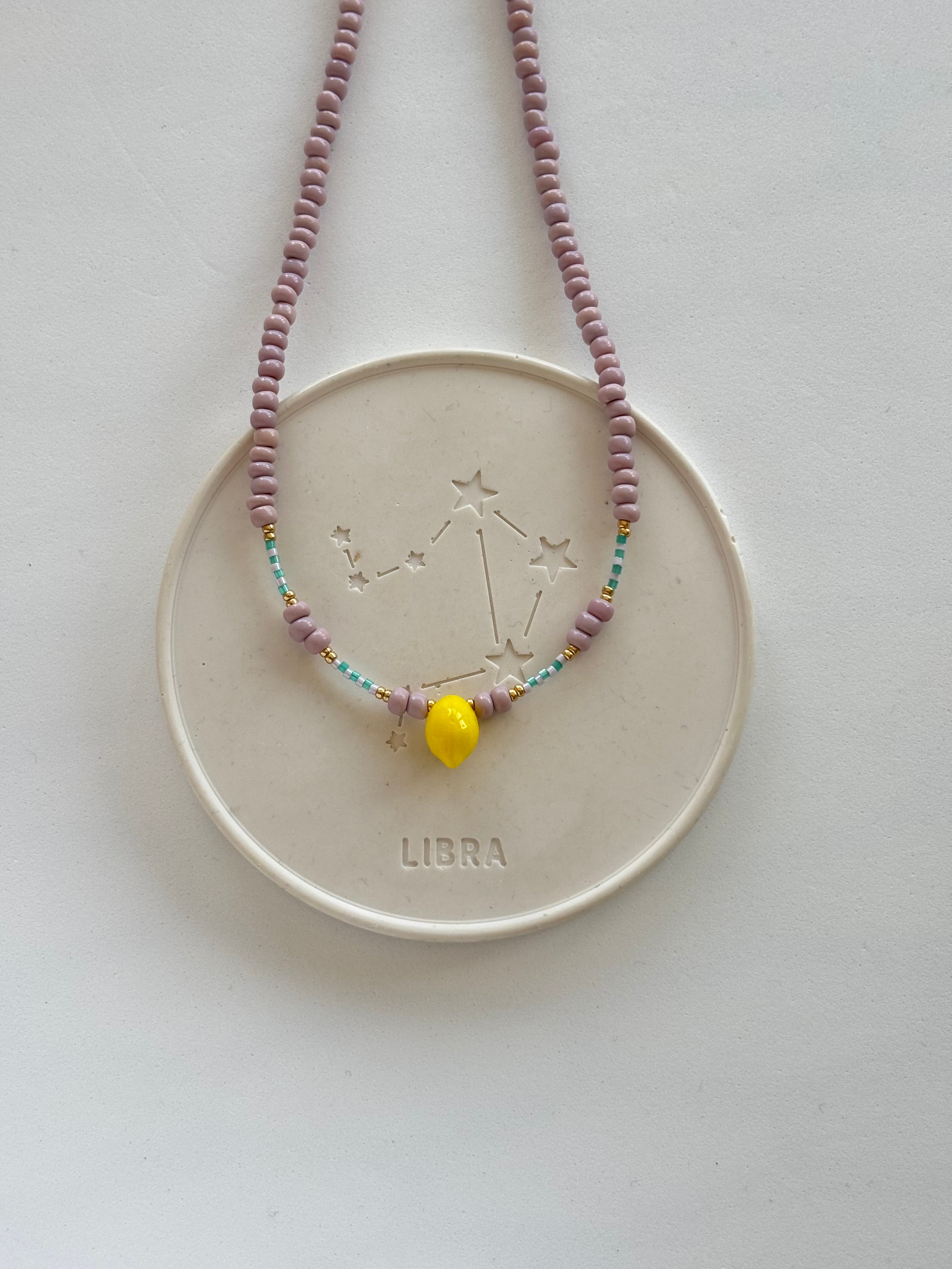 Una collana spiritosa perfetta per il mare, composta da perline in vetro, perline giapponesi e un piccolo limone al centro.