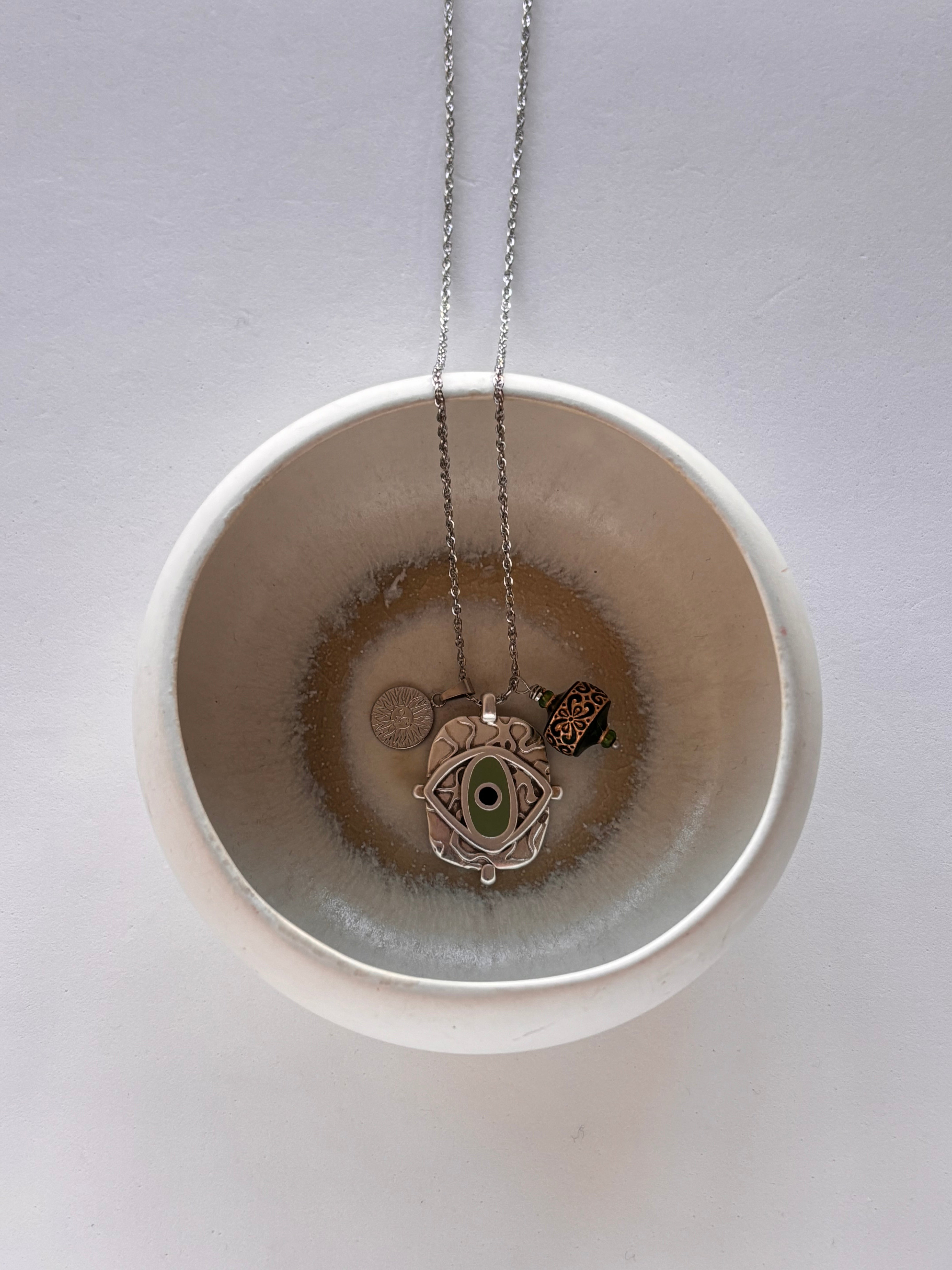 Una collana dalla lunghezza importante, così come il medaglione al centro, con Occhio Greco smaltato in toni pastello, arricchito da un charm con sole splendente e pepita in plexy zigrinato.
