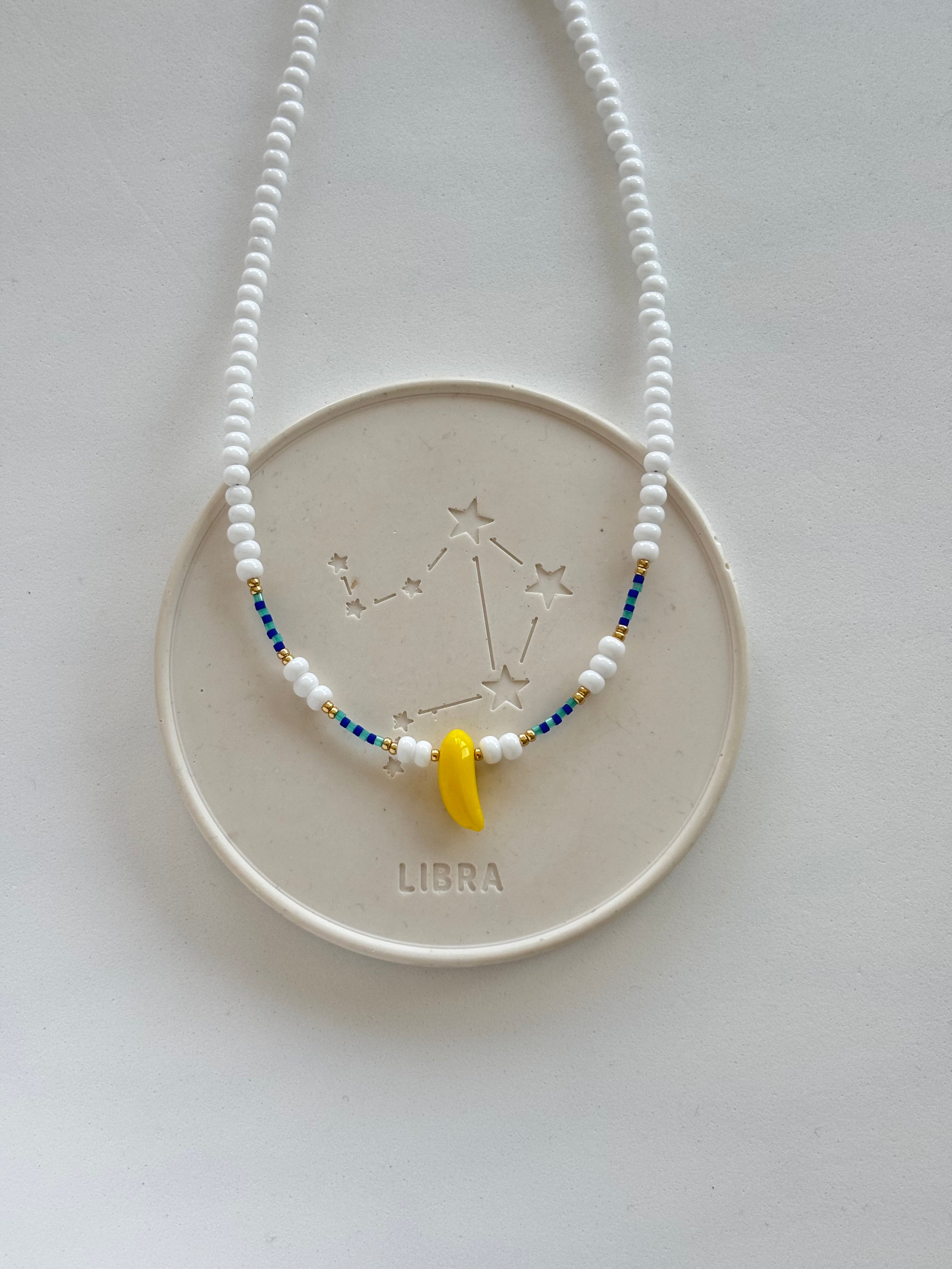 Una collana spiritosa perfetta per il mare, composta da perline in vetro, perline giapponesi e una piccola banana al centro.