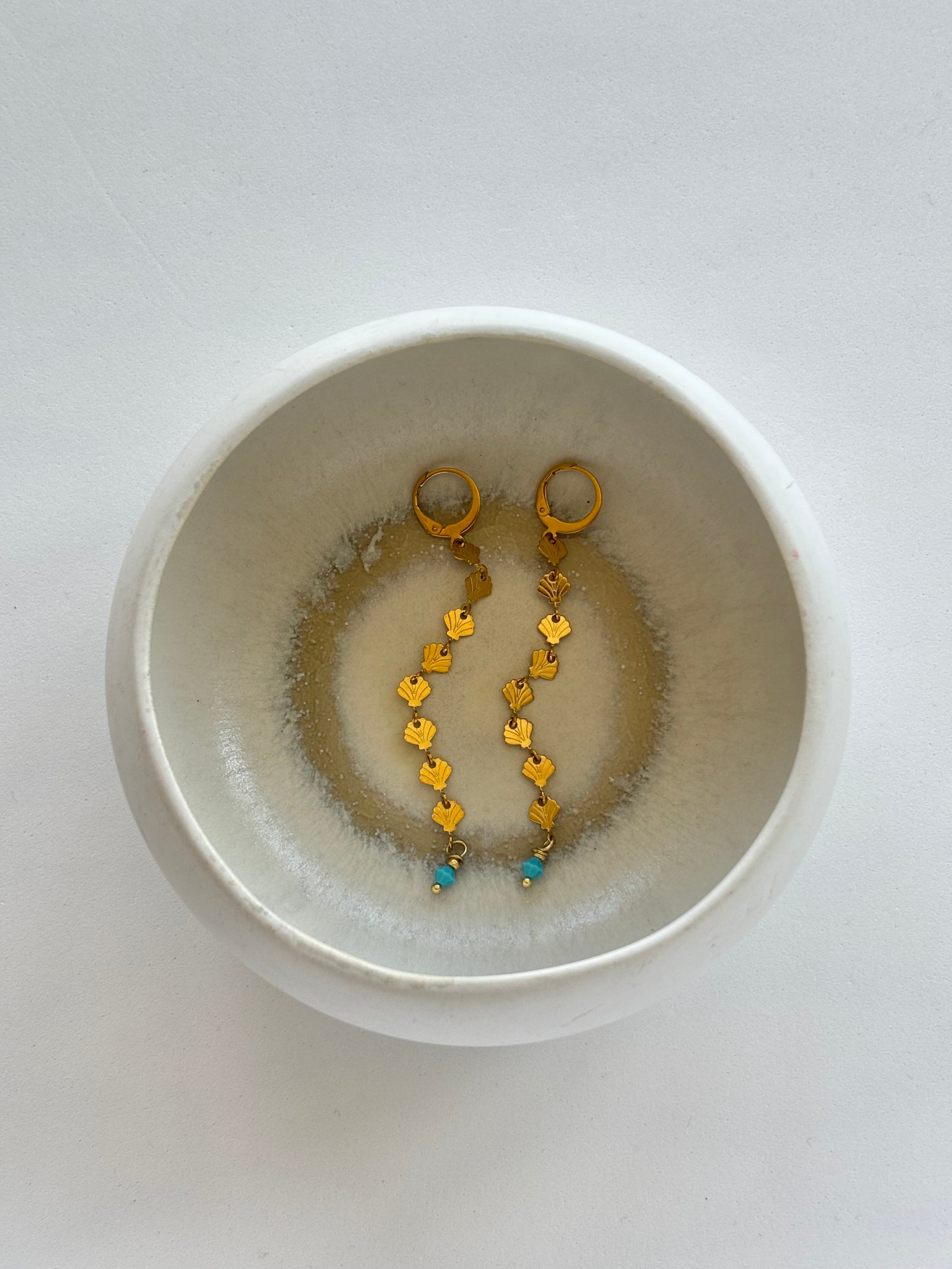 Piccole conchigliette si susseguono armoniose, accompagnate da cristalli Swarovski turchesi.