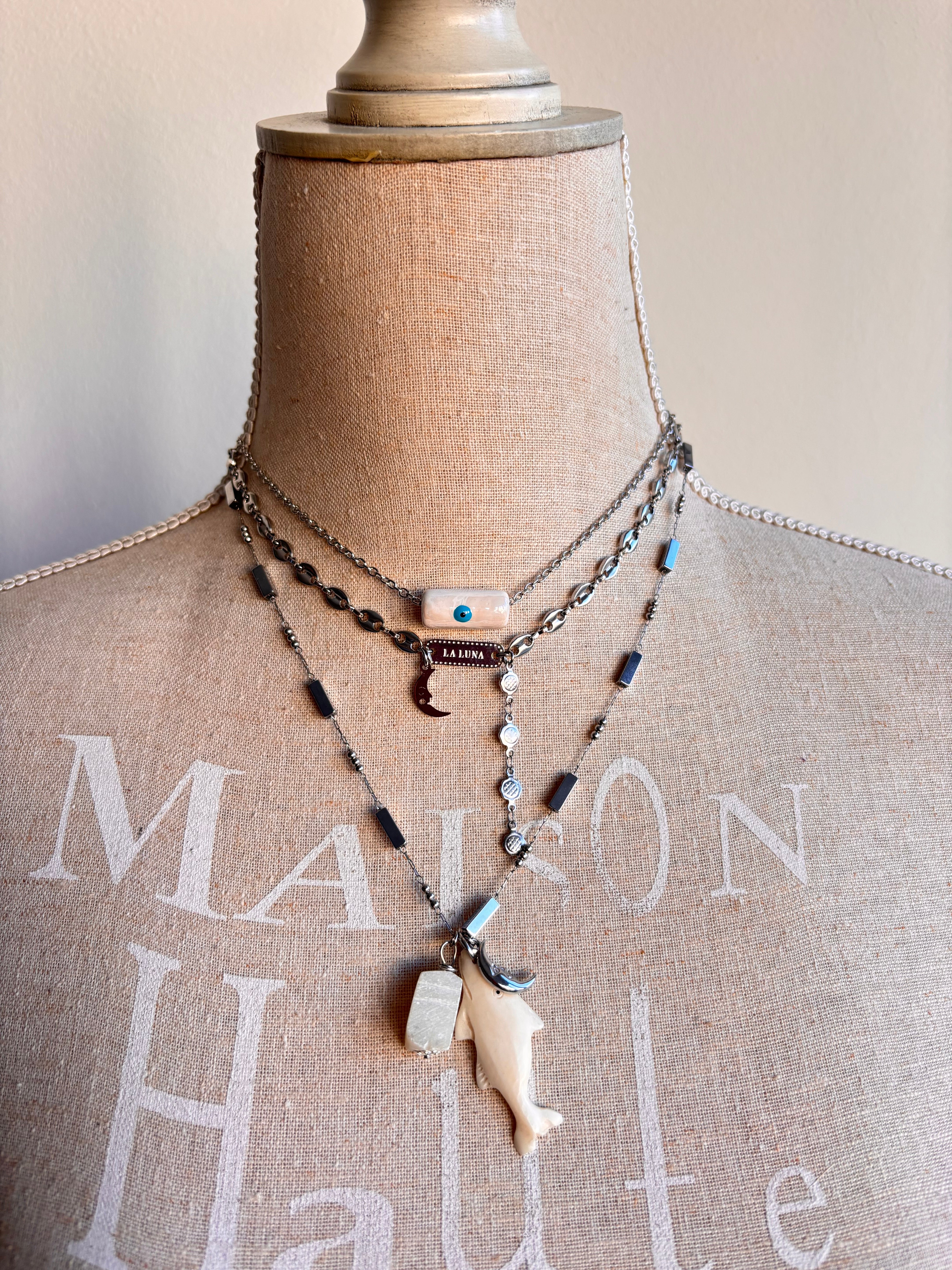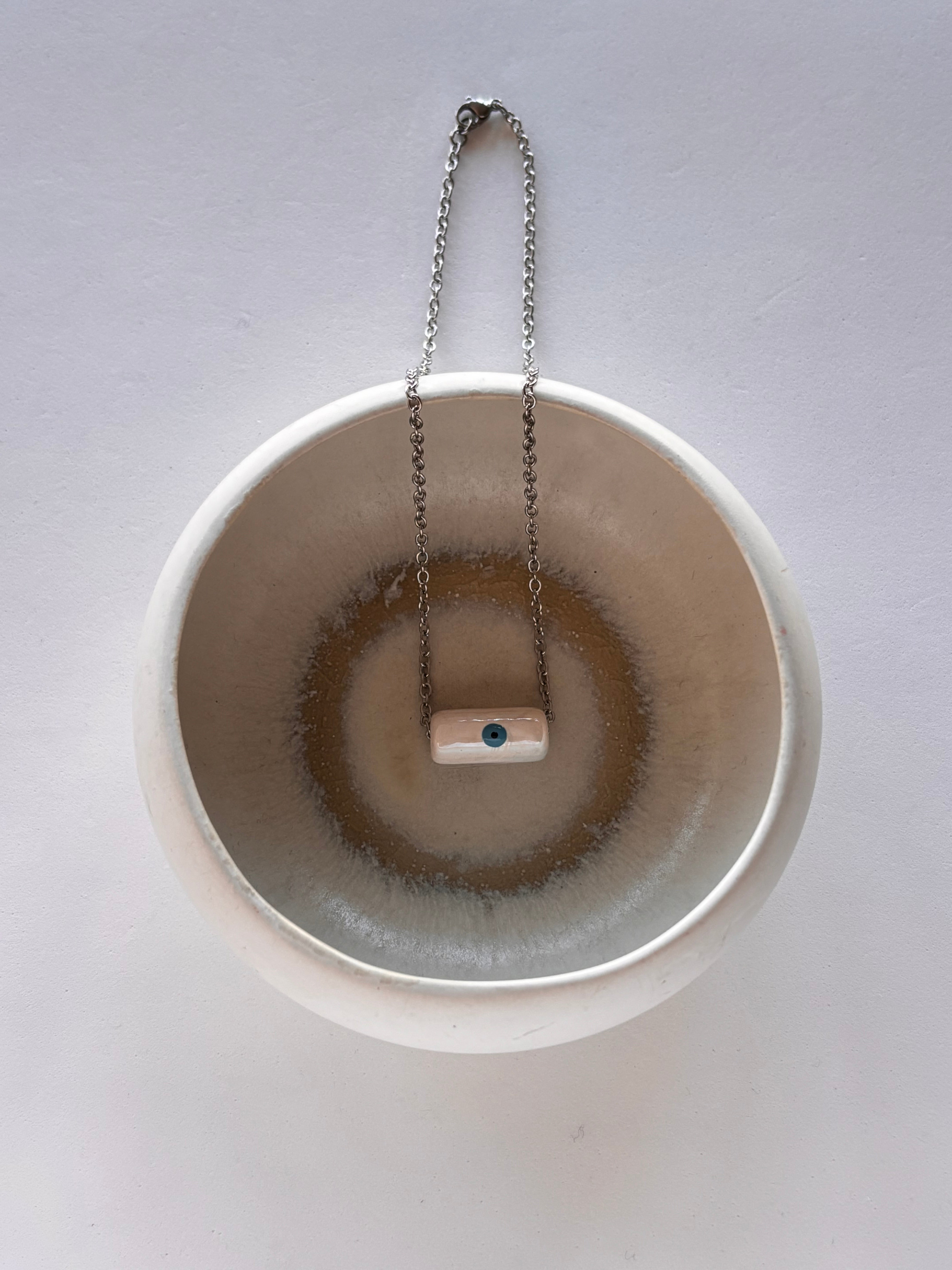 Dal design essenziale, questo girocollo leggero, al centro del quale un piccolo Occhio Greco portafortuna, appare delicatamente su una perlina tubolare in ceramica smaltata.