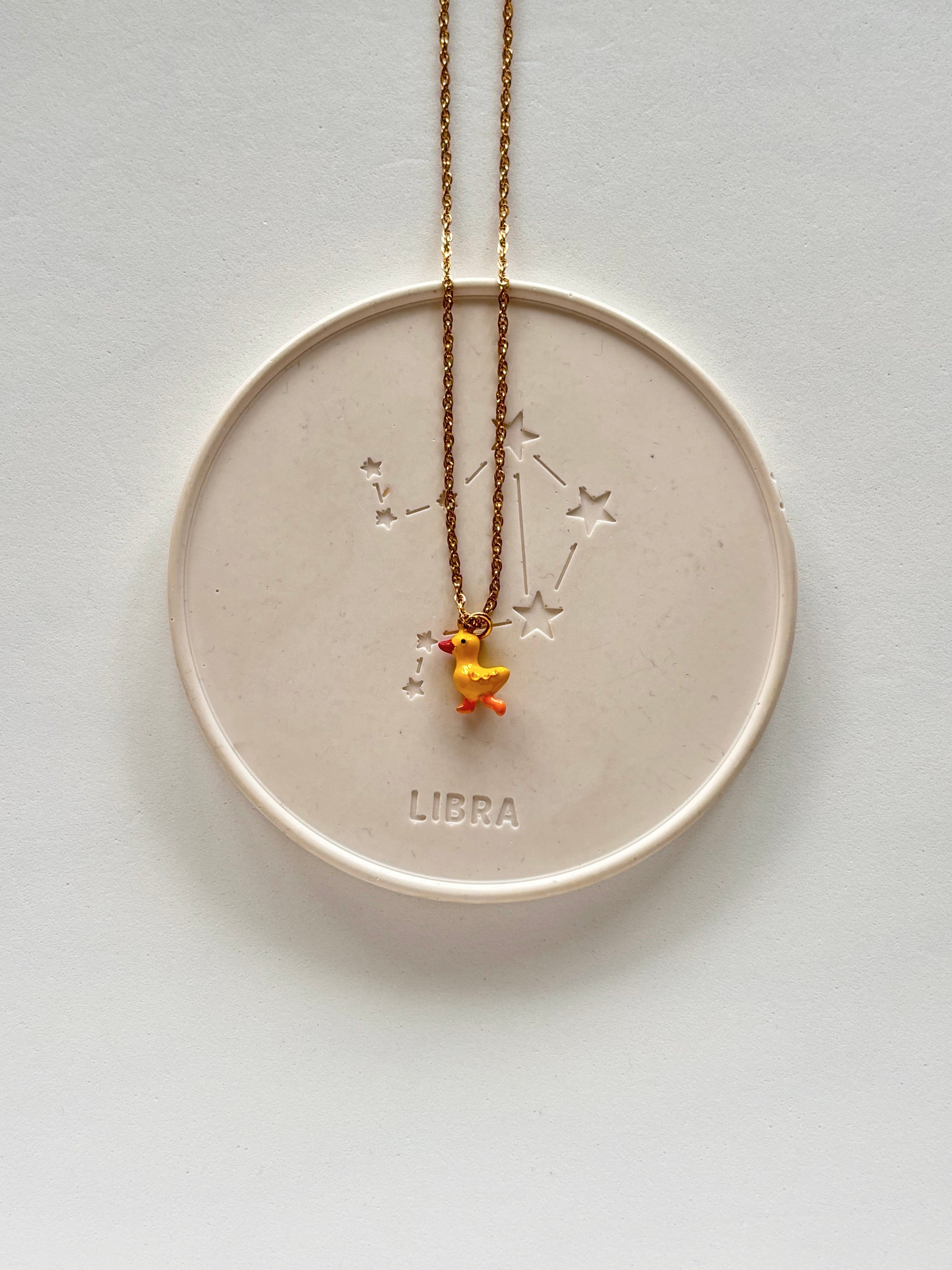 Una paperotta in marcia è la protagonista di questa collanina dal design giocoso e colorato.