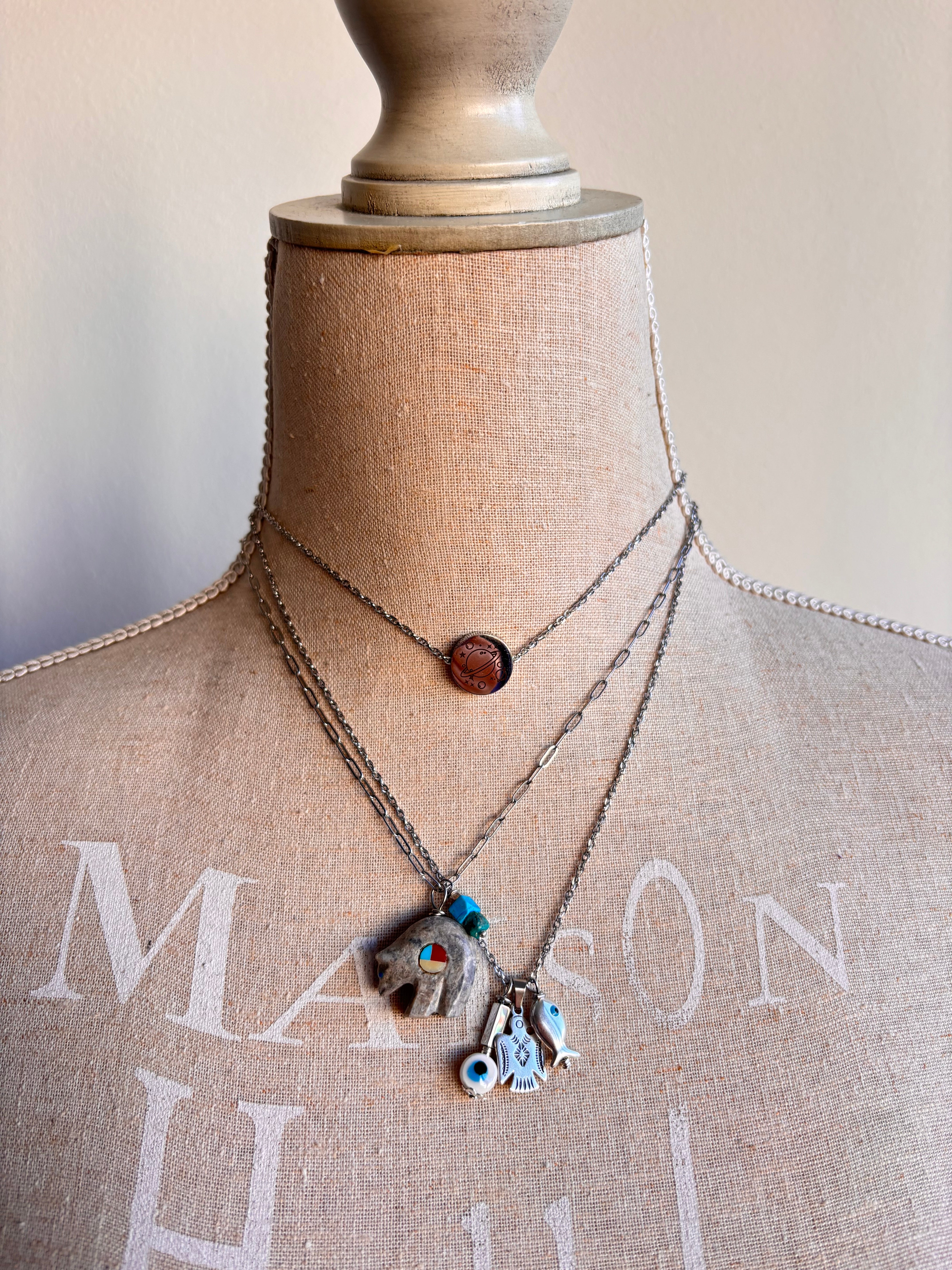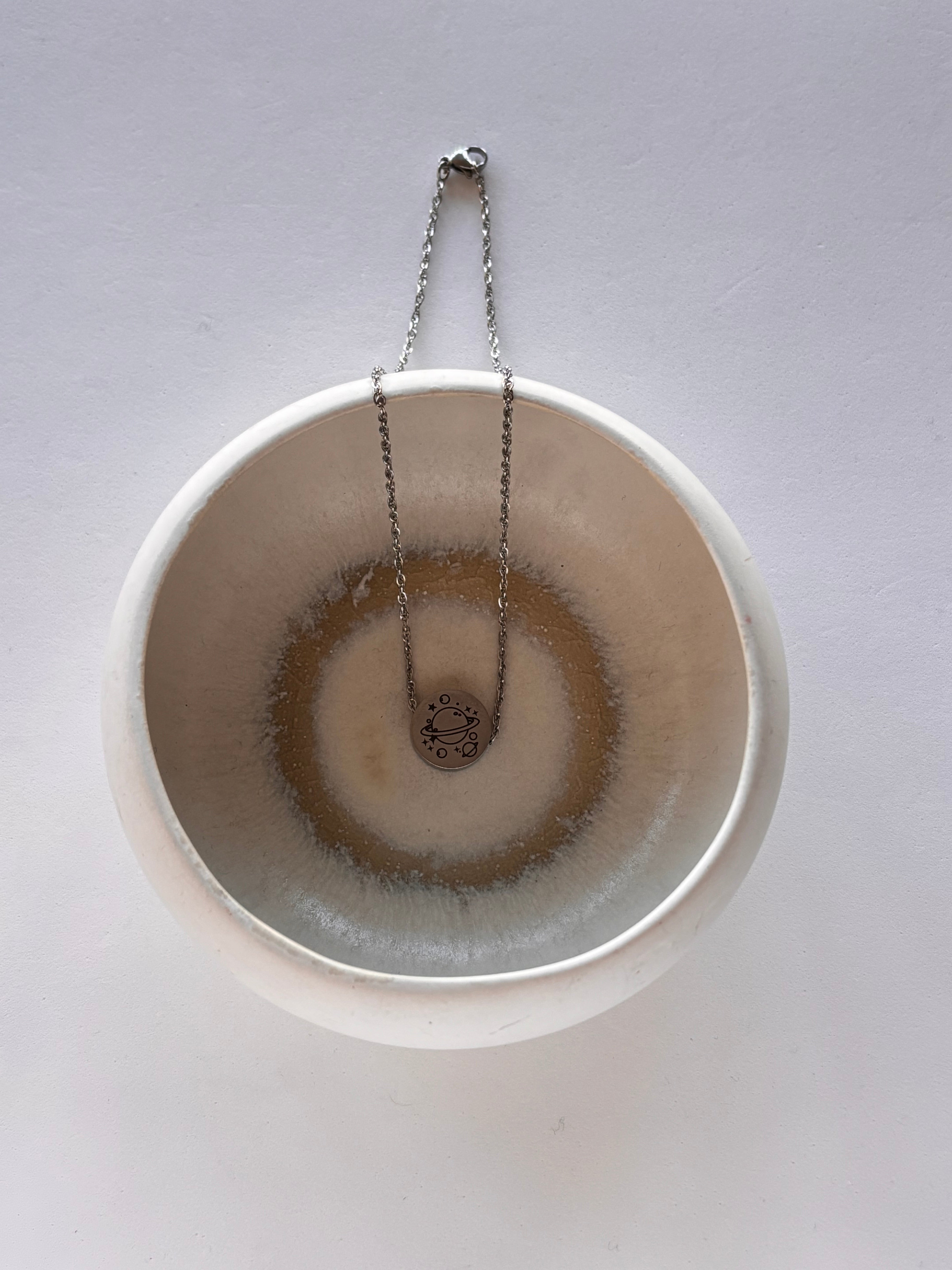 Un girocollo che strizza l’occhio al mondo astrale, grazie alla monetina bombata e zigrinata al centro.