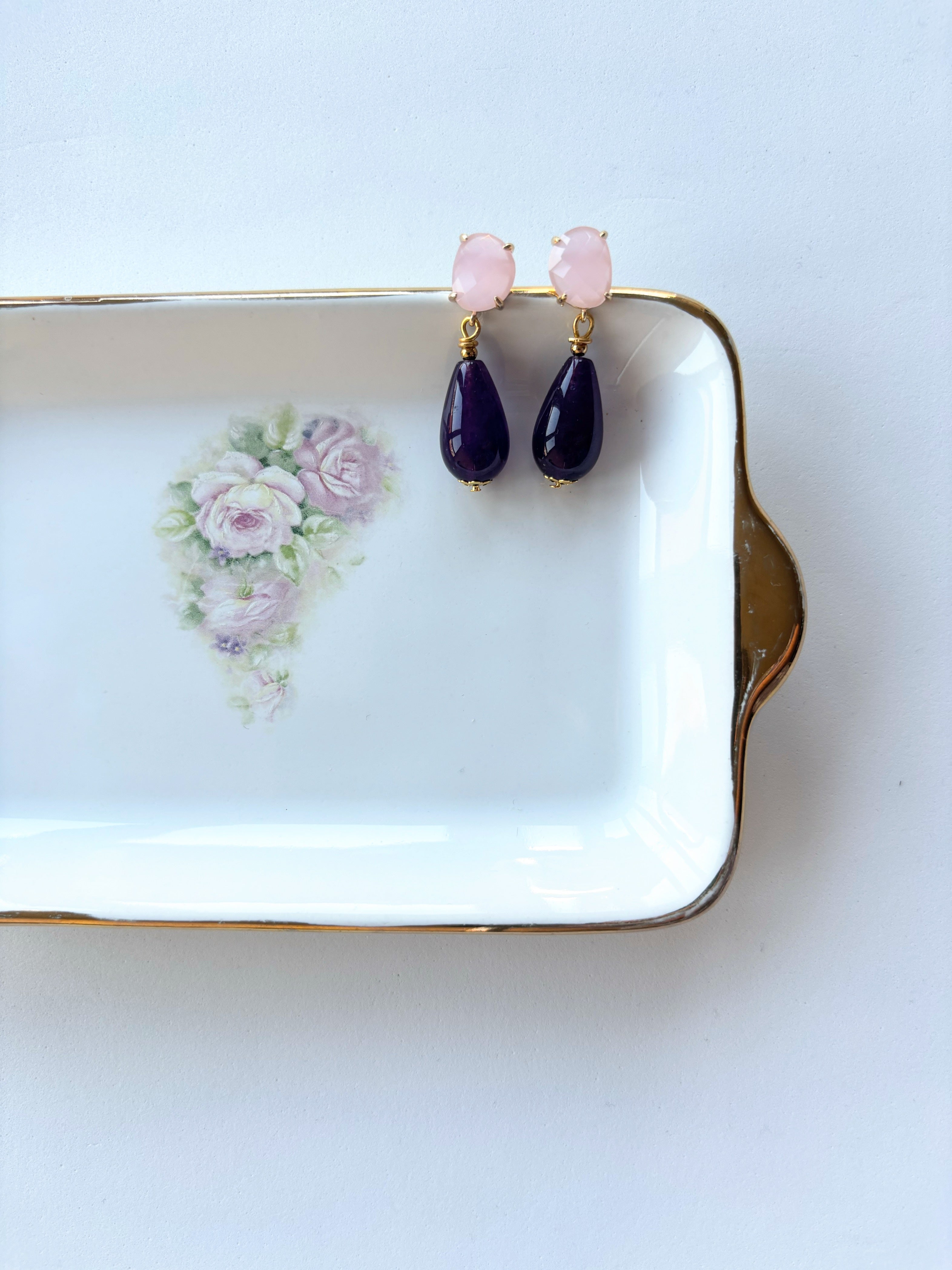 Orecchini chandelier, composti da dettaglio a lobo con pietra Occhio di Gatto e pendente in Ametista.