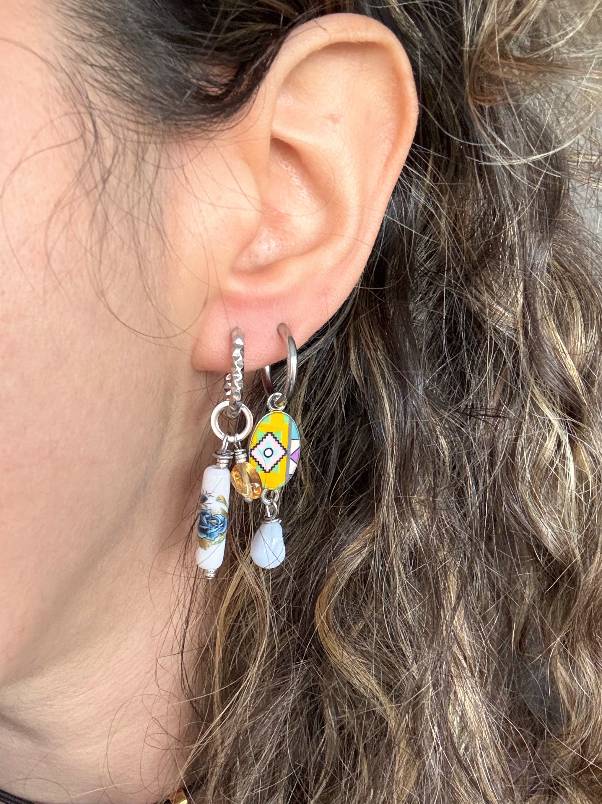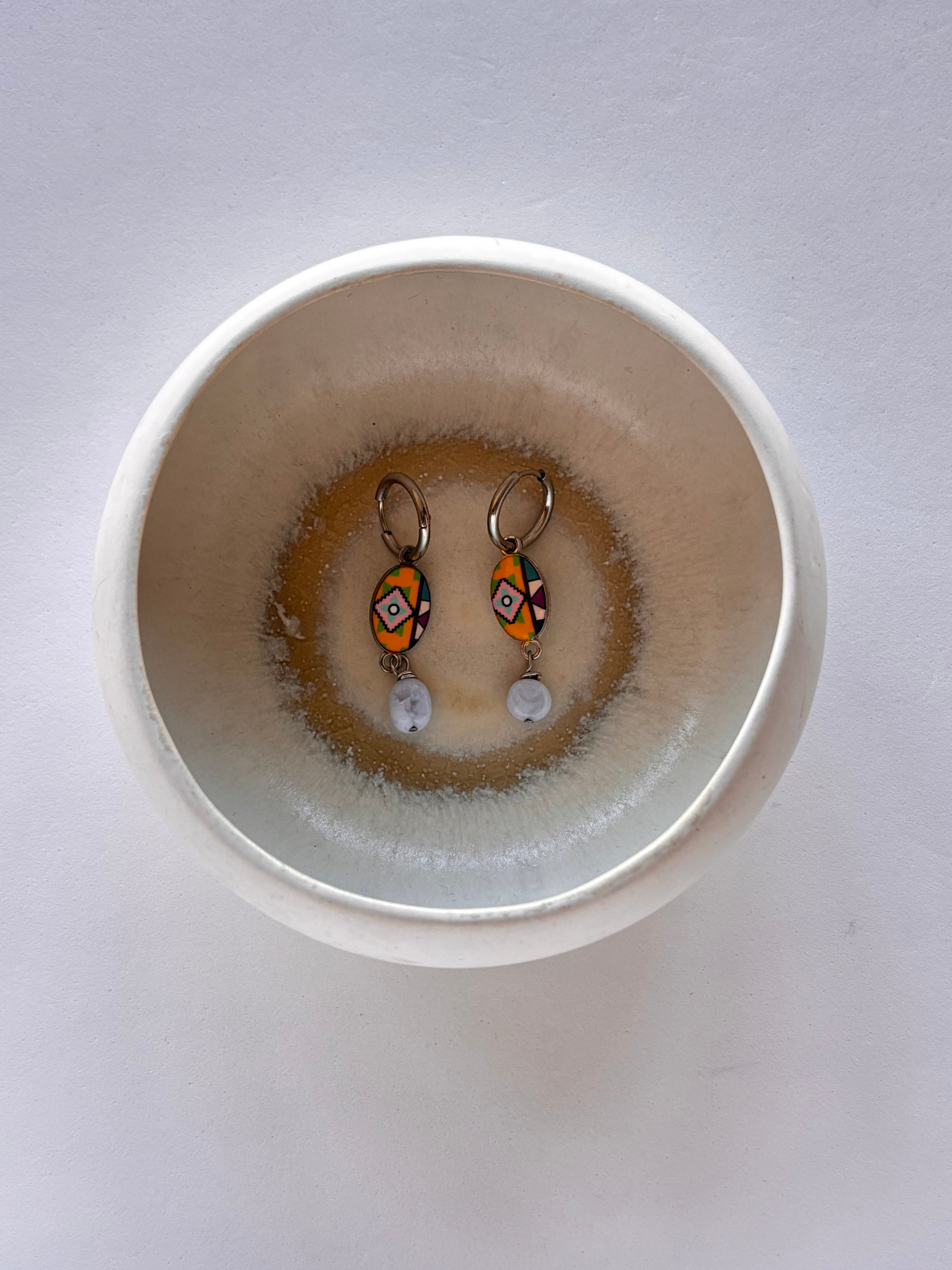 Una medaglietta coloratissima, arricchita da una piccola pepita in Calcedonio, pietra della comunicazione e protettrice dallo stress quotidiano, va a comporre questo paio di orecchini.