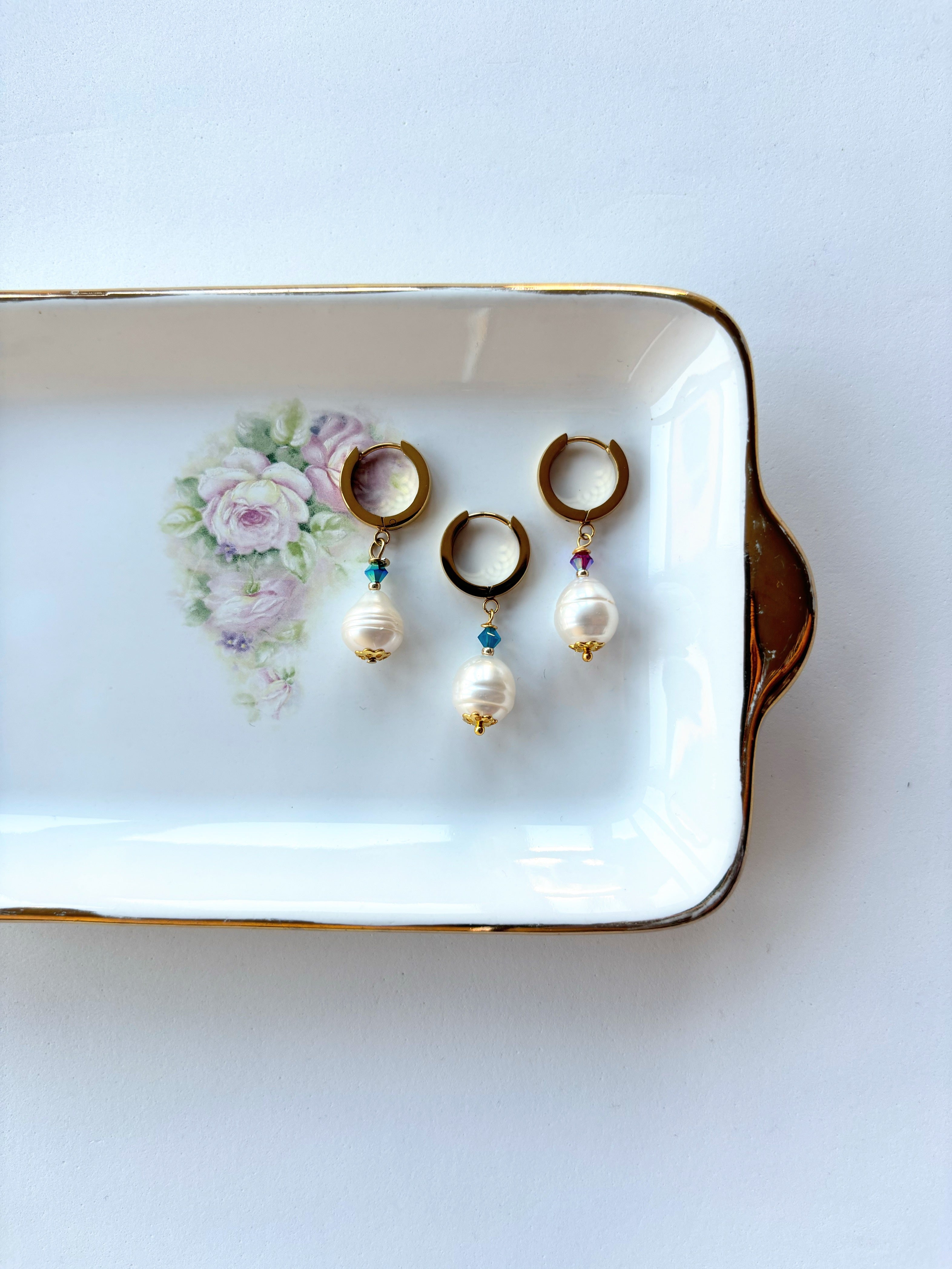 Orecchini eleganti ed eterni, composti da cerchietto bombato in acciaio inossidabile color oro, pendente in perla di fiume e piccolo dettaglio Swarovski.