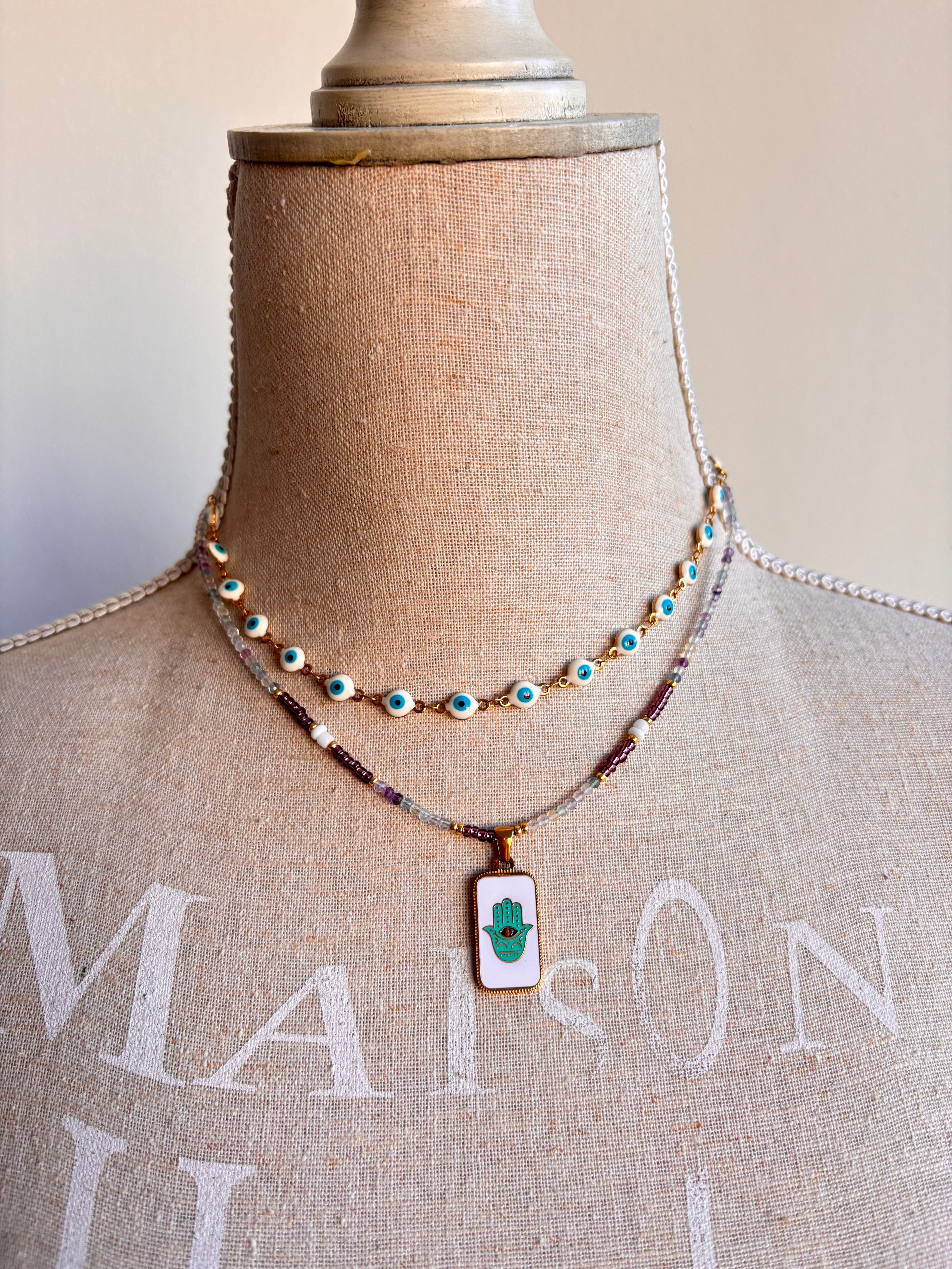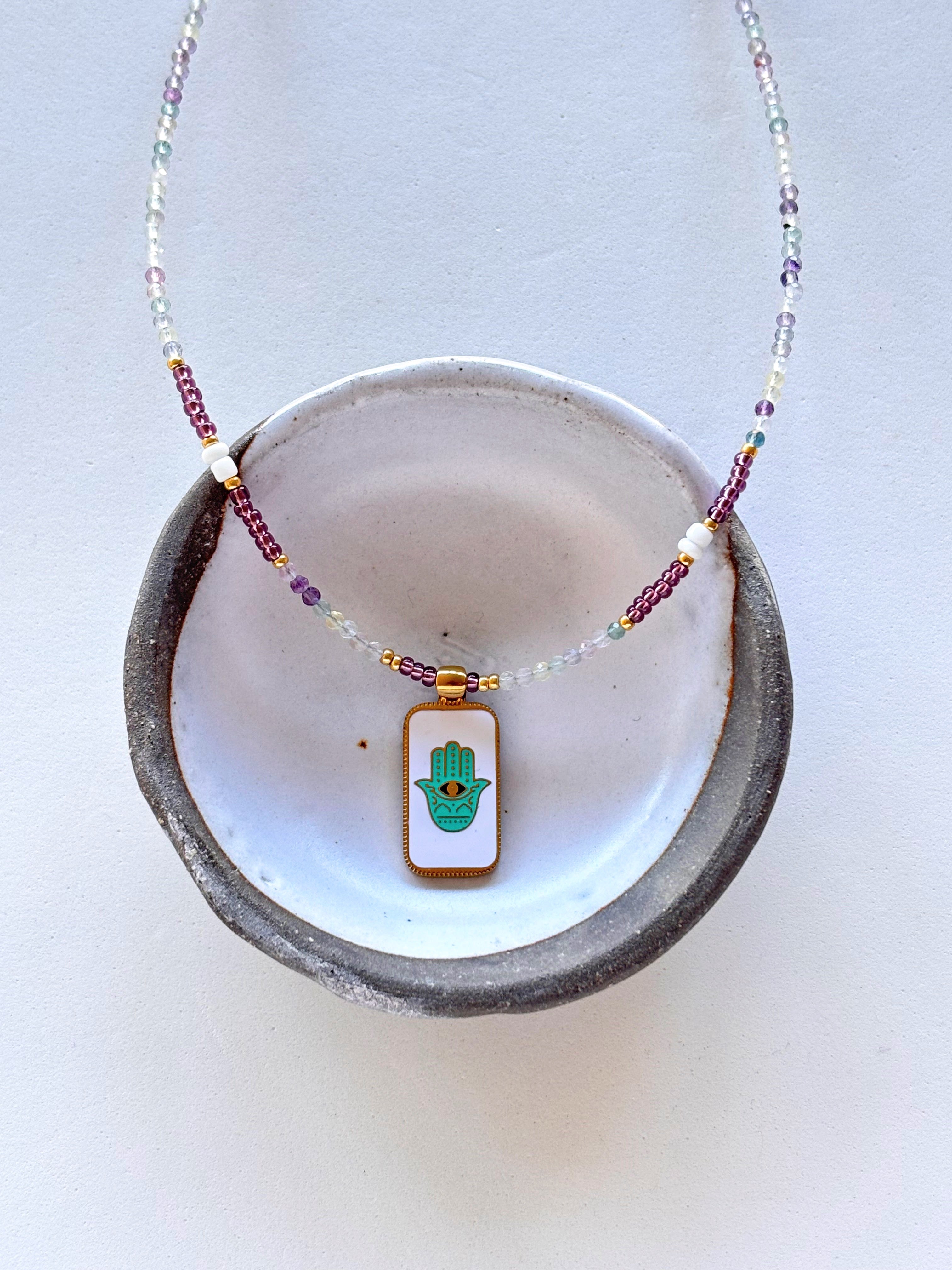 Un mix delicato, realizzato mediante l‘accostamento di cristalli in Fluorite naturale, pietra chiarificatrice del pensiero, e perline in vetro rocailles luminosissime, il tutto arricchito da una medaglietta smaltata con Mano di Fatima, amuleto portatore di buone energie e portafortuna.