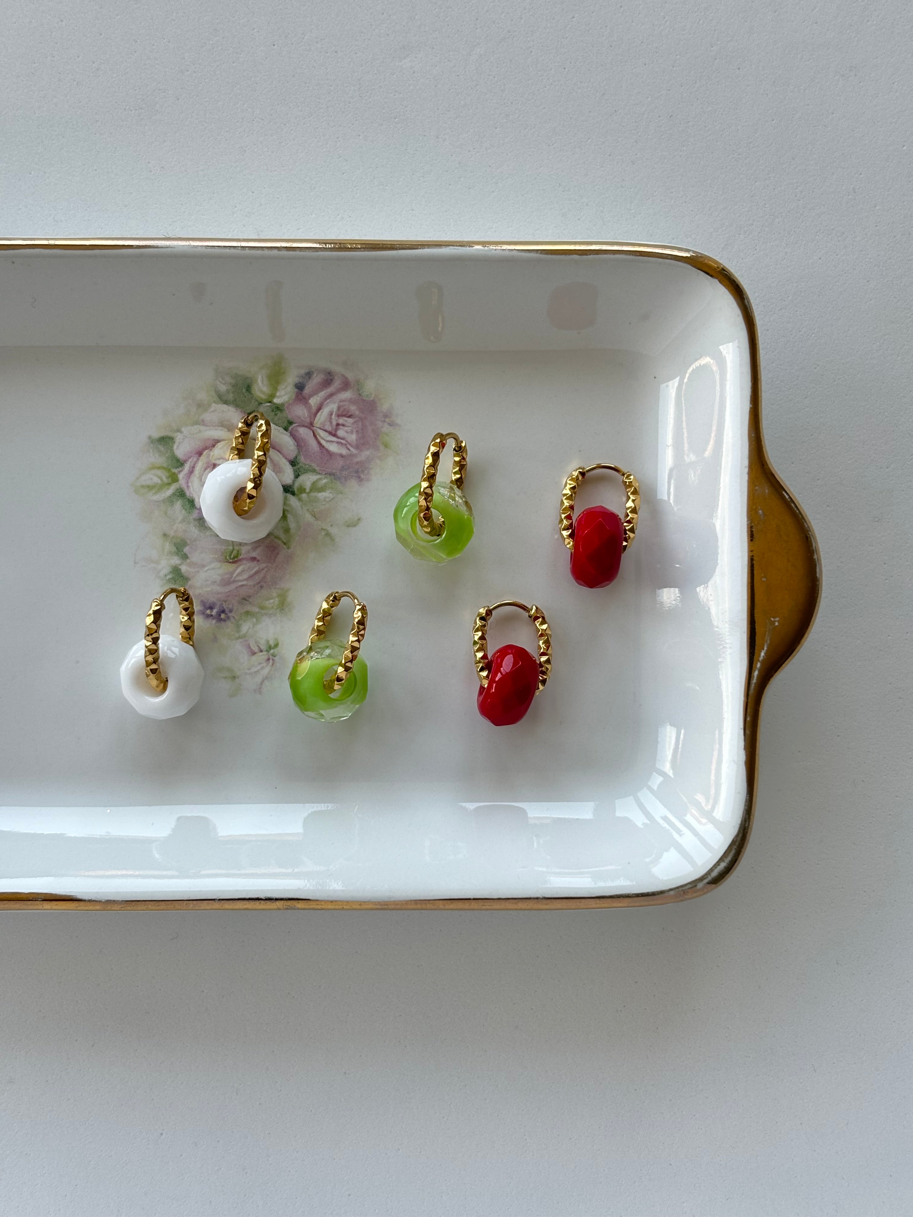 Ciambelline in vetro lavorato, su cerchietto zigrinato in acciaio inossidabile color oro.