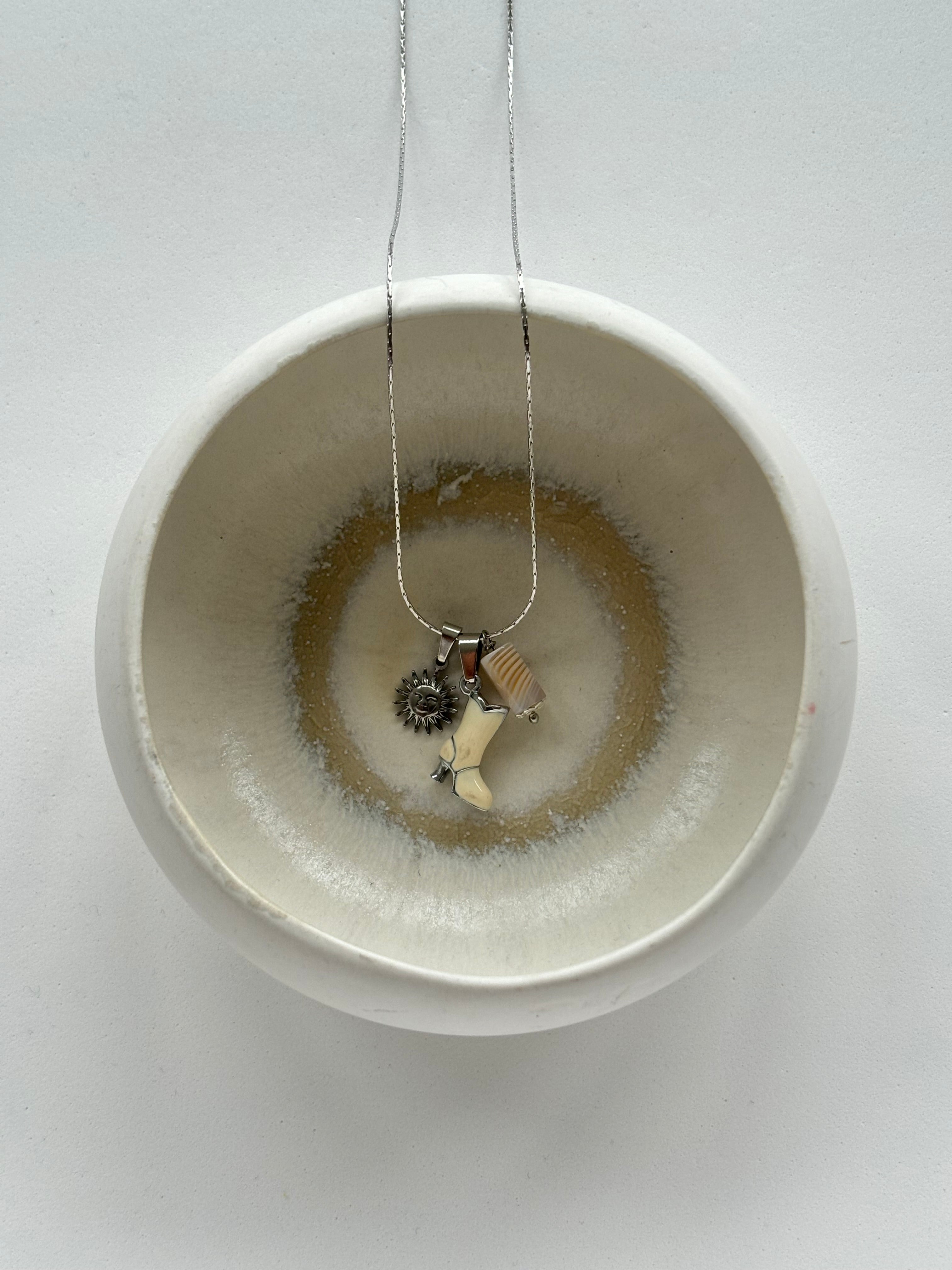 Collana dai toni panna e argento, nella quale un piccolo stivale texano (provenienza vintage) incontra un sole felice e una perlina in Agata striata.