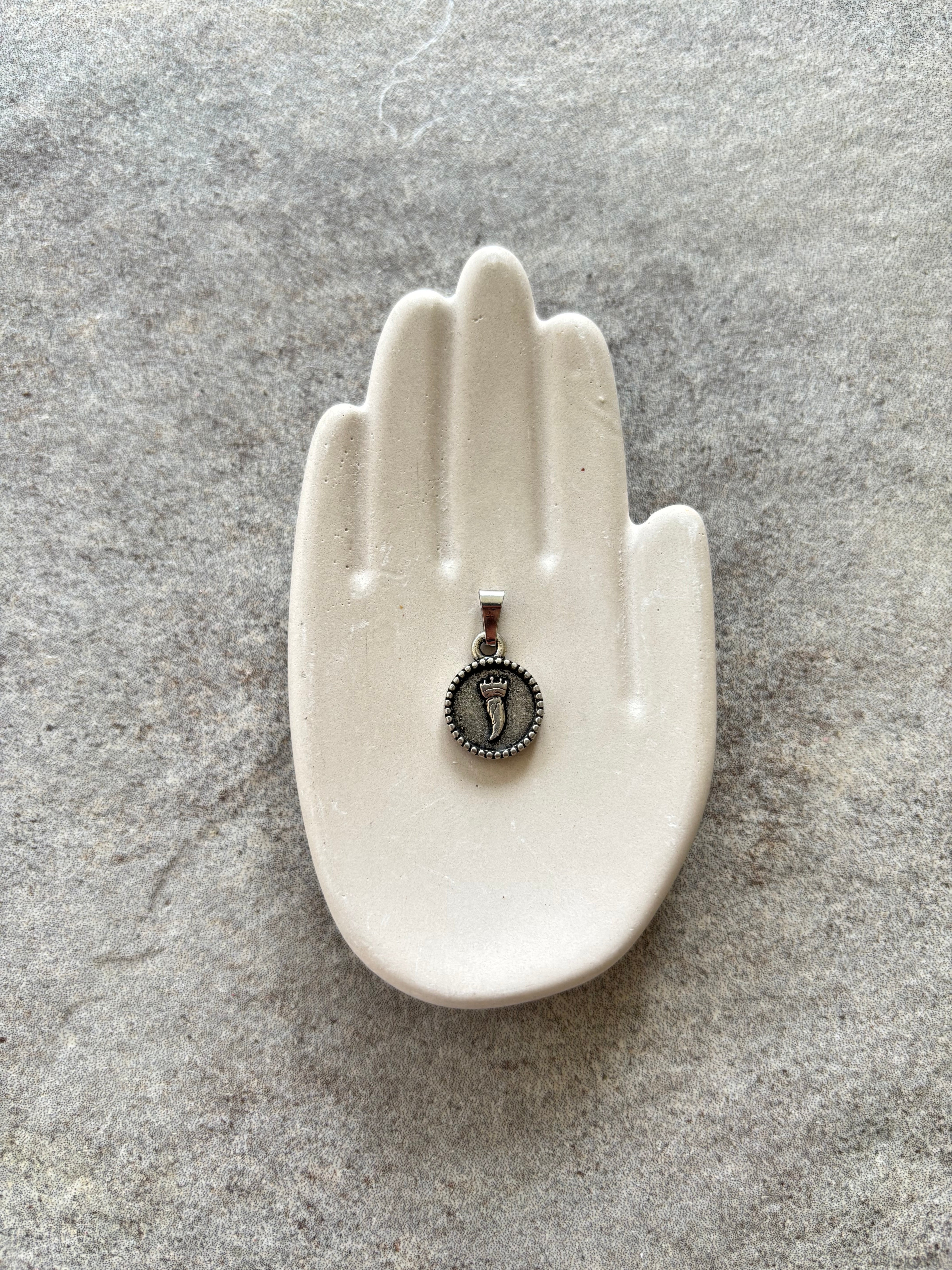 Mini medaglietta effetto anticato, con simbolo peperoncino portafortuna e dicitura “Napoli Ammore Mio” sul retro.