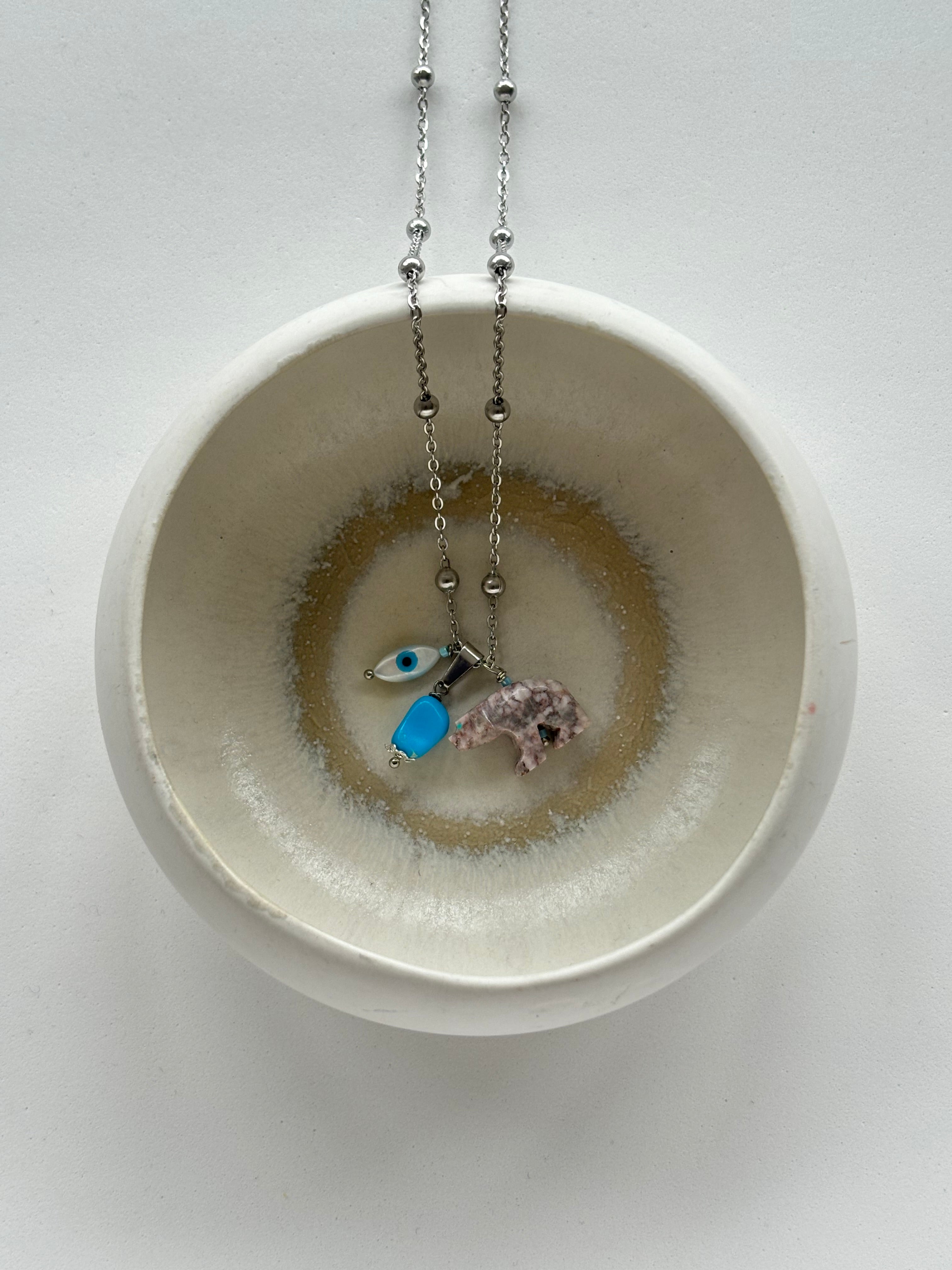 Collana multicharms dai toni freschissimi: un orsetto color malva, un Occhio Greco portafortuna ed una gemma turchese intenso..e in un attimo è estate!