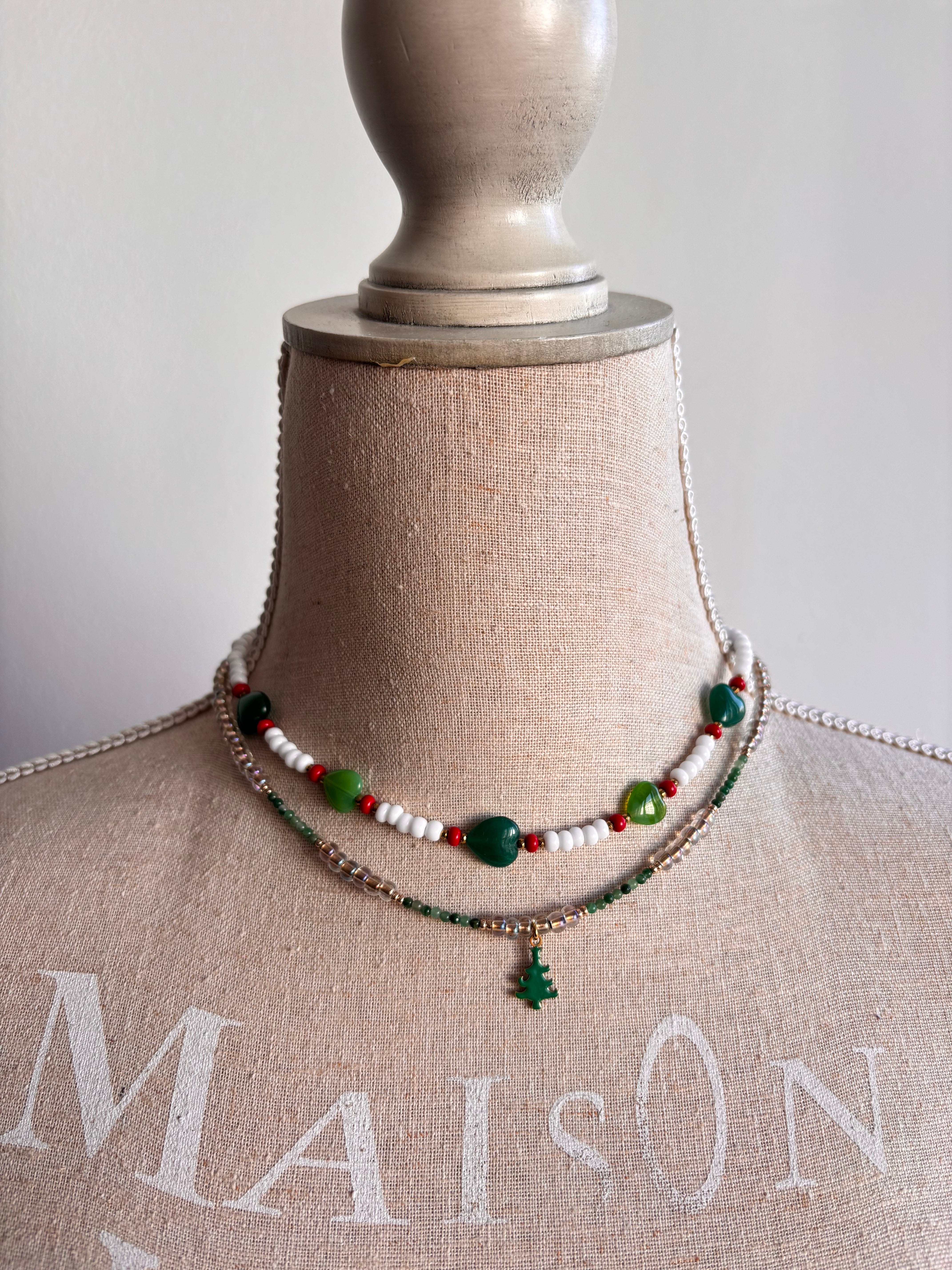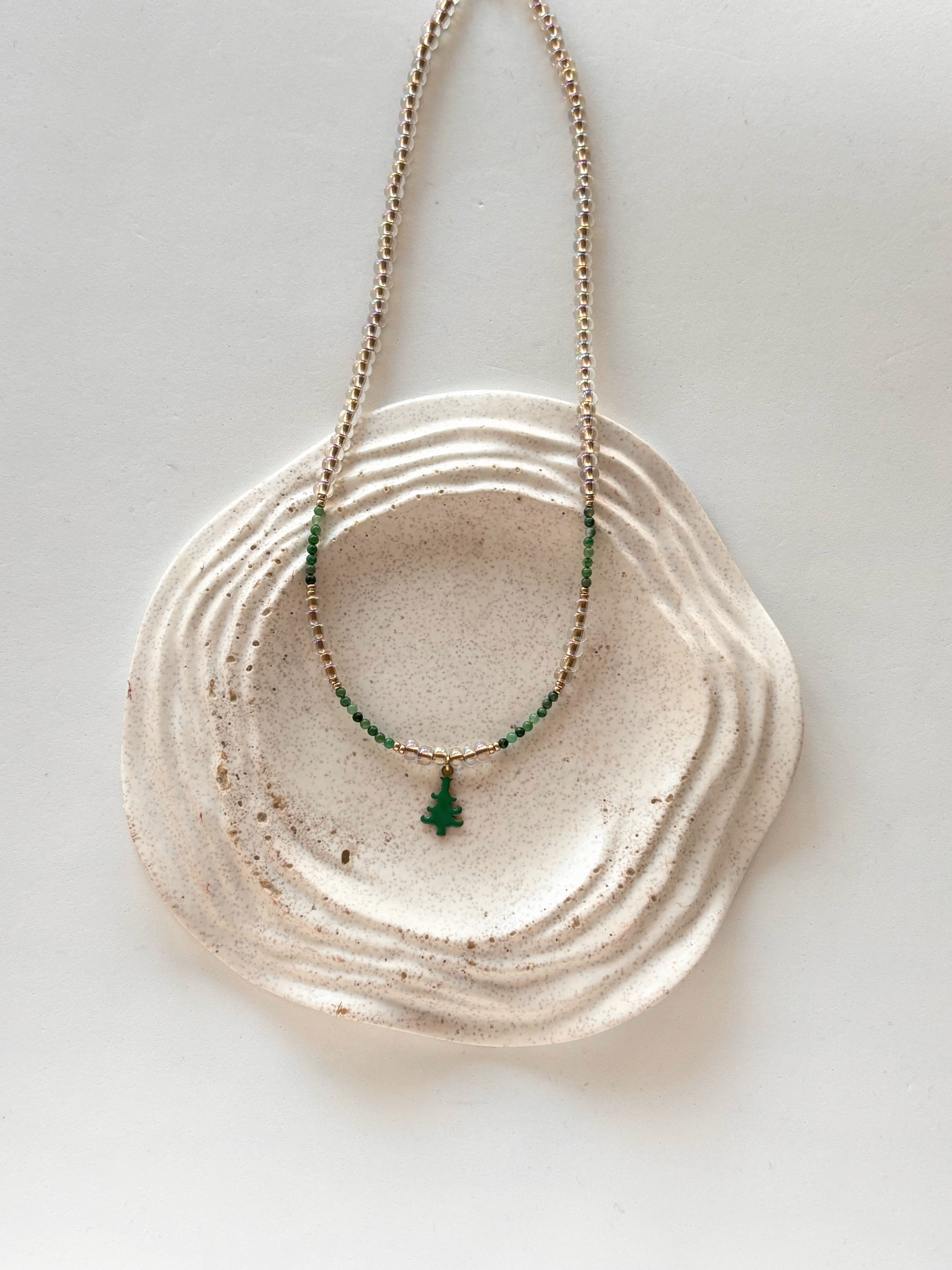 Perline in vetro ad effetto olografico, piccole pietruzze sui tini del verde e un alberello smaltato al centro.