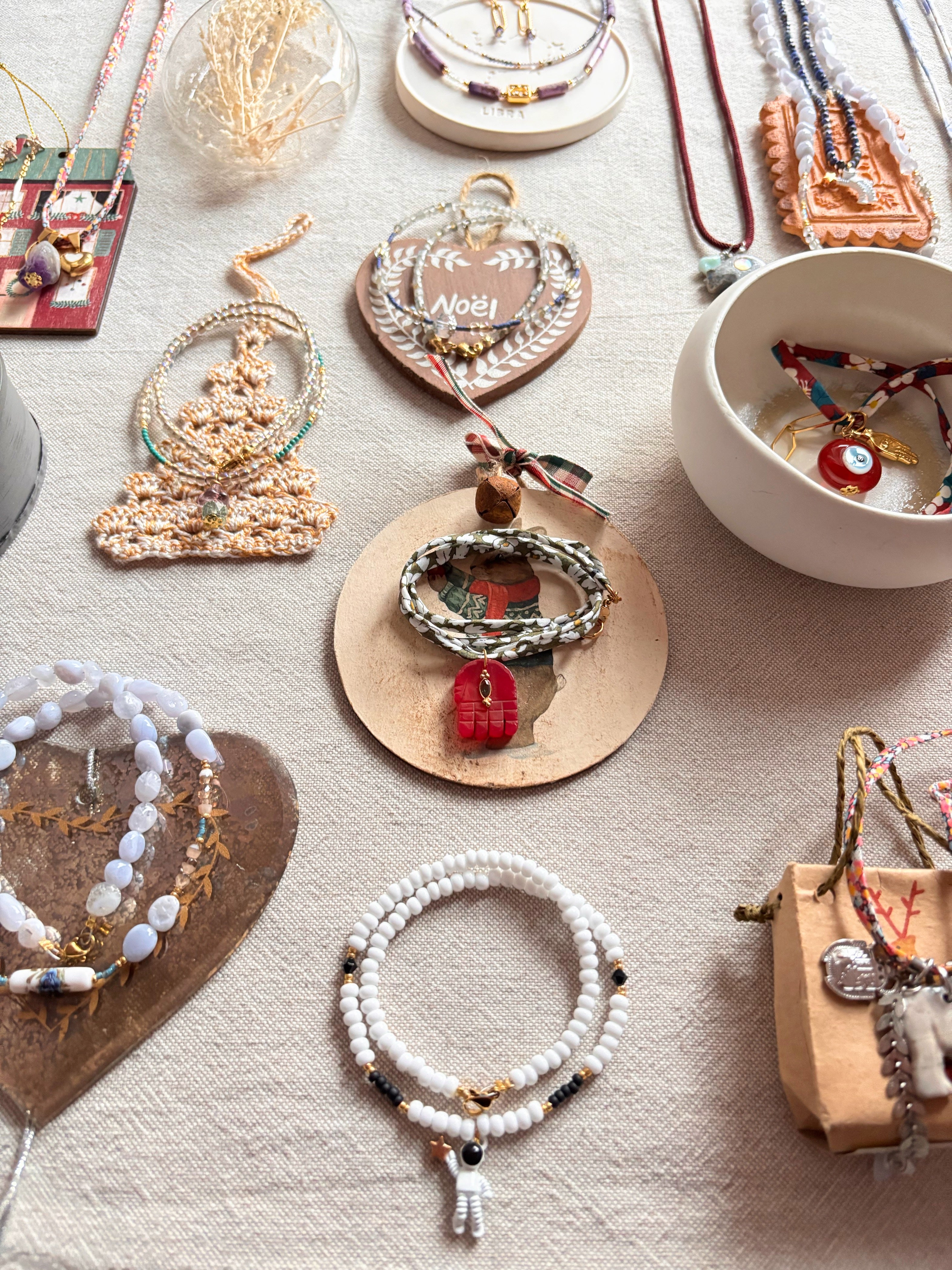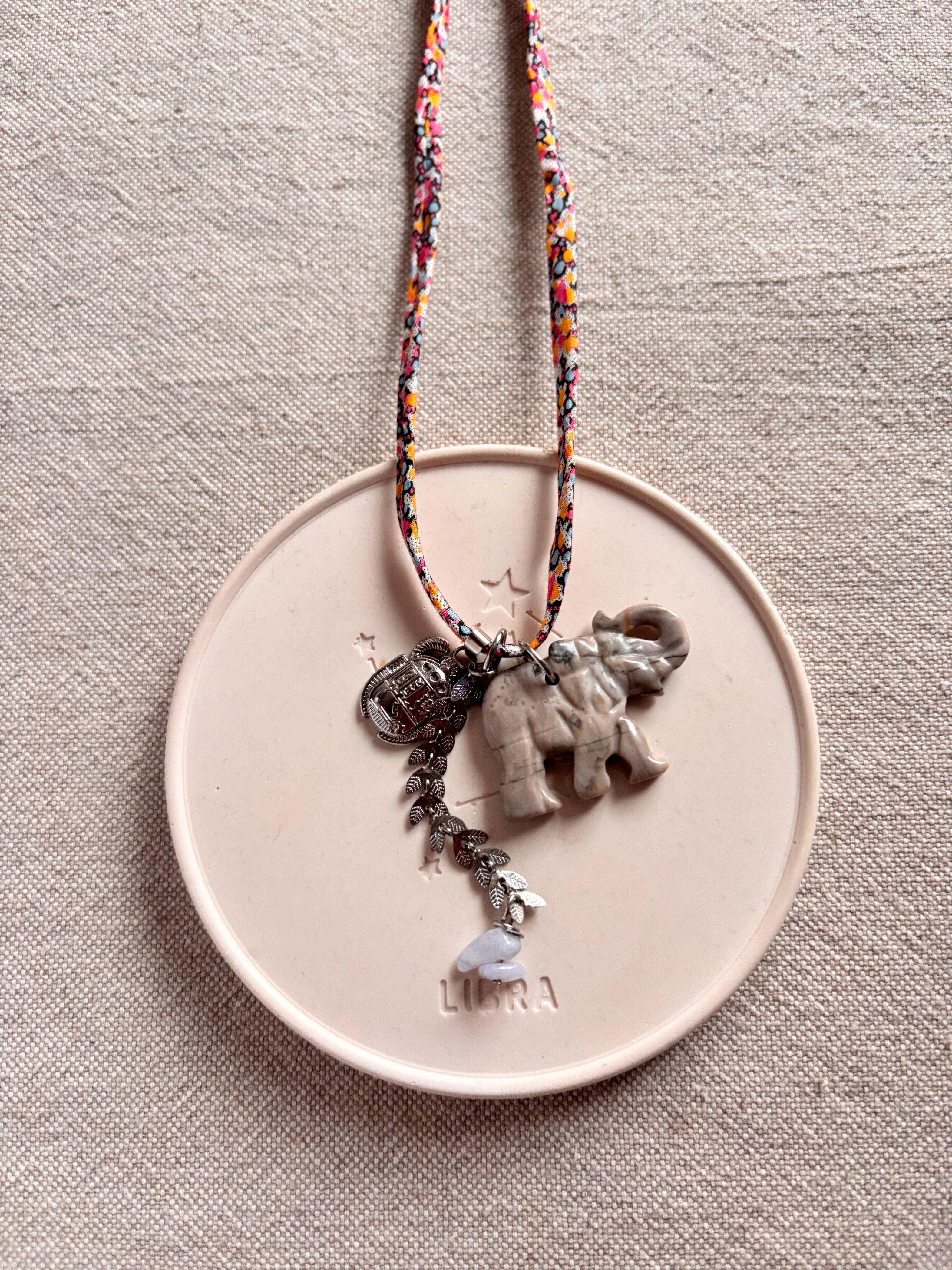 Collana Boho dal sapore retrò e delicato, grazie al nastrino in cotone in stampa liberty e ai charms che la caratterizzano: elefante in pietra dura, animale totem simbolo di saggezza e longevità, e allo scarabeo indiano, amuleto legato alla rinascita.