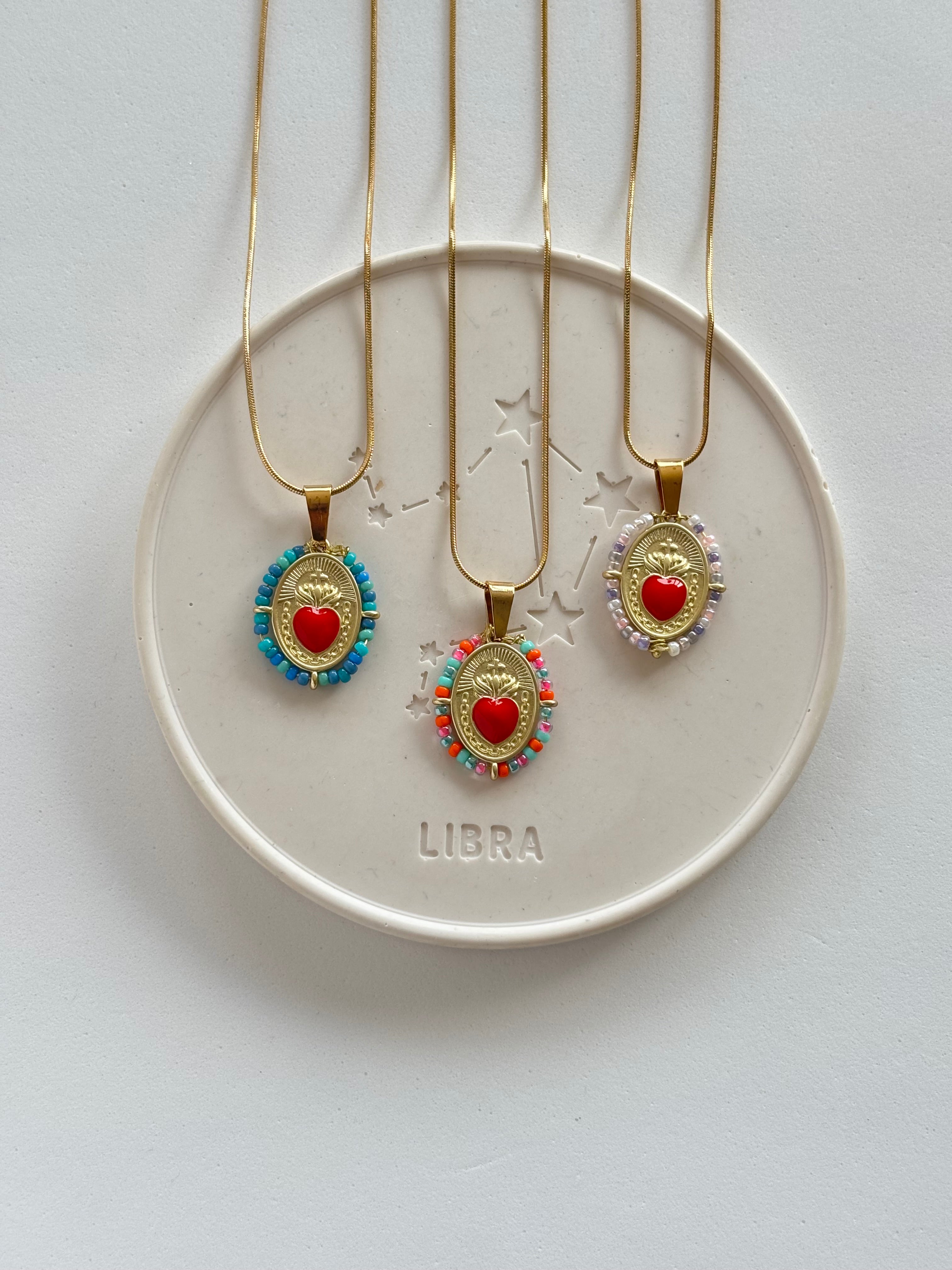 Il Cuore Sacro, simbolo di redenzione allo stesso tempo protezione dell’anima, in questo gioiello si presenta smaltato al centro di una medaglietta, circondata da micro perline coloratissime.