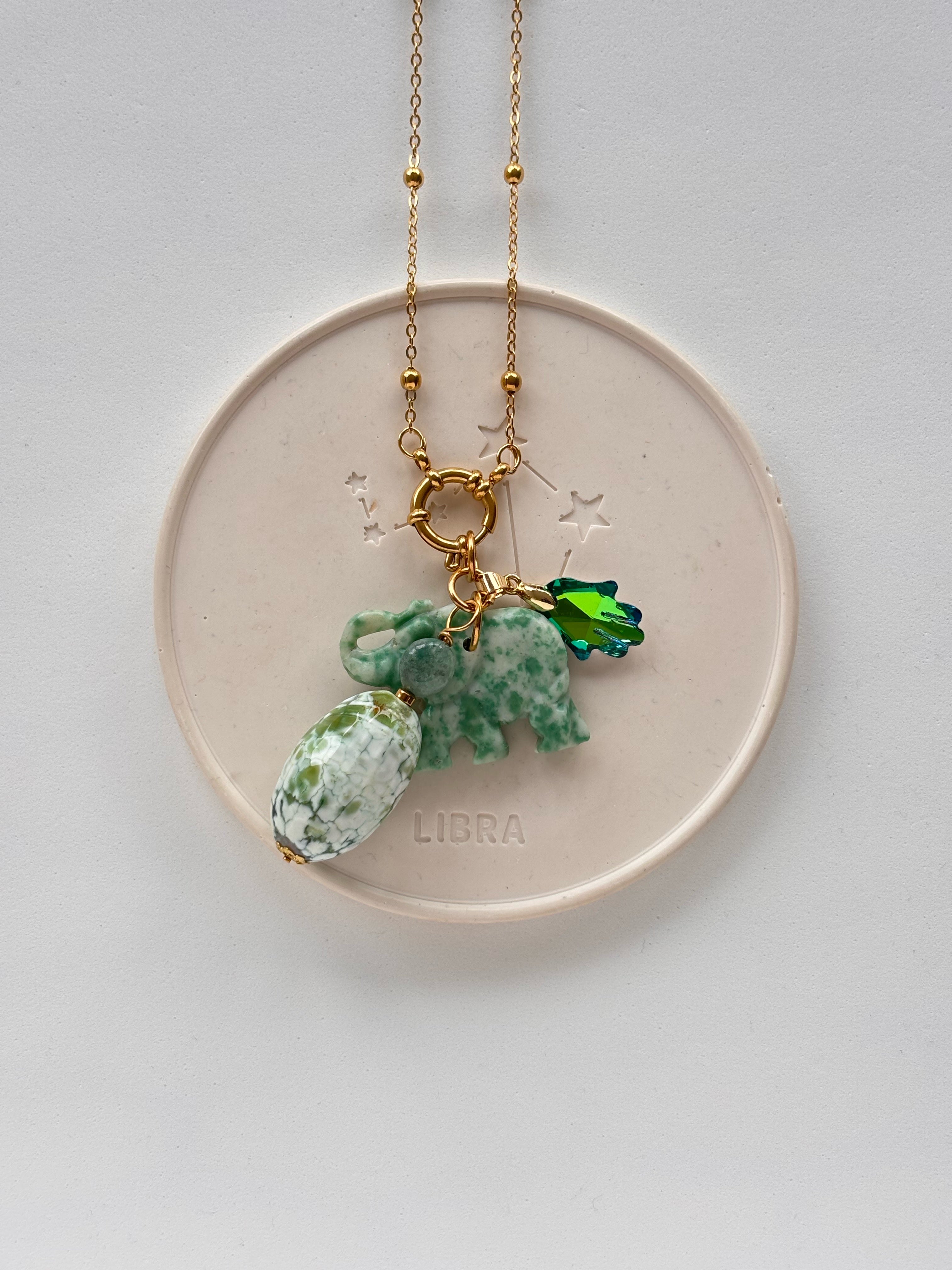 In questo gioiello troviamo una chiusura marinaio al centro sul davanti, che sostiene un mix di charms quali una Mano di Fatima in vetro smerigliato, simbolo di buon auspicio, accanto ad un elefante, animale dall’innata longevità e saggezza, e ad una maxi pepita in Agata muschiata.