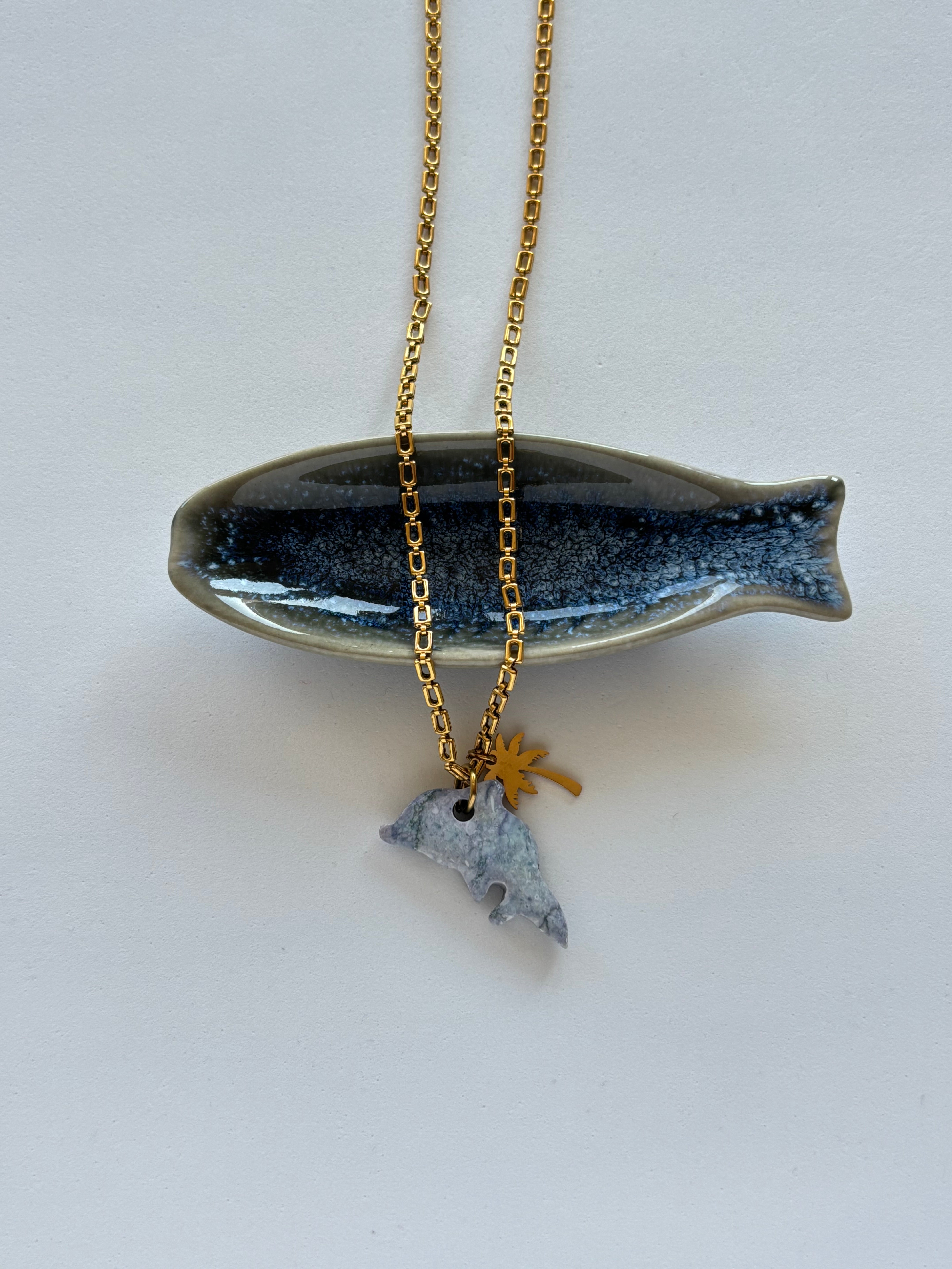 Un delfino in pietra dura, simbolo di libertà, ed una piccola palma che riprende il colore della catena lavorata.