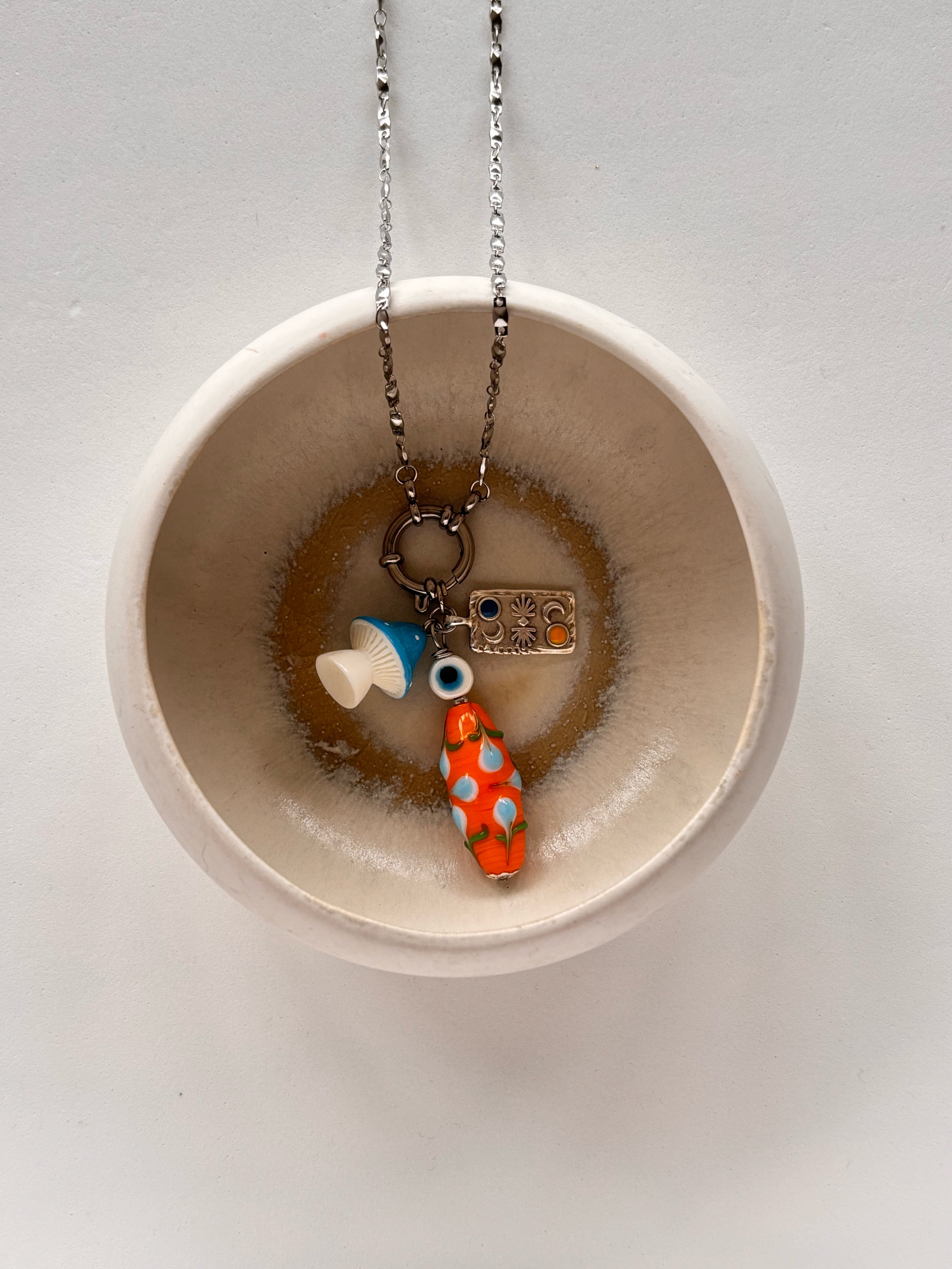 In questo gioiello troviamo una chiusura marinaio al centro sul davanti, che sostiene un mix di charms quali una medaglietta smaltata, una pepita in ceramica lavorata a mano, un dettaglio con Occhio Greco portafortuna ed un funghetto in plexy.