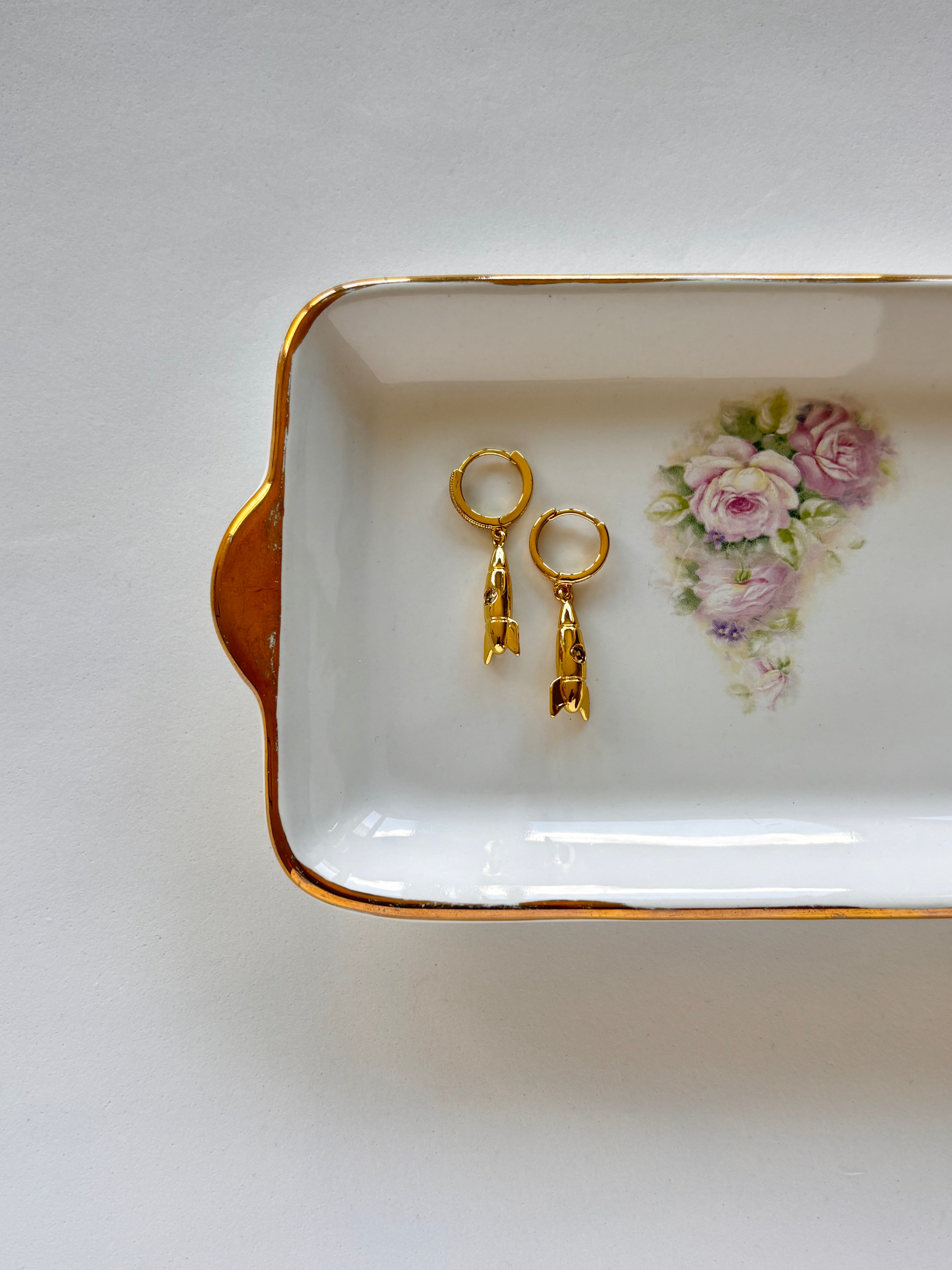Coppia di orecchini composti da cerchietti in ottone placcato oro, con zirconcini incastonati e charms razzo spaziale.