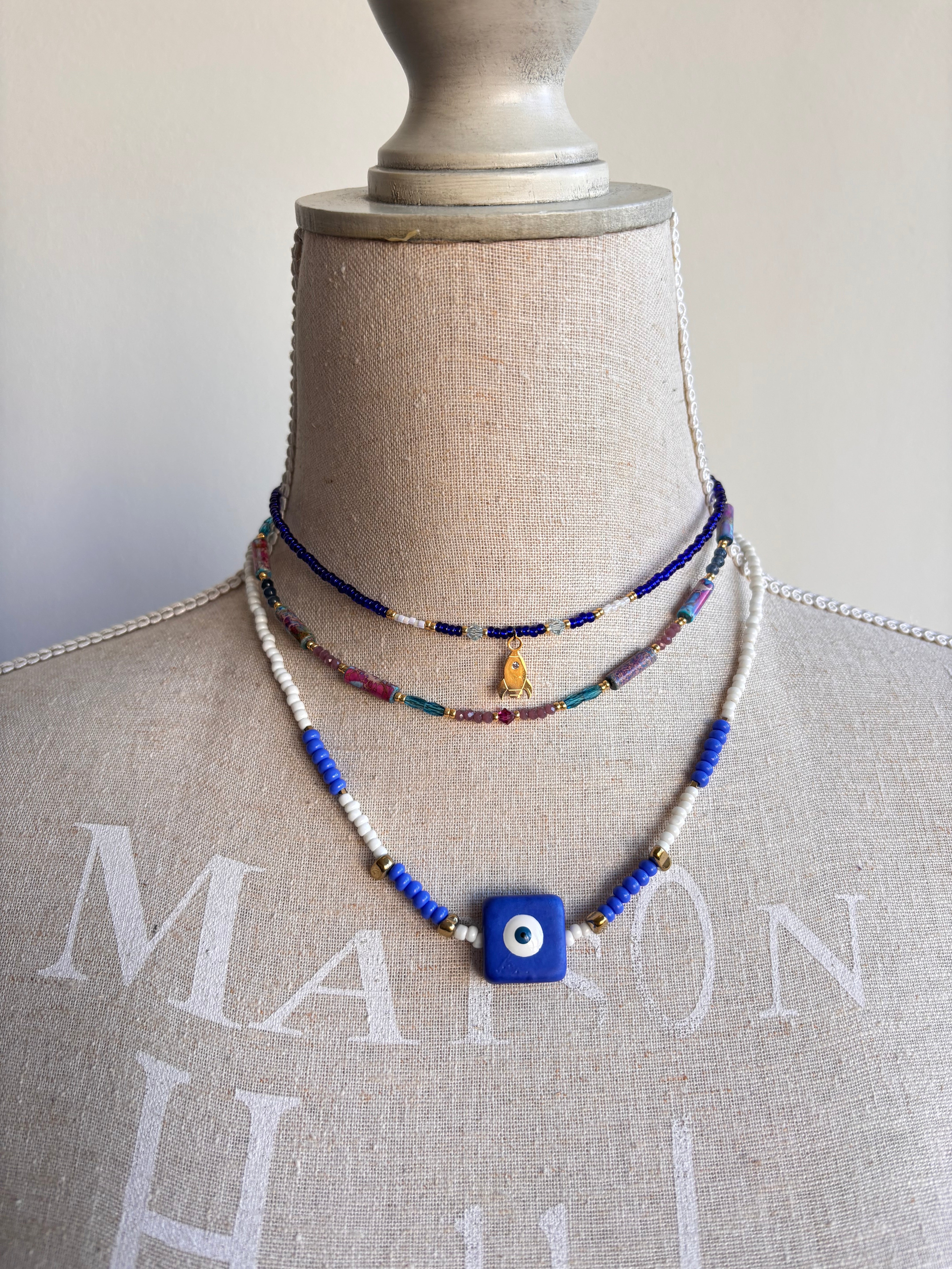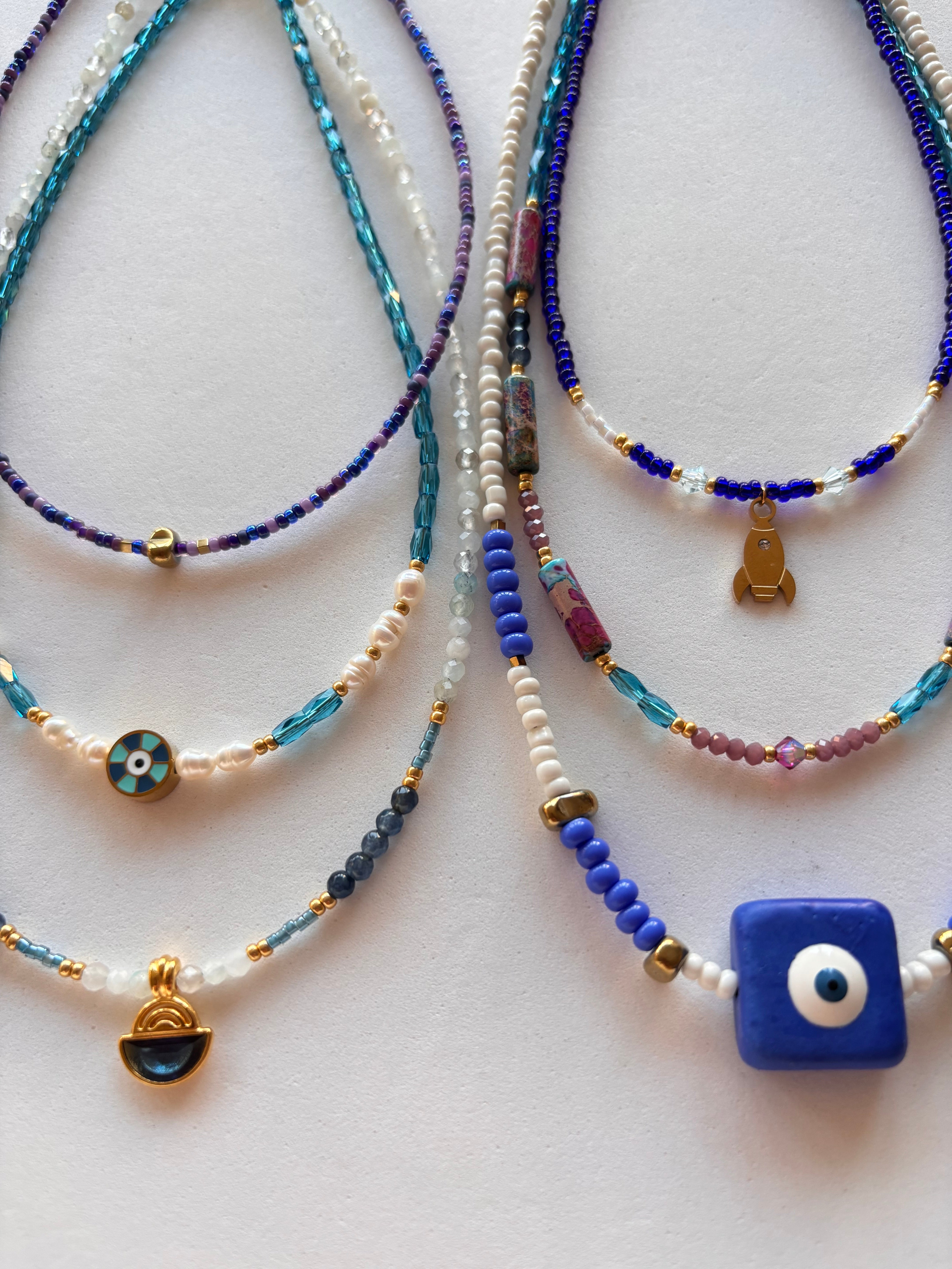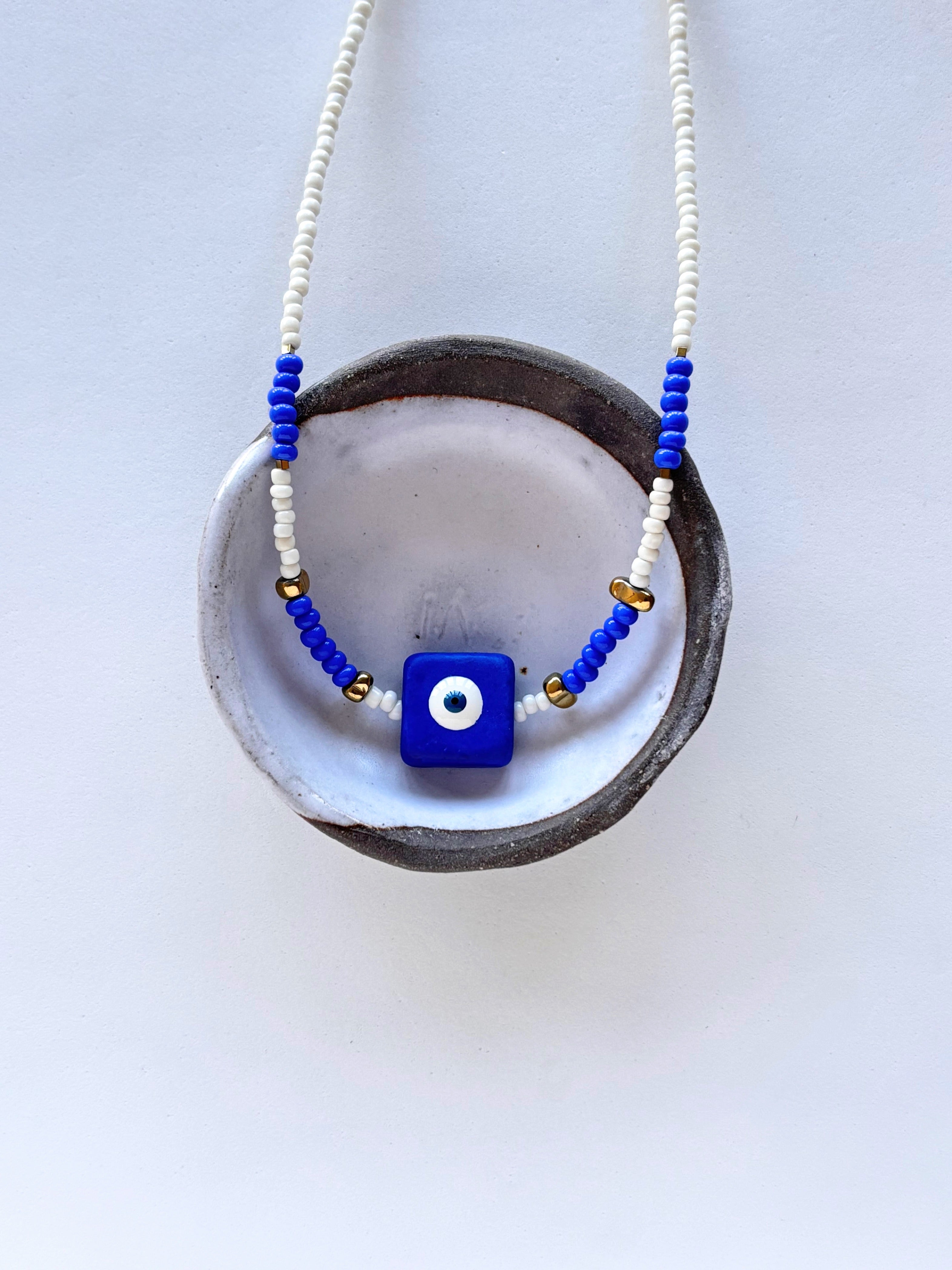Sembra scrutare il tuo lato più profondo, questo ciondolo in ceramica porosa e smaltata, arricchita da Occhio Greco portafortuna, circondato da perline in tono.