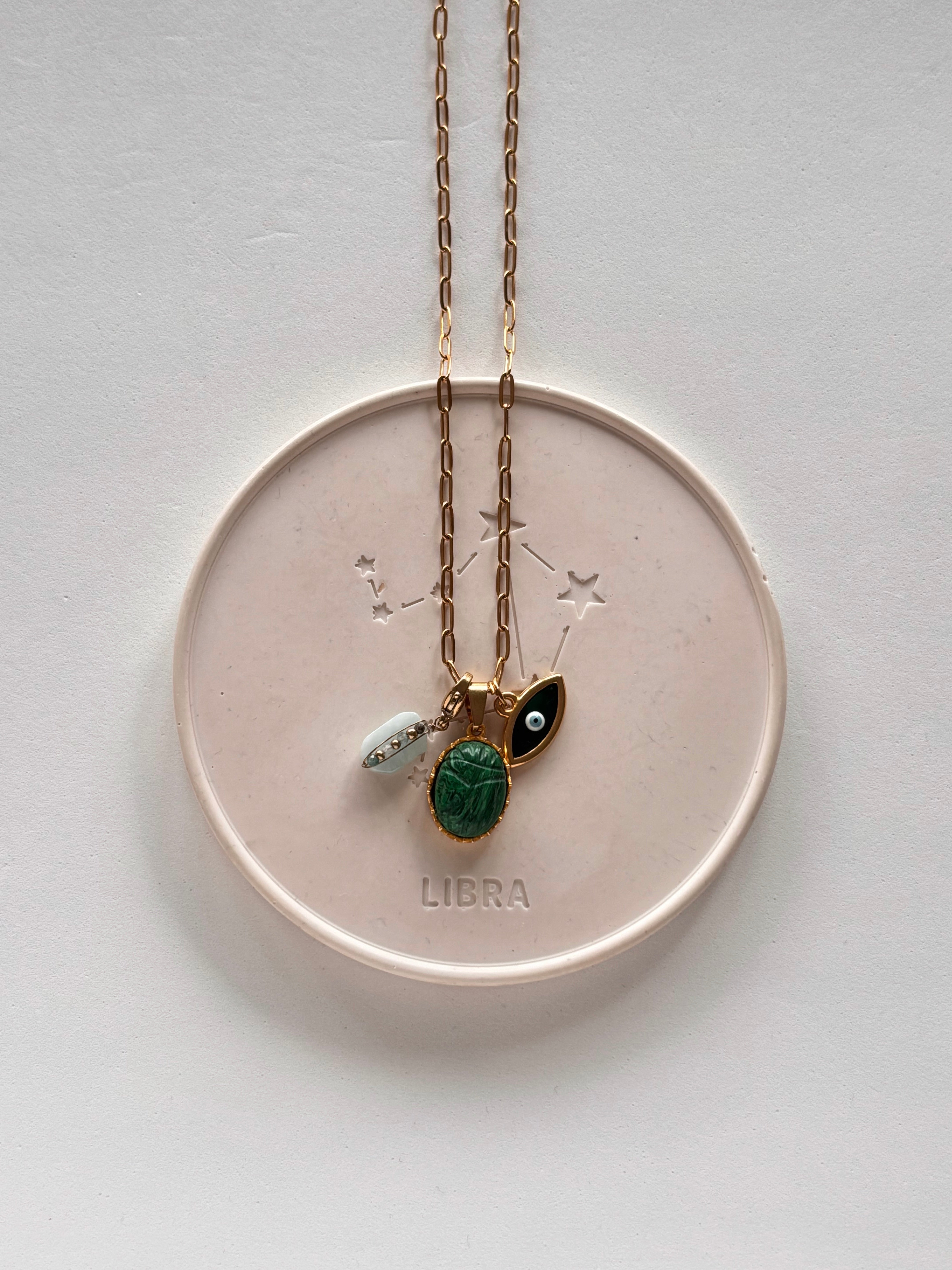 Collana Amuleto composta da Scarabeo in Agata indiana incastonato in argento 925 bagno oro, simbolo di rinascita, un Occhio Greco portafortuna e dettaglio pietruzza con perline in tono decorative (rimovibile).