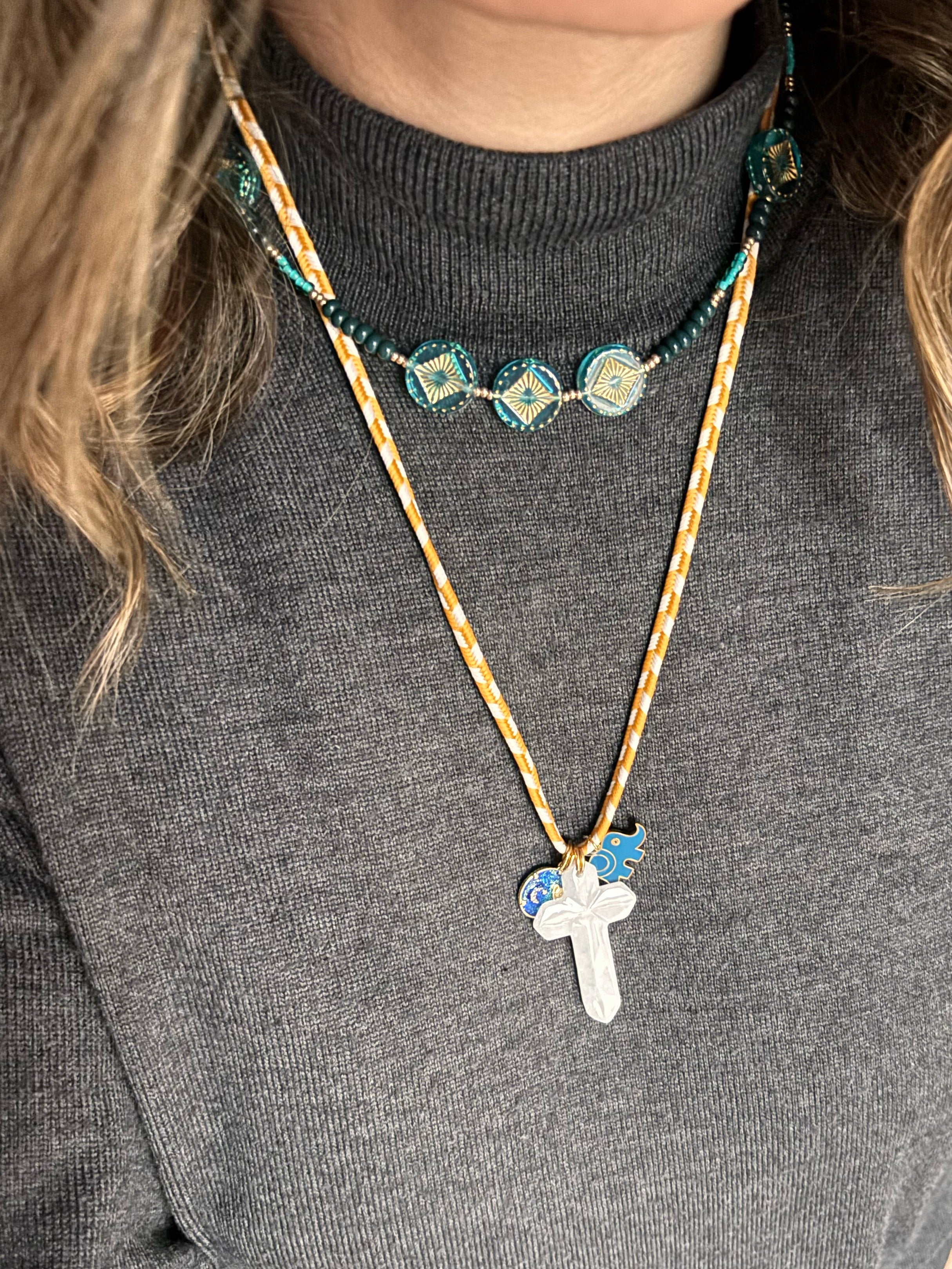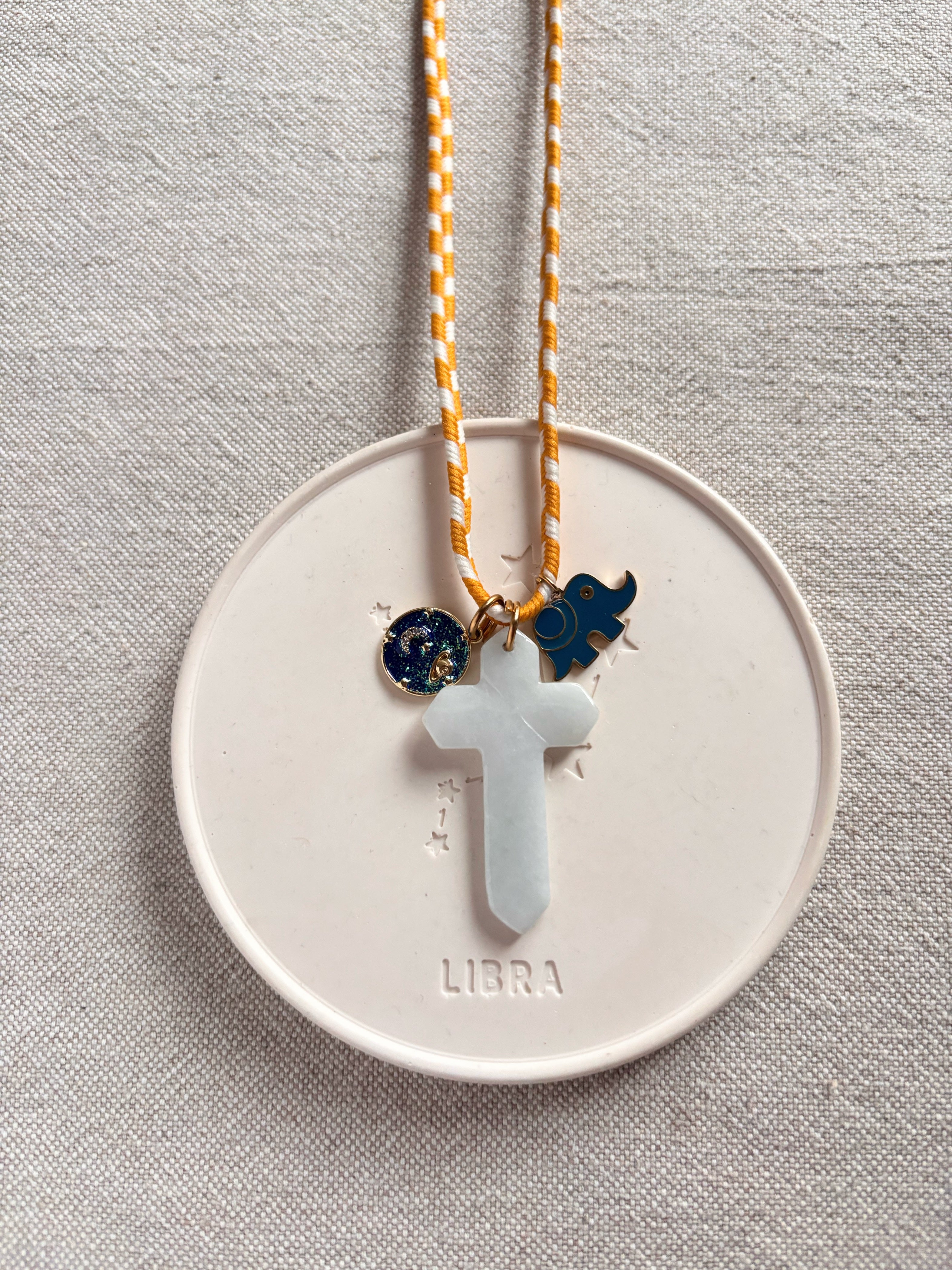 Collana Boho dal esotico e retrò, grazie al nastrino in cotone bicolore scovato in una merceria d’epoca parigina e ai charms che la compongono: una croce in Agata naturale, pietra dell’equilibrio e dell’armonia, l’elefantino animale totem portatore di saggezza e la medaglietta leggermente glitterata a tema astrale.