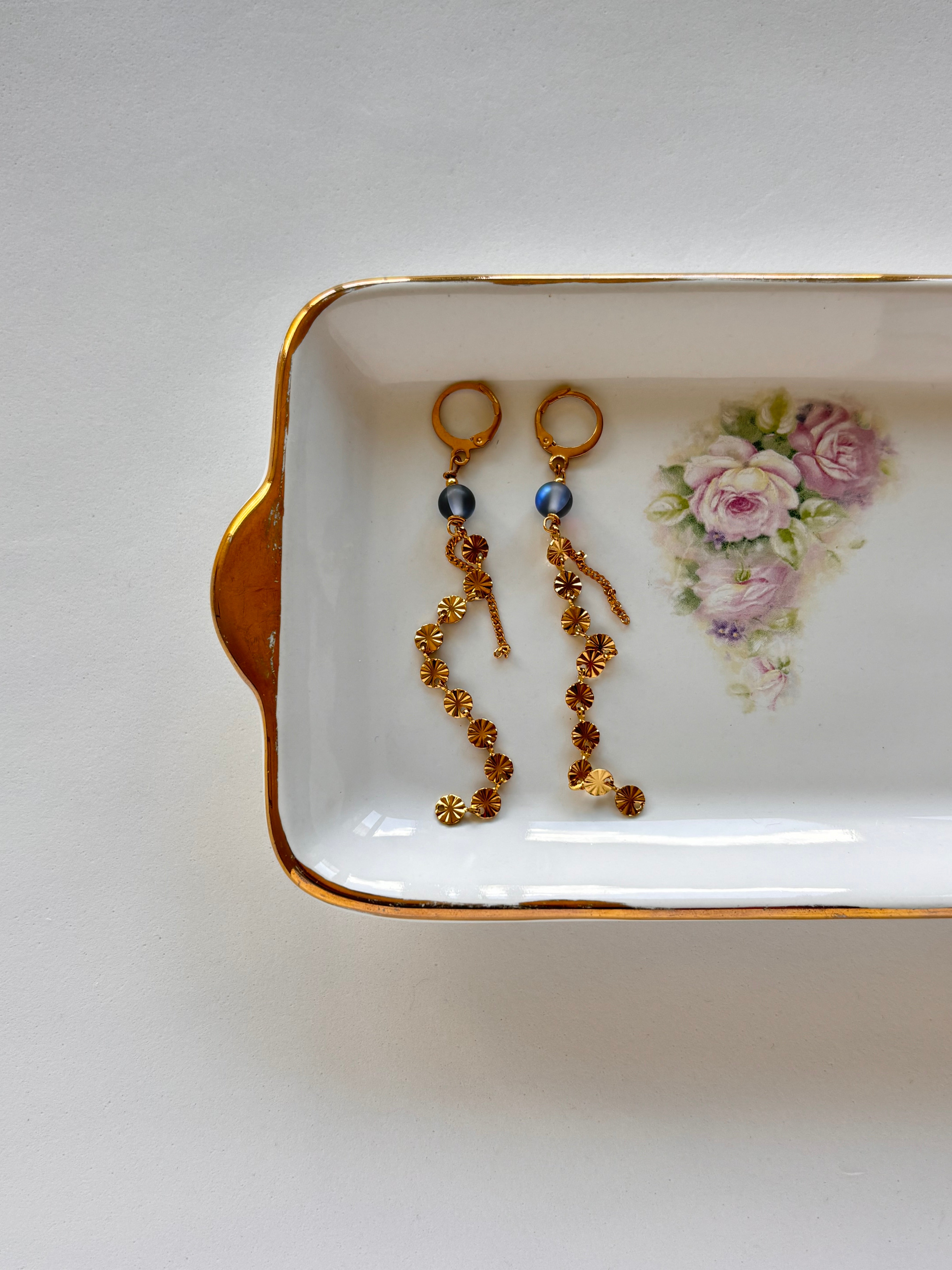 Coppia di orecchini con cerchietto in acciaio inossidabile, catenelle in tono e perlina effetto pietra di Luna.