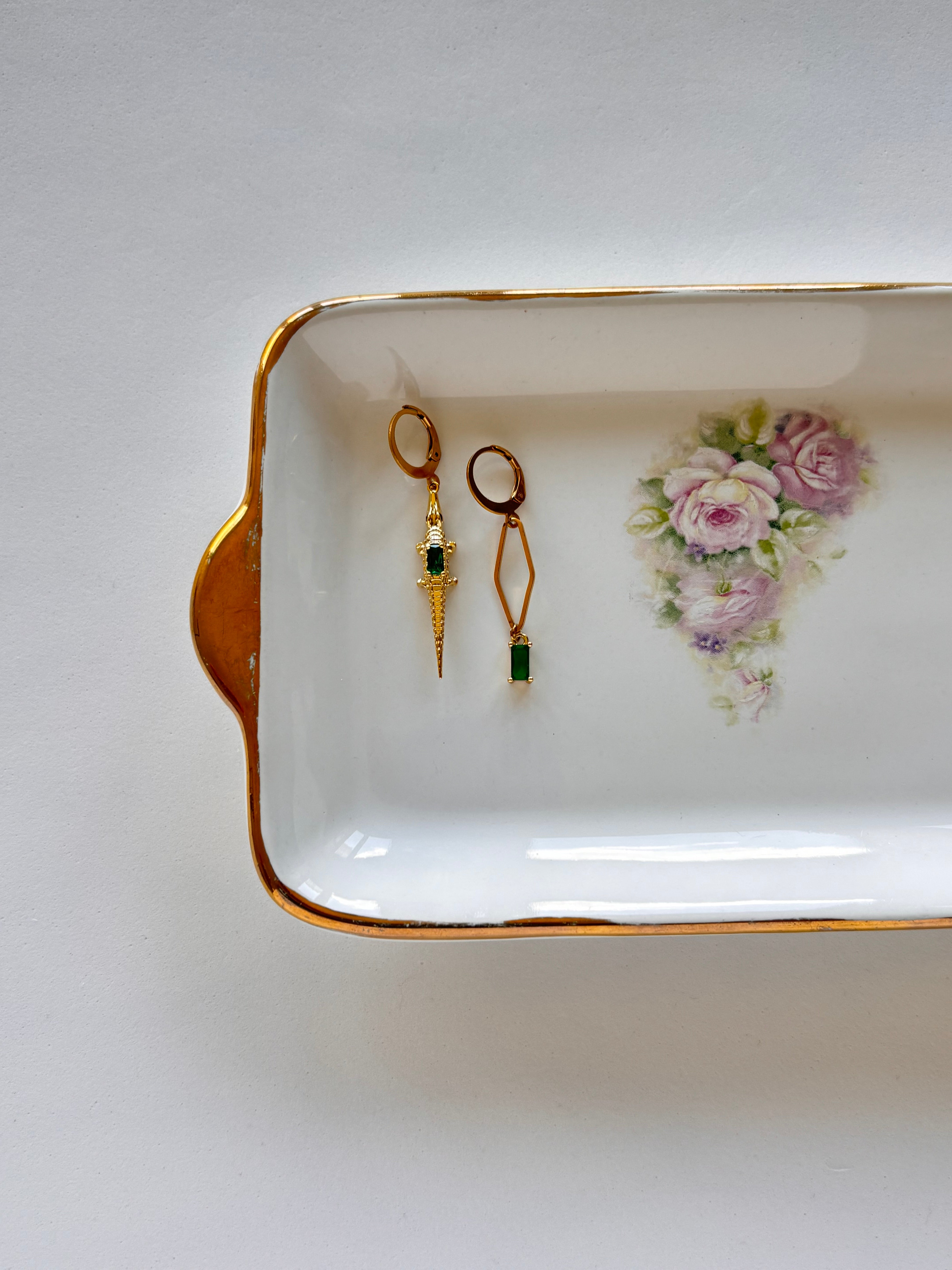 Coppia di orecchini asimmetrica, suo toni del verde smeraldo, composta da cristallo sfaccettato e piccolo coccodrillo in tono.