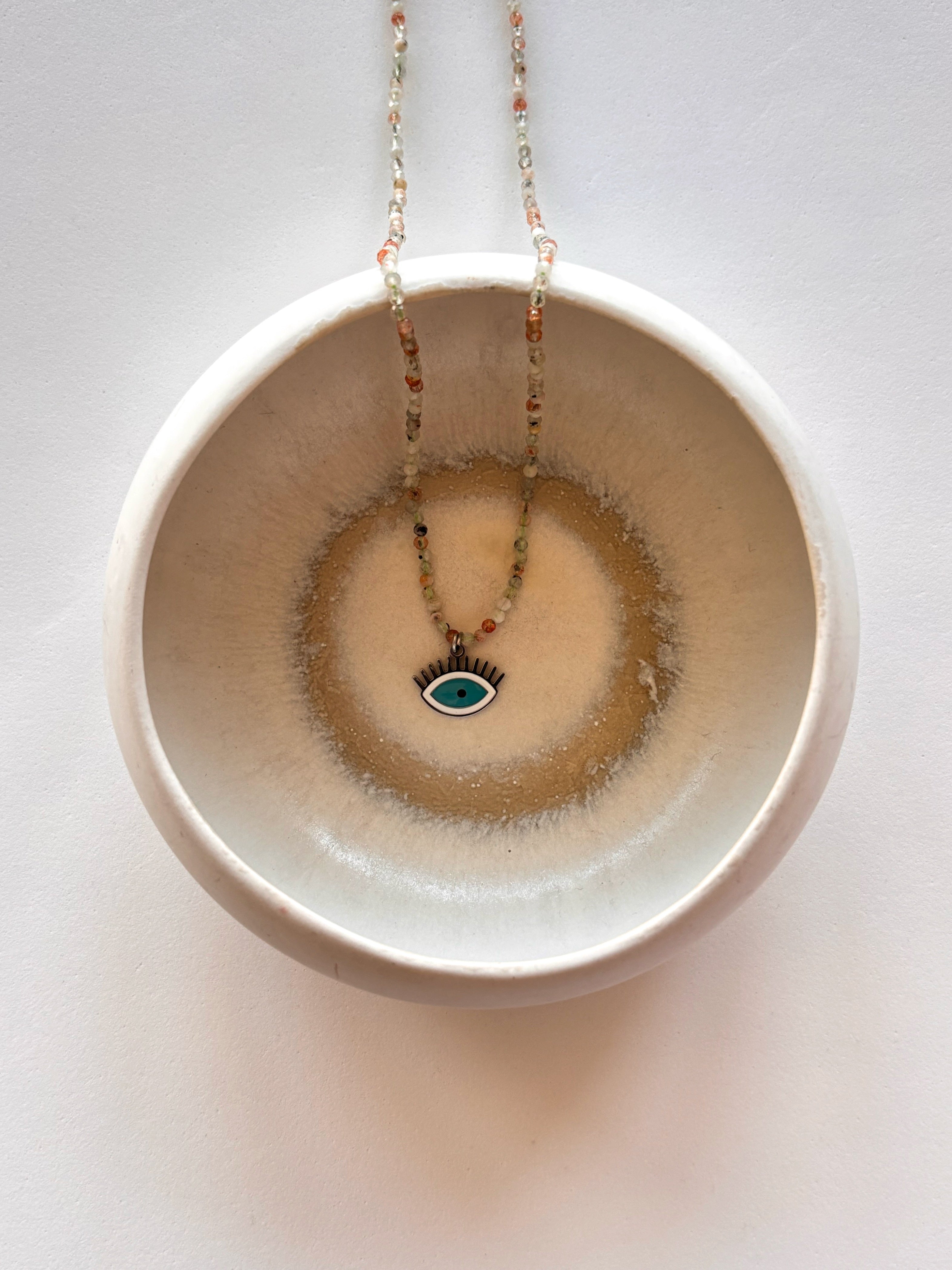 Una sequenza di piccoli cristalli sfaccettai e un’Occhio Greco smaltato al centro di questo girocollo dai toni neutri e delicati.