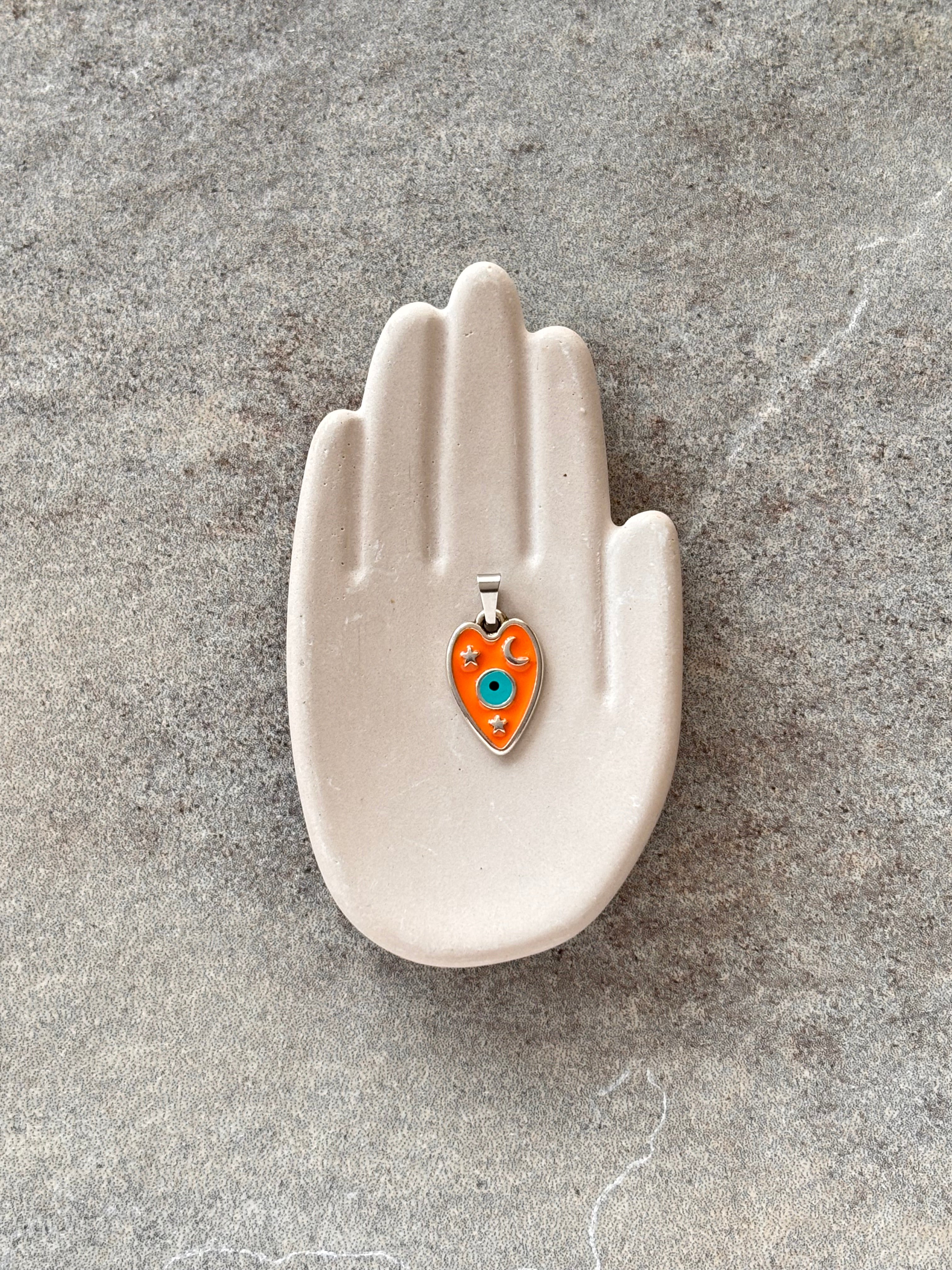Medaglietta colorata e smaltata, con l’Occhio Greco portafortuna come protagonista, su base in zama.