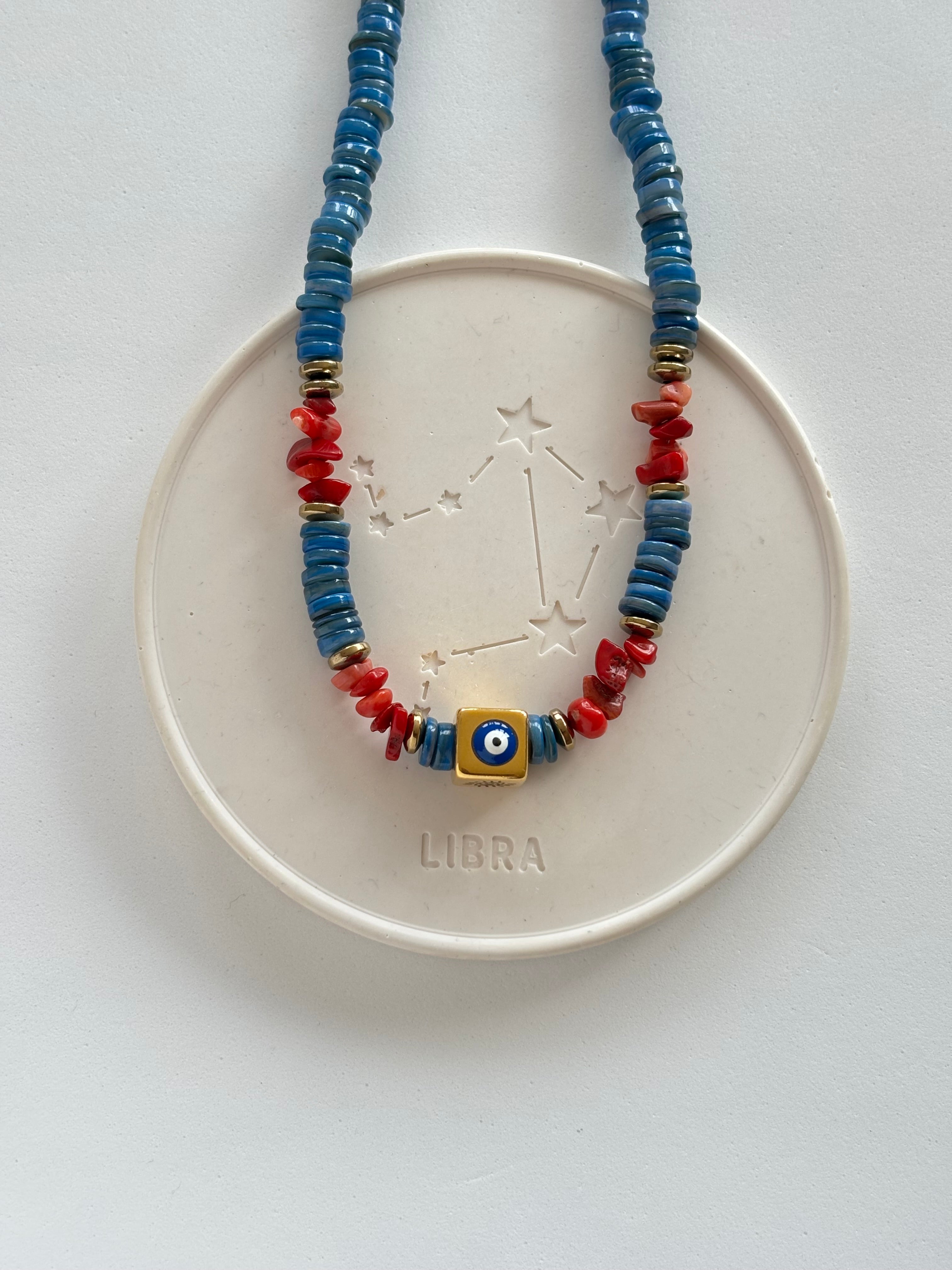 Gioiello in rondelle di conchiglia, chips effetto corallo e dettaglio cubico, con immagini portafortuna smaltate.