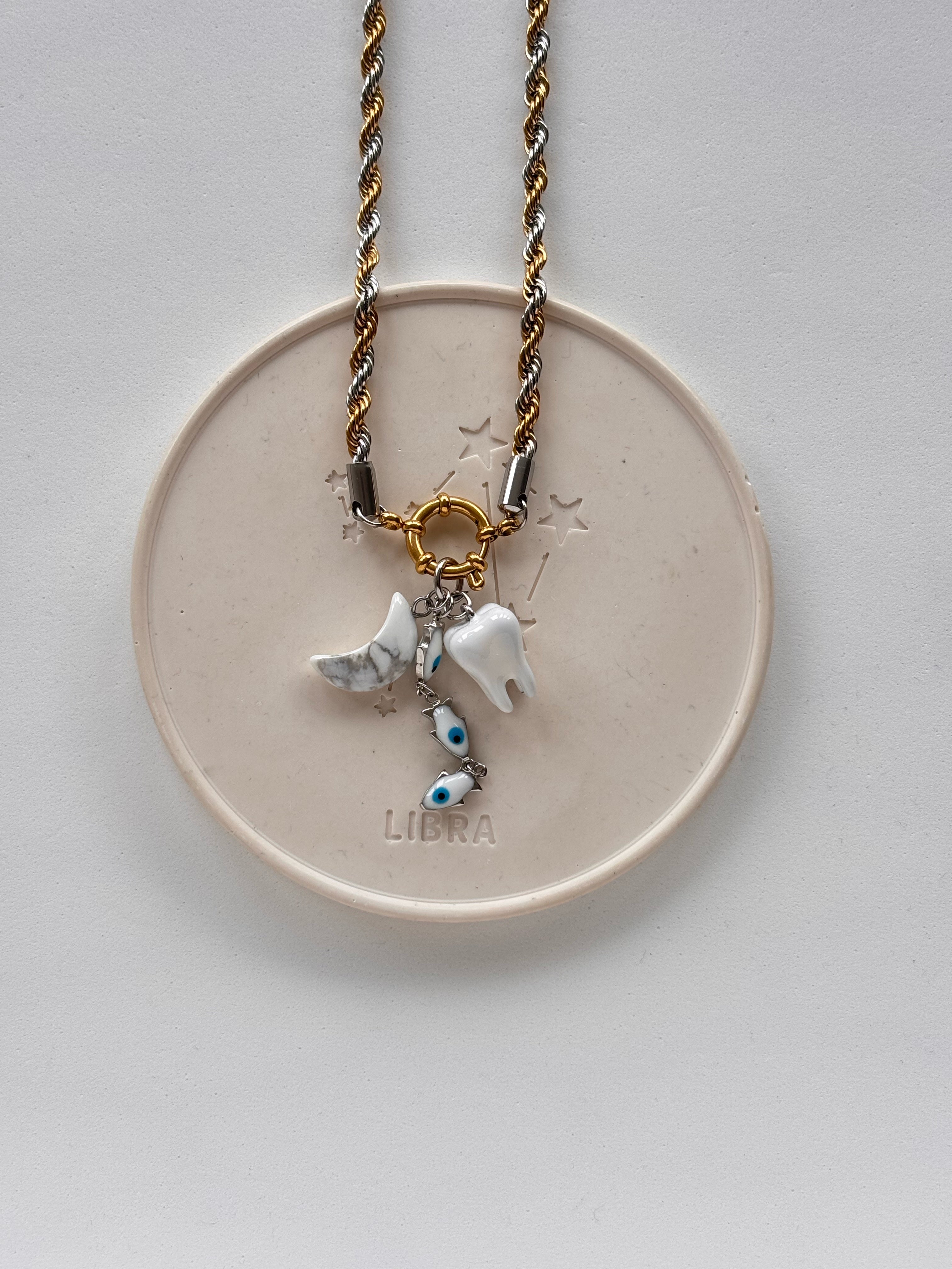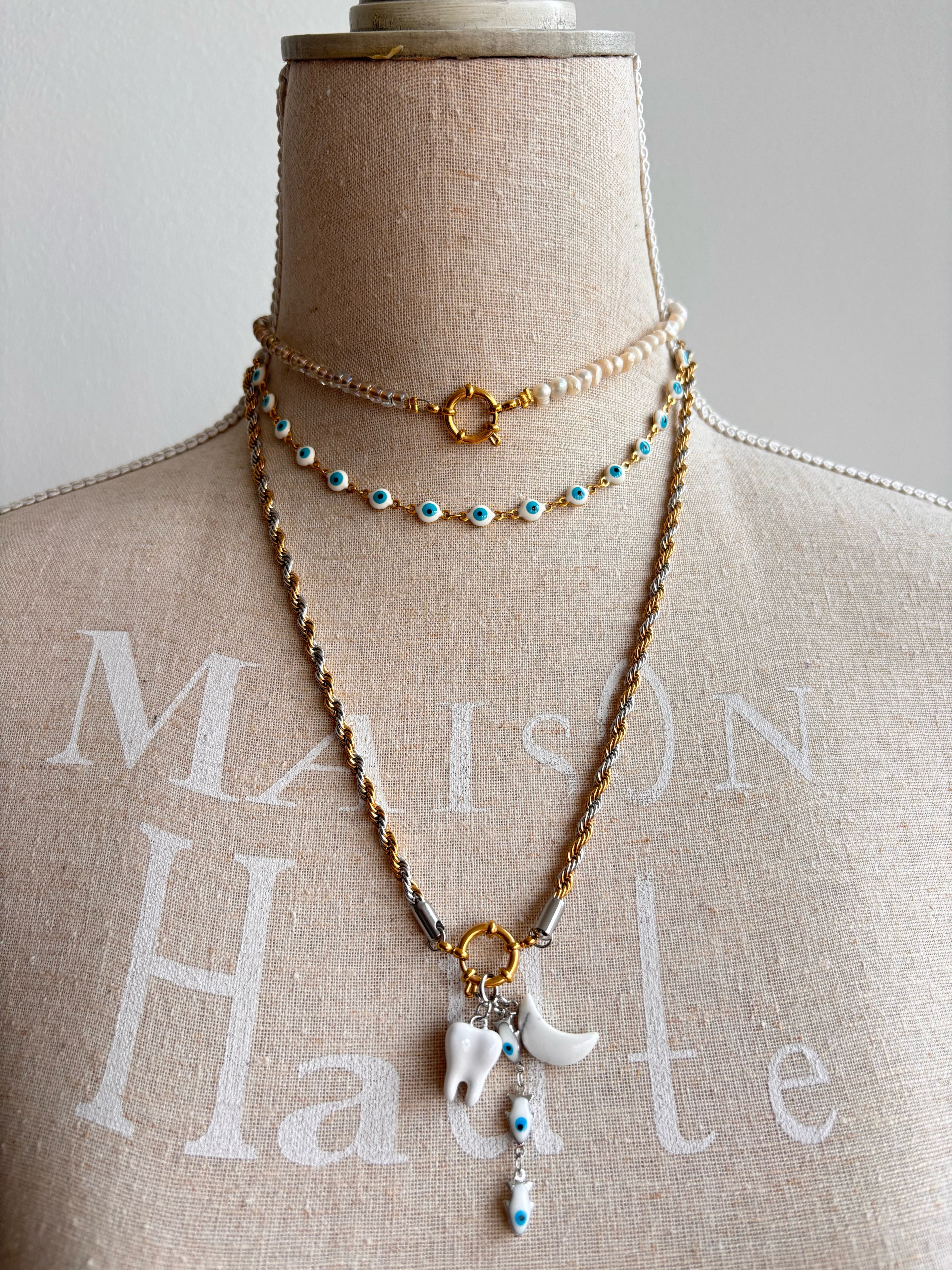 In questo gioiello troviamo una chiusura marinaio al centro sul davanti, che sostiene un mix di charms quali una piccola mezzaluna effetto marmo, una catenella con Occhio Greco, simbolo portafortuna mediorientale, e dente smaltato.