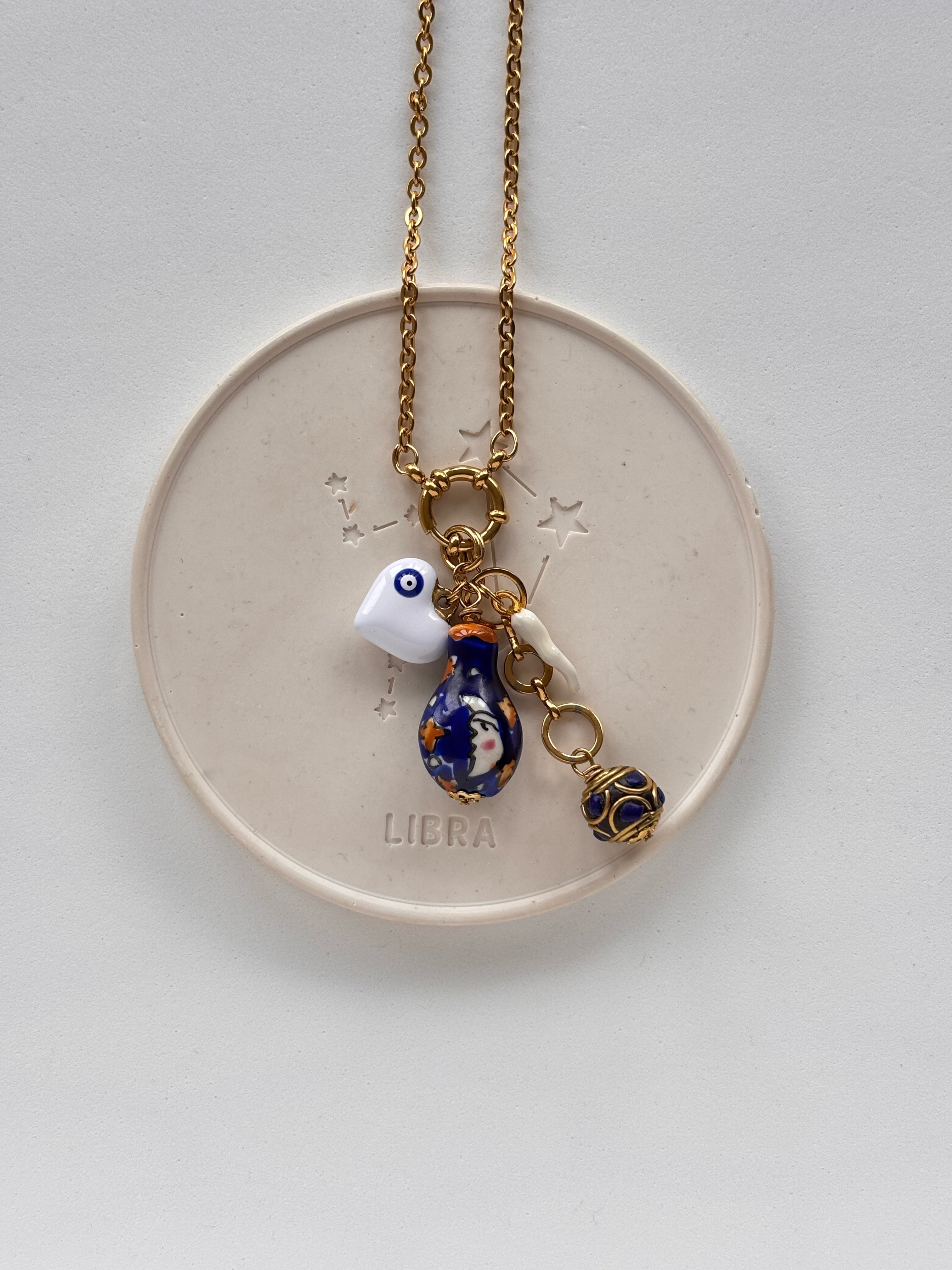 In questo gioiello troviamo una chiusura marinaio al centro sul davanti, che sostiene un mix di charms quali una boccetta a tema astrale in ceramica smaltata, un cornetto ed un cuore smaltati color latte ed una catenella arrotondata.