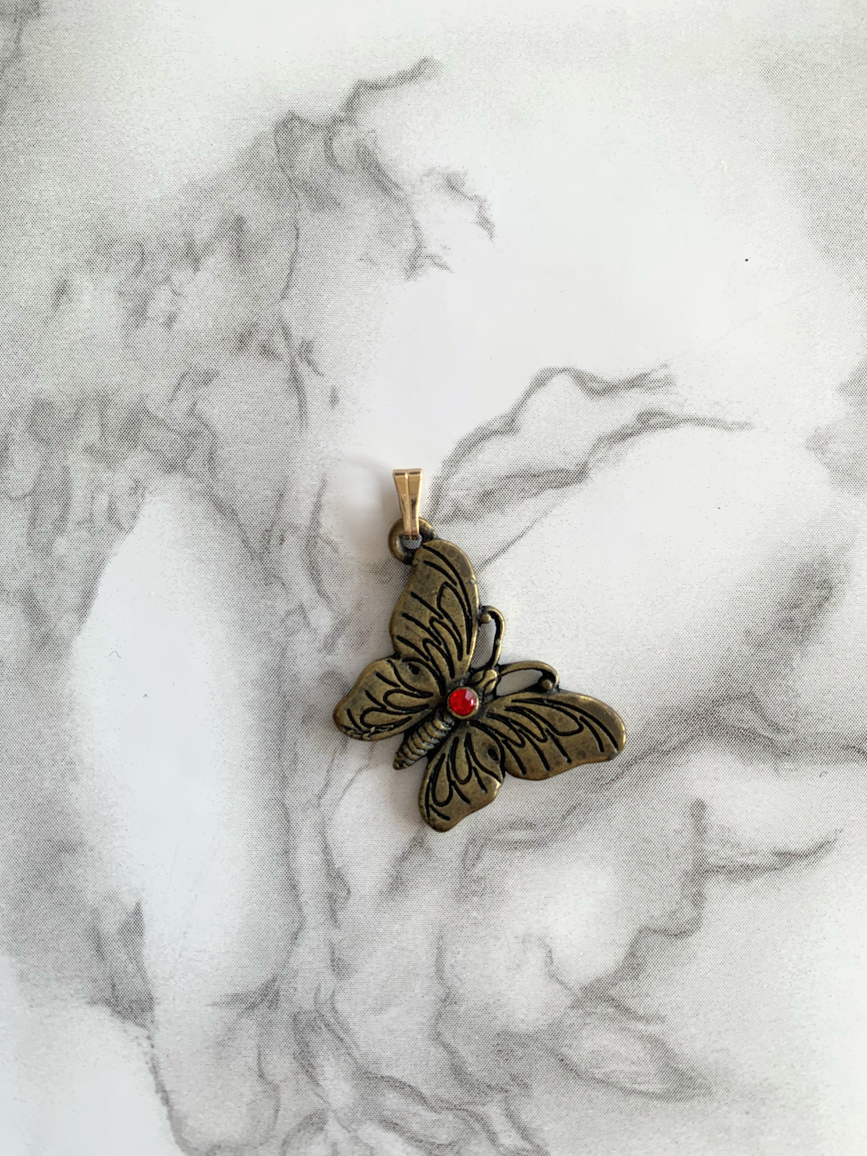 Ciondolo a forma di farfalla in metallo effetto bronzo (di origine Vintage), con zircone rosso al centro. Anellino superiore in metallo.