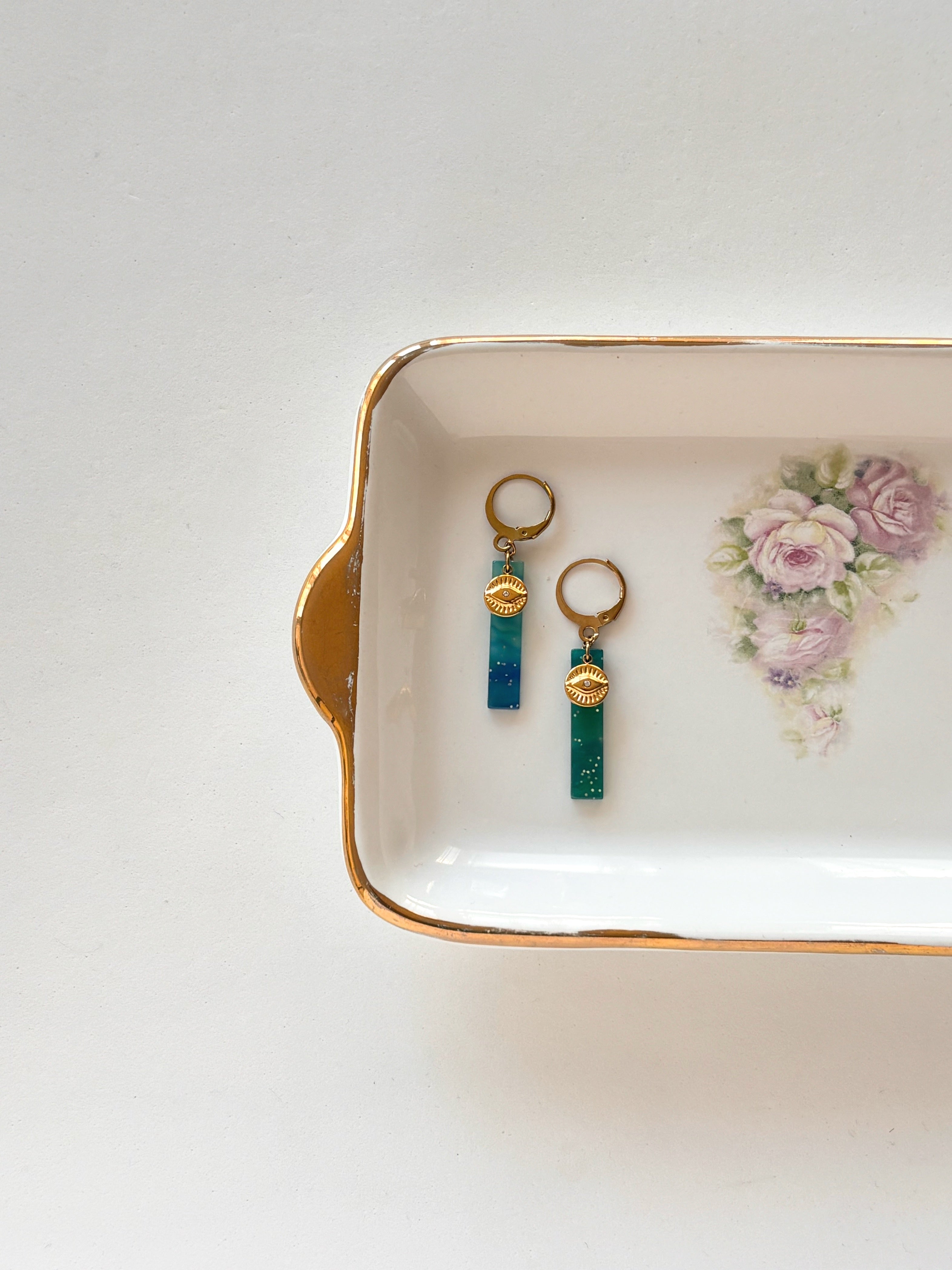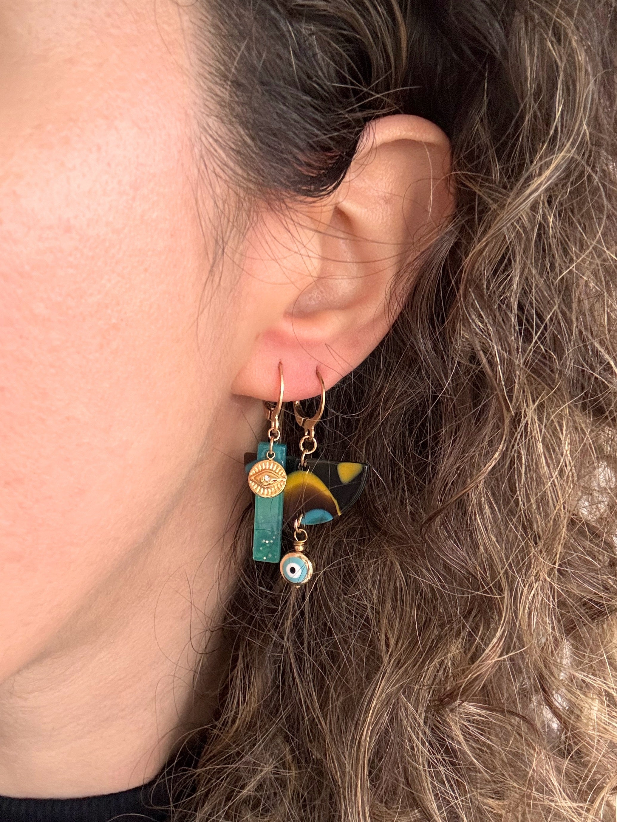 Un charm in plexy leggerissimo e dai toni freschi, arricchito da una piccolo Occhio Greco, simbolo mediorientale portafortuna.