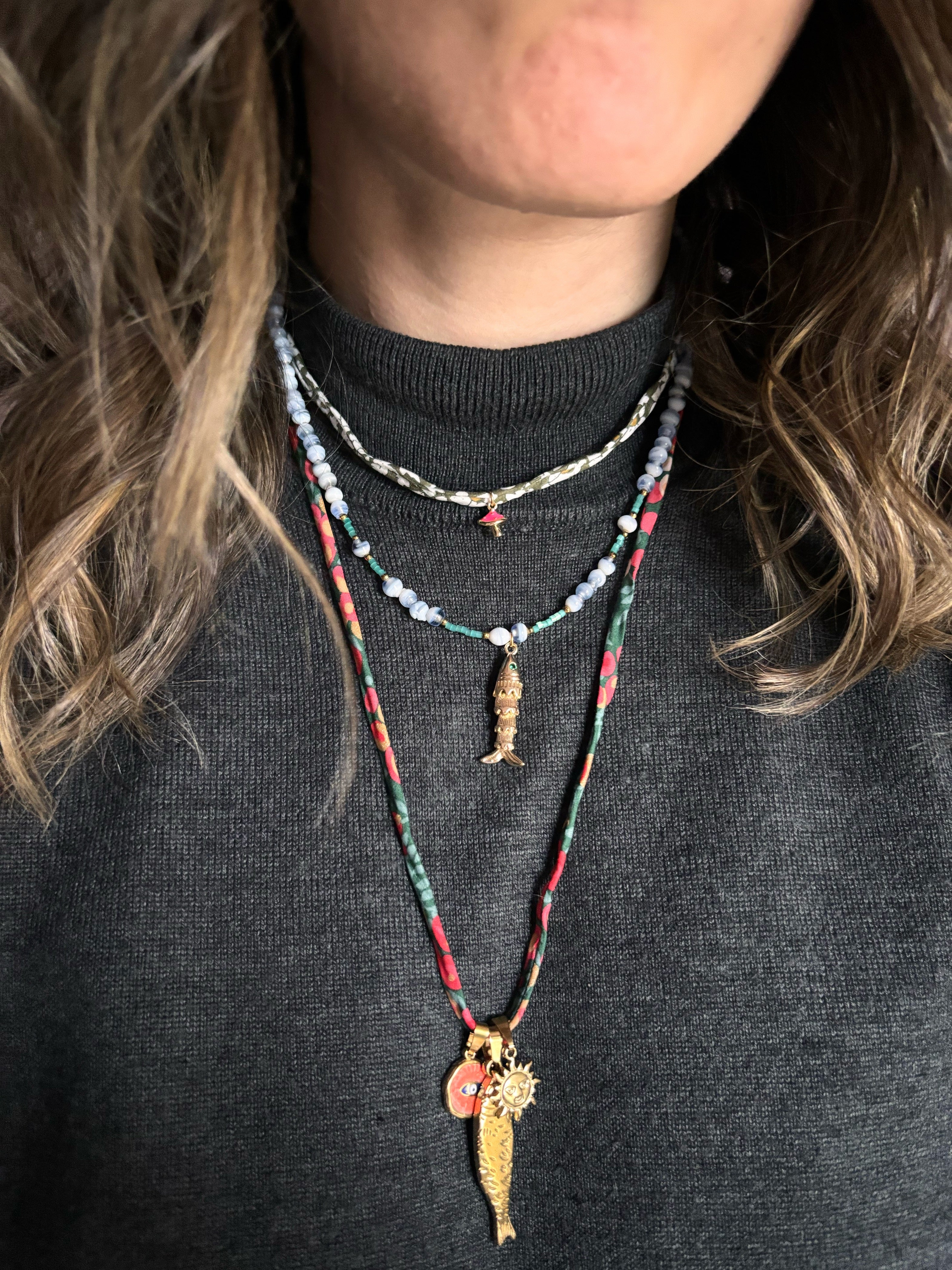 Collana girocollo Boho dal sapore retrò e delicato, grazie al nastrino in cotone in stampa liberty e al piccolo ciondolo funghetto protagonista.