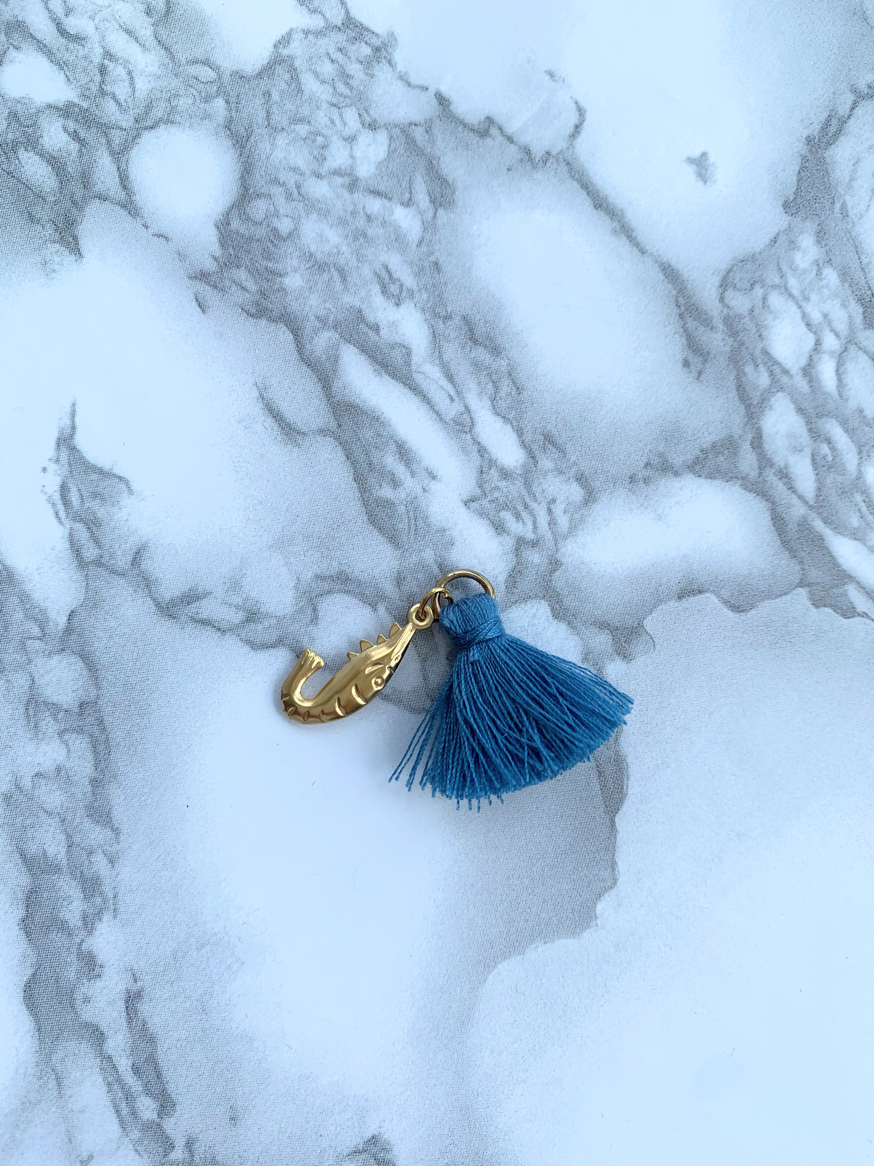 Ciondolo a tema marino, a forma di gamberetto in acciaio inossidabile color oro, nappina color ceruleo ed anellino superiore in tono.